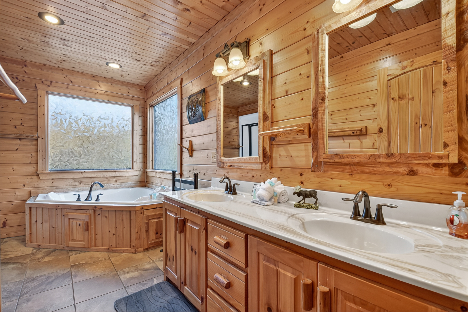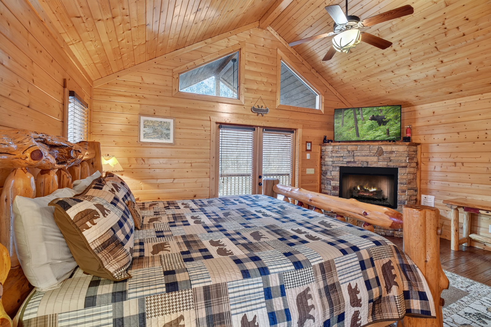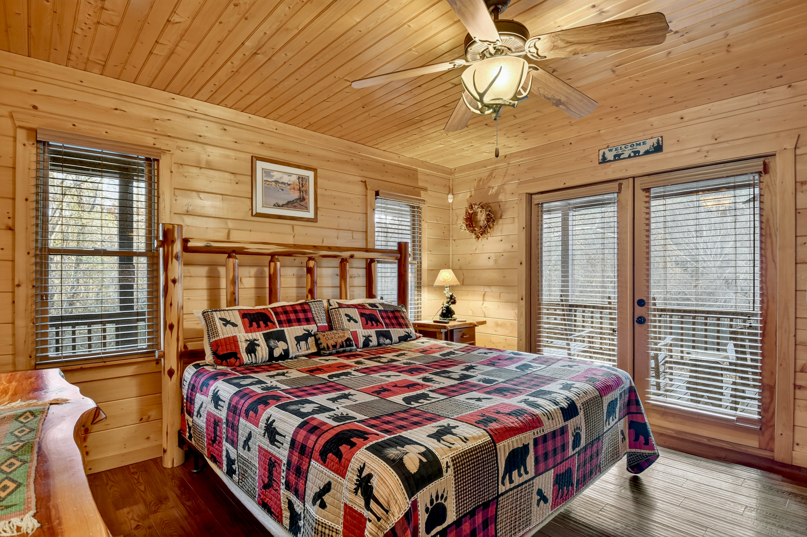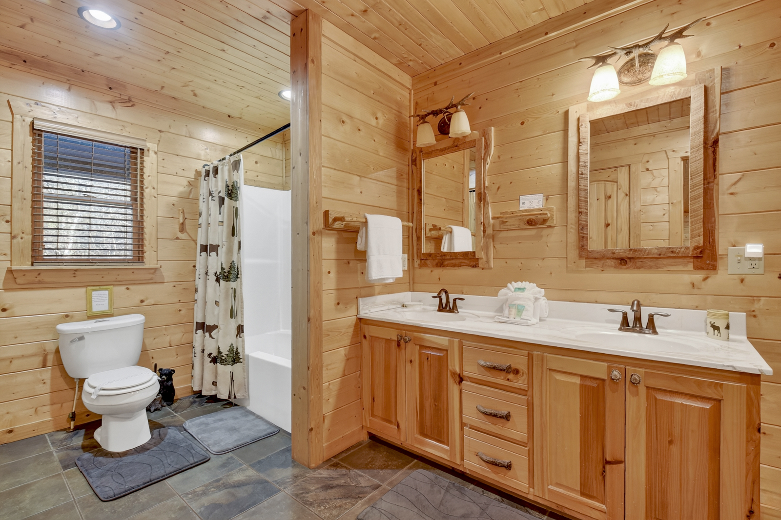 Get ready for sweet dreams on your mountain retreat at this beautiful 5-bedroom cabin for up to 10 guests. In the primary suite, you’ll have a plush king-size log bed, stacked stone fireplace, TV, and private balcony with rockers overlooking the treetops and rippling water. From fireside cuddles with your partner to downtime in the fresh mountain air, this suite beckons. Did we mention there’s a private bathroom with a dual vanity, walk-in shower, and jetted tub for spa baths?
