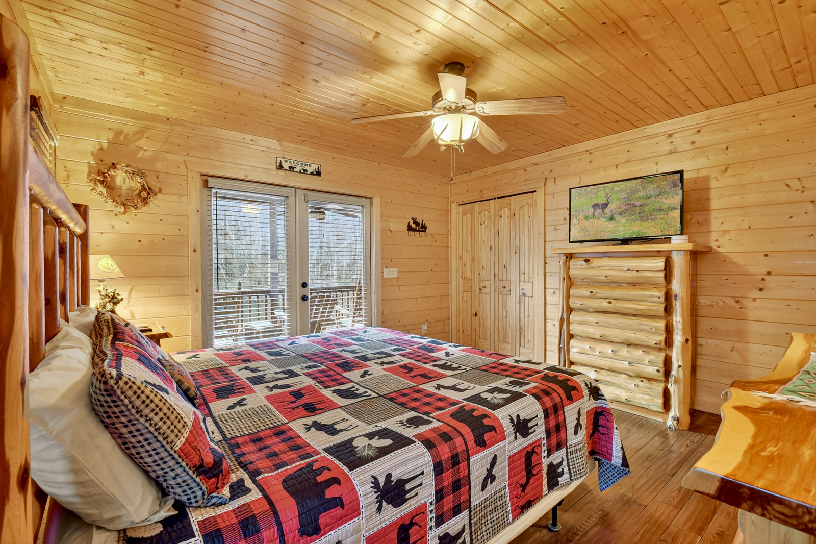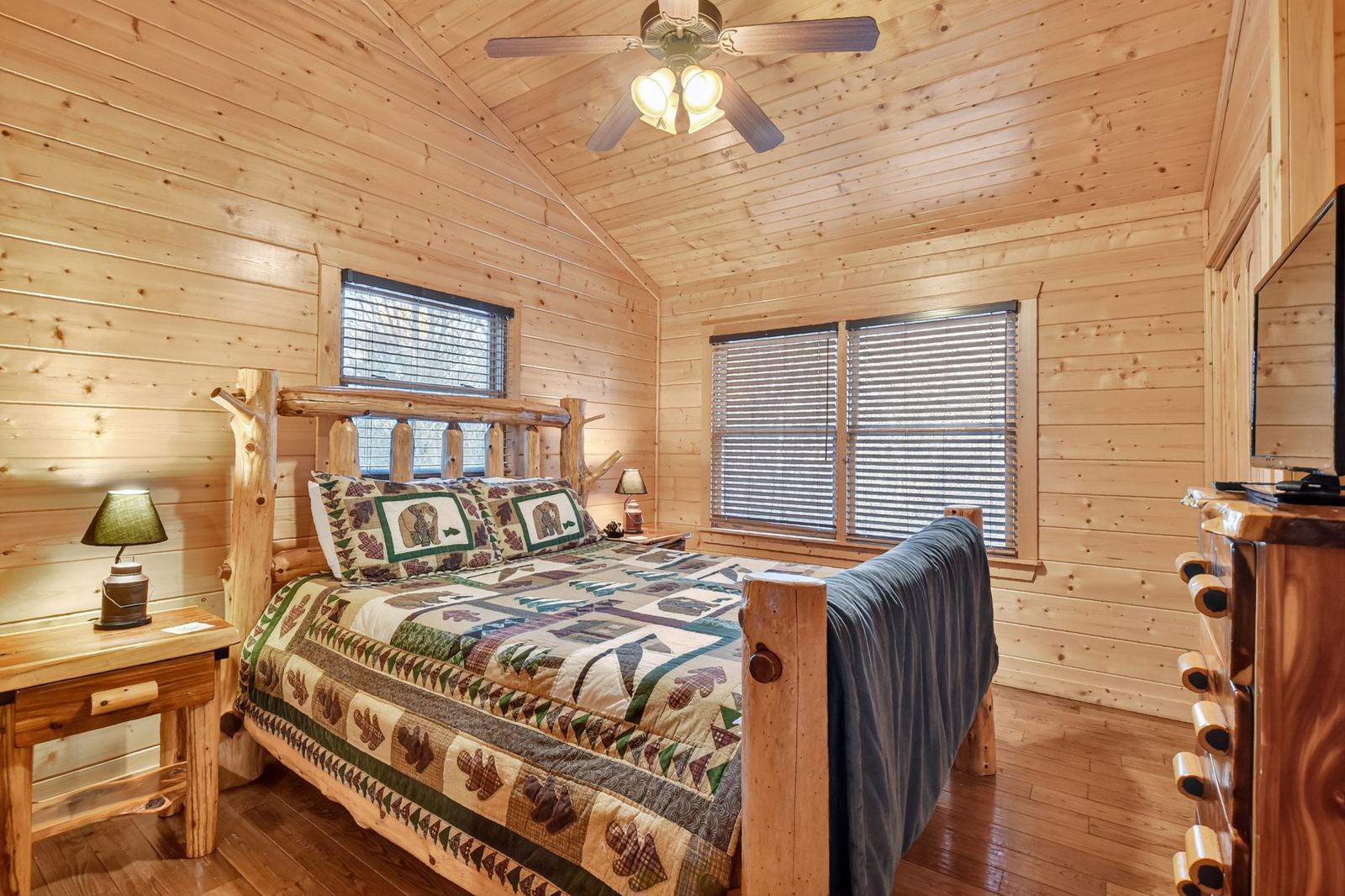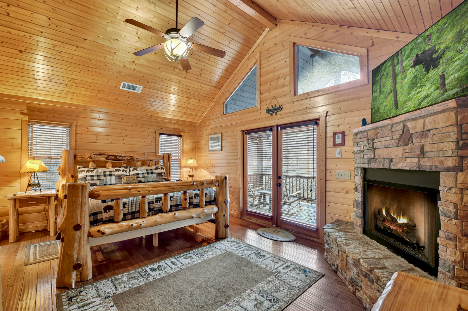 Get ready for sweet dreams on your mountain retreat at this beautiful 5-bedroom cabin for up to 10 guests. In the primary suite, you’ll have a plush king-size log bed, stacked stone fireplace, TV, and private balcony with rockers overlooking the treetops and rippling water. From fireside cuddles with your partner to downtime in the fresh mountain air, this suite beckons. Did we mention there’s a private bathroom with a dual vanity, walk-in shower, and jetted tub for spa baths?