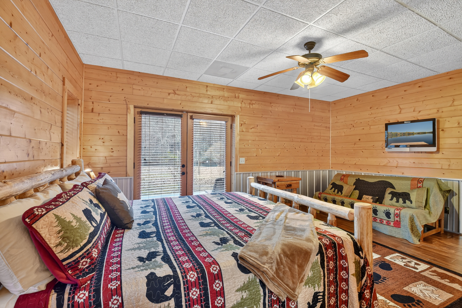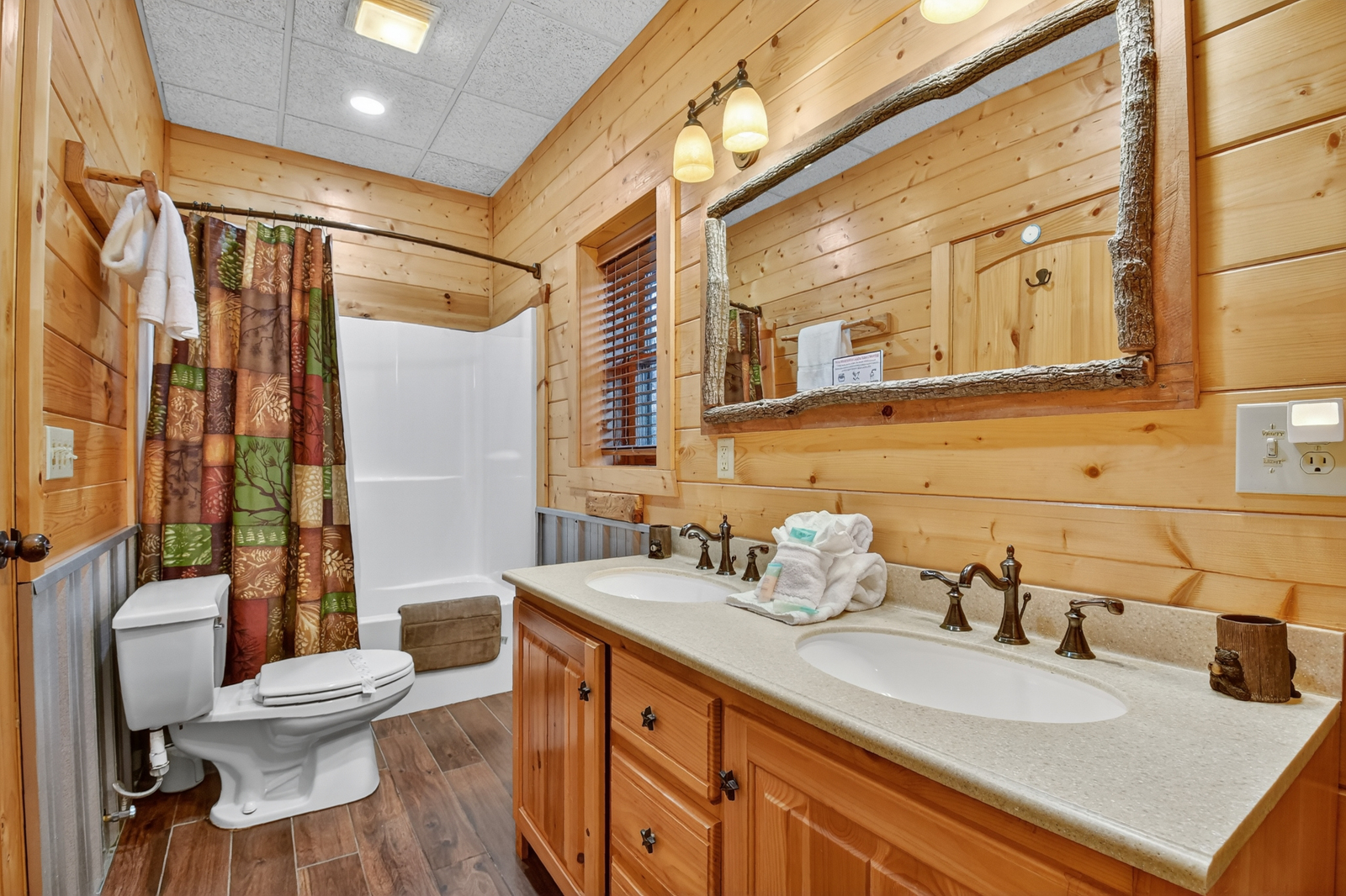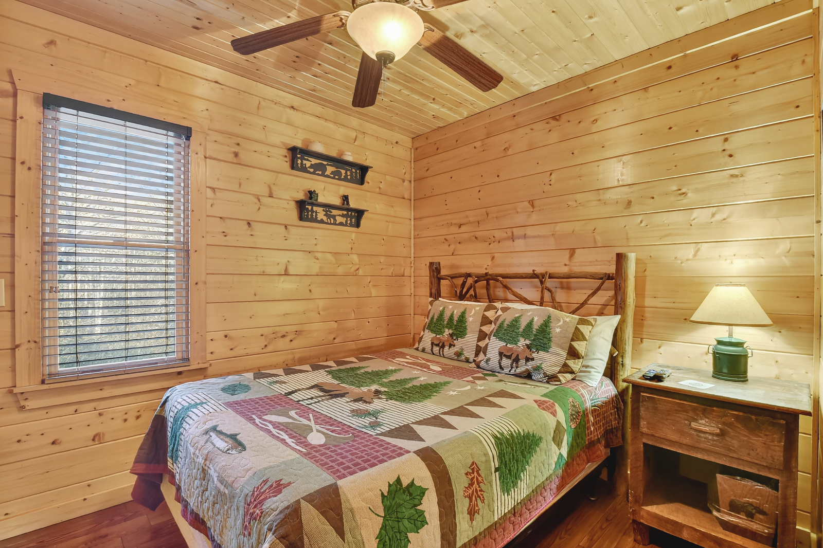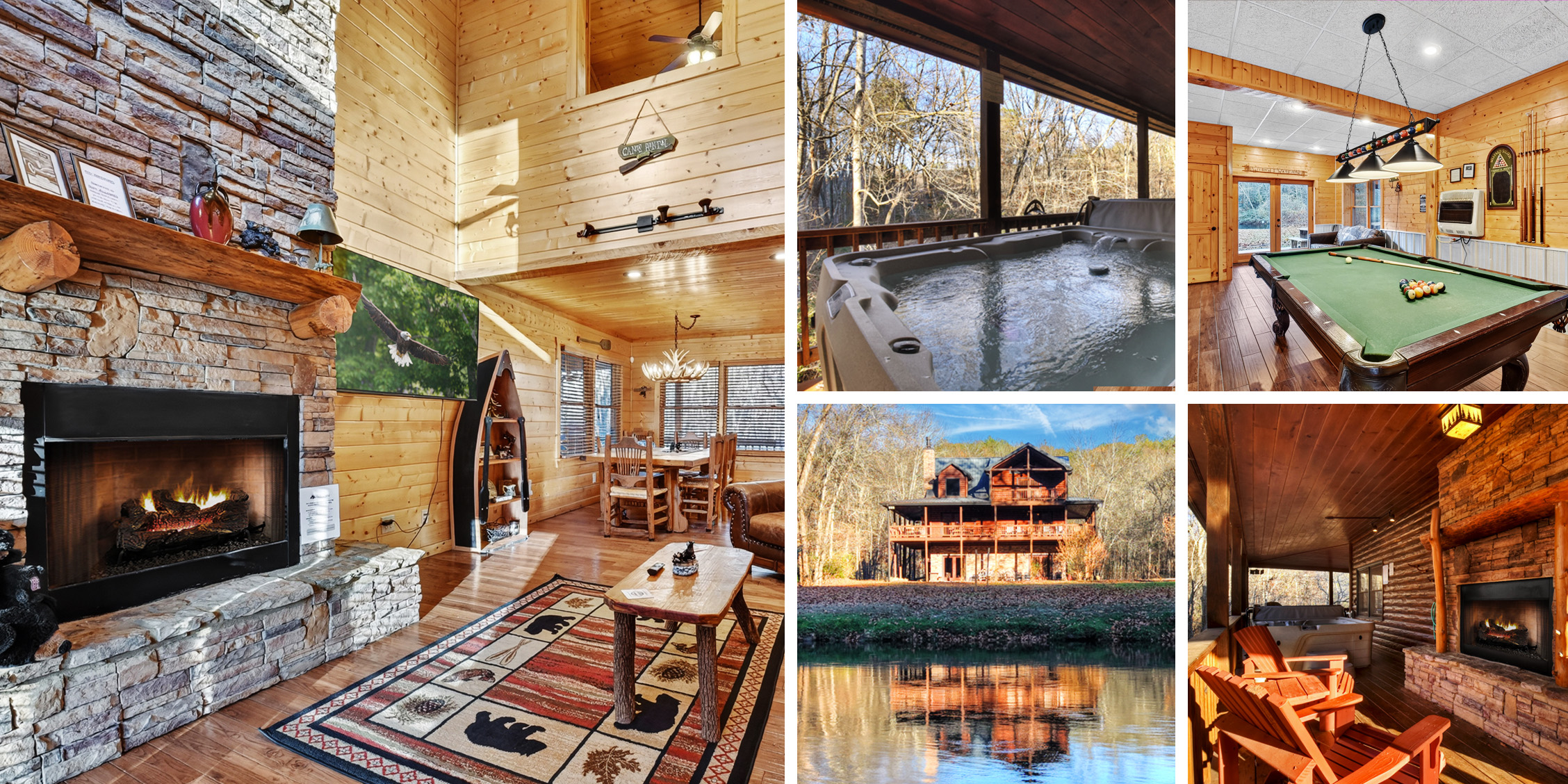 Get ready for sweet dreams on your mountain retreat at this beautiful 5-bedroom cabin for up to 10 guests. In the primary suite, you’ll have a plush king-size log bed, stacked stone fireplace, TV, and private balcony with rockers overlooking the treetops and rippling water. From fireside cuddles with your partner to downtime in the fresh mountain air, this suite beckons. Did we mention there’s a private bathroom with a dual vanity, walk-in shower, and jetted tub for spa baths?
