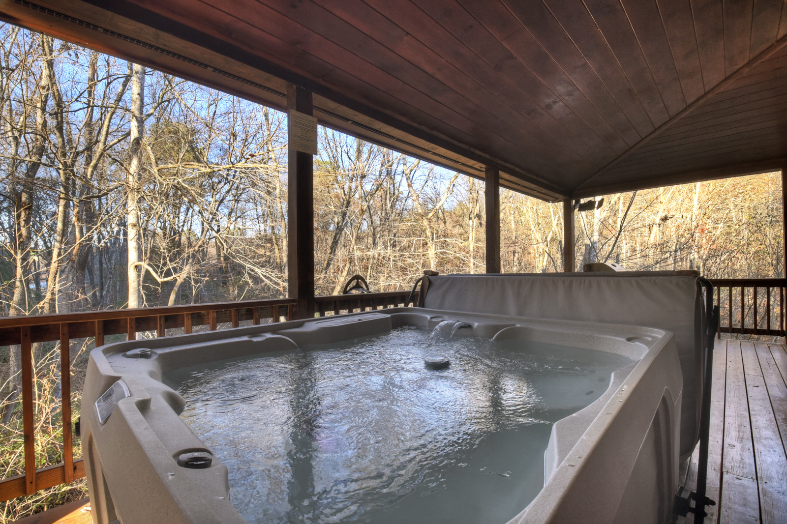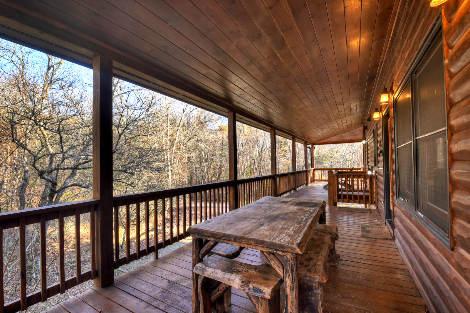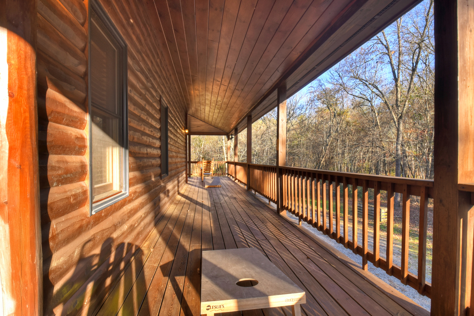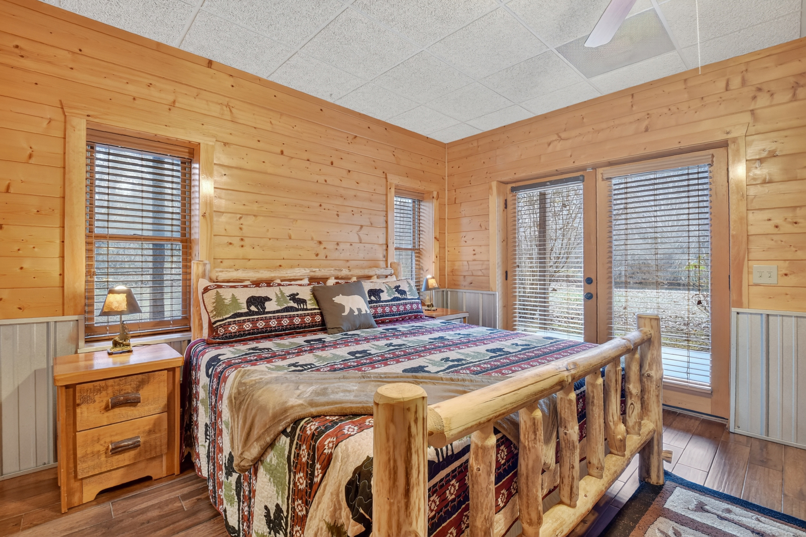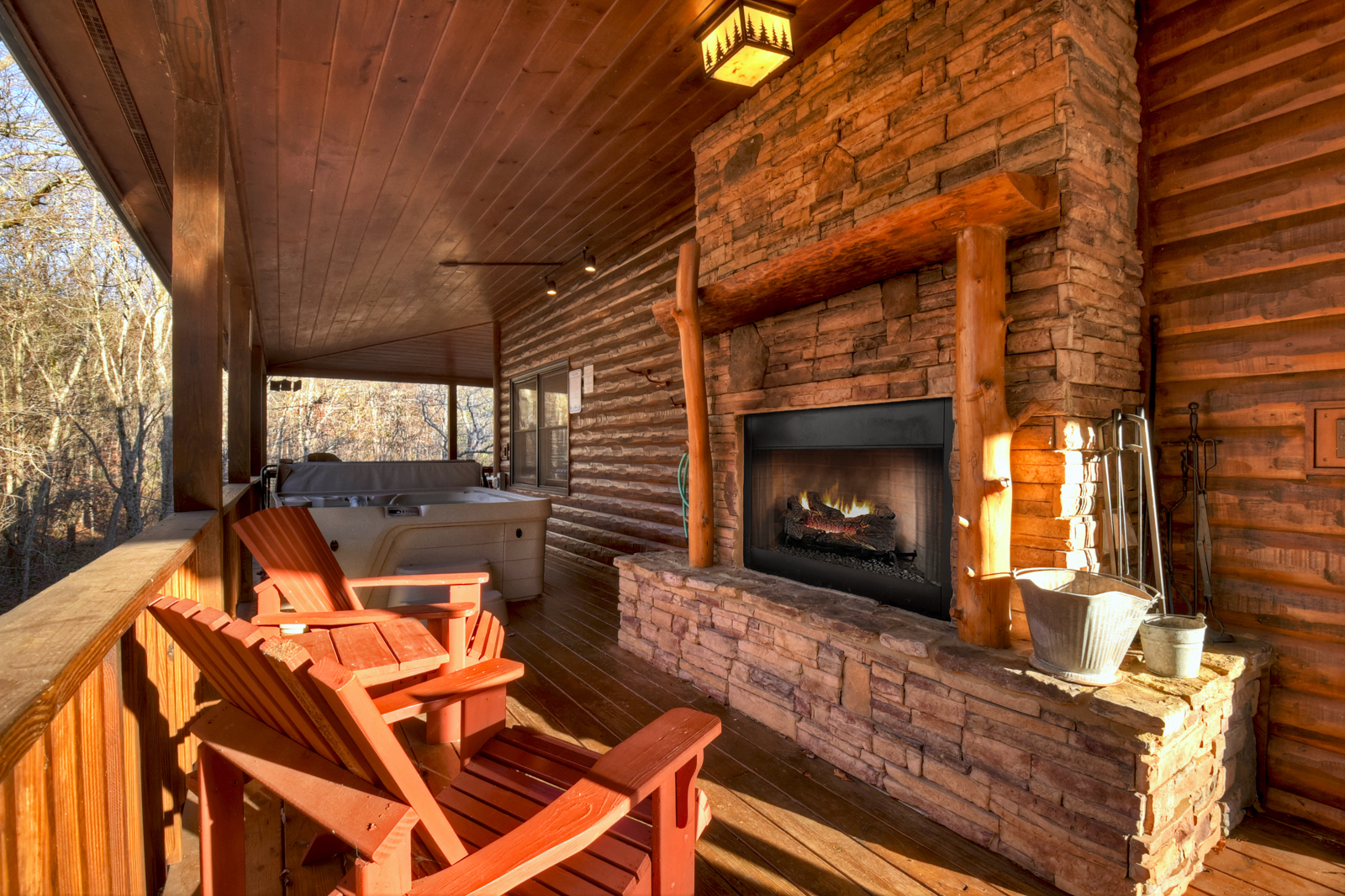 A wraparound deck with rocking chairs offers more space to relax in the fresh air. Light the gas grill for memorable cookouts, enjoyed at the rustic picnic tables. Slip into your swimsuit and kick back in the 6-person hot tub morning, noon, or night. Chat by the crackling outdoor fireplace on cooler evenings. Or play cornhole for more fun!