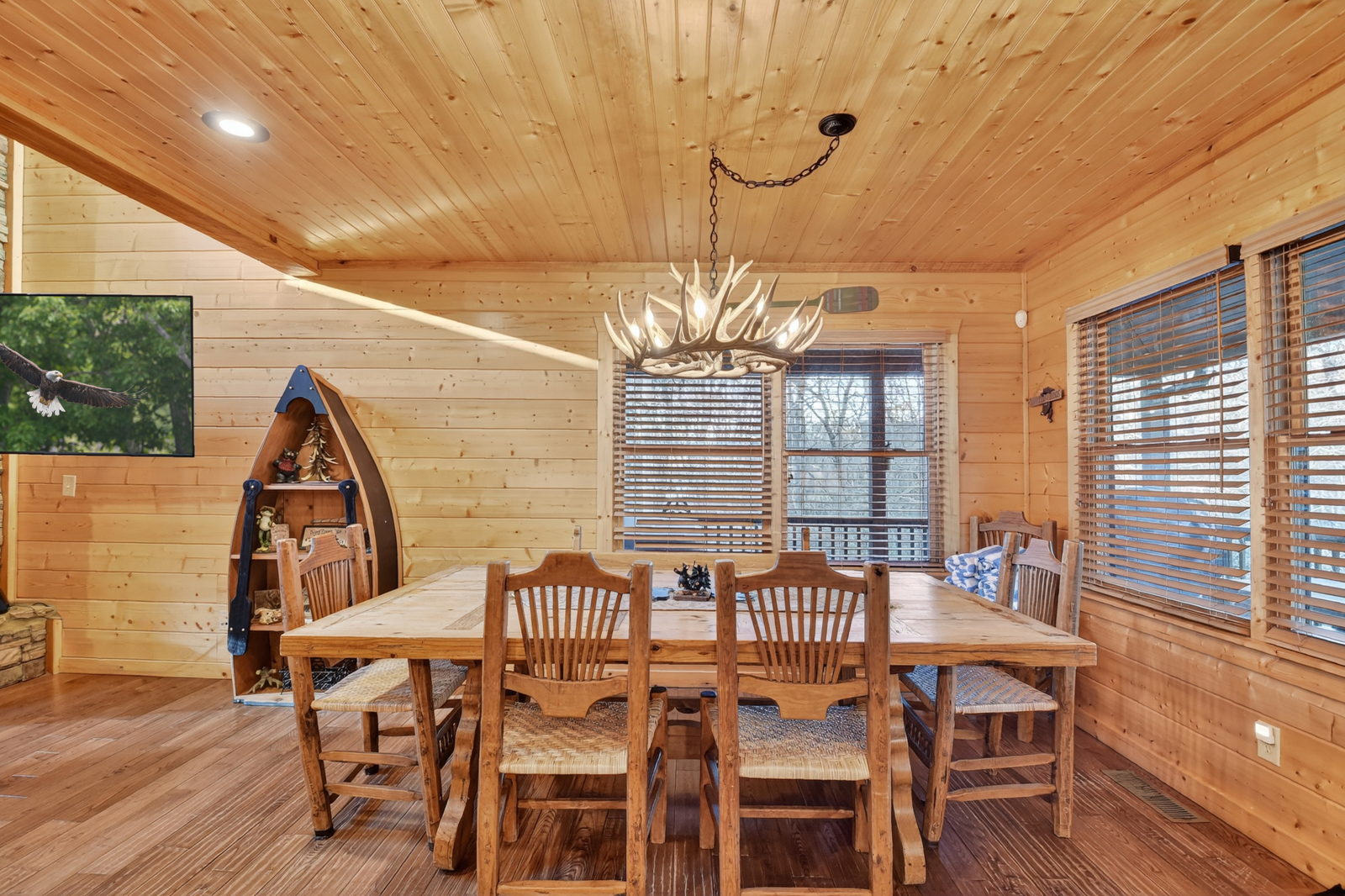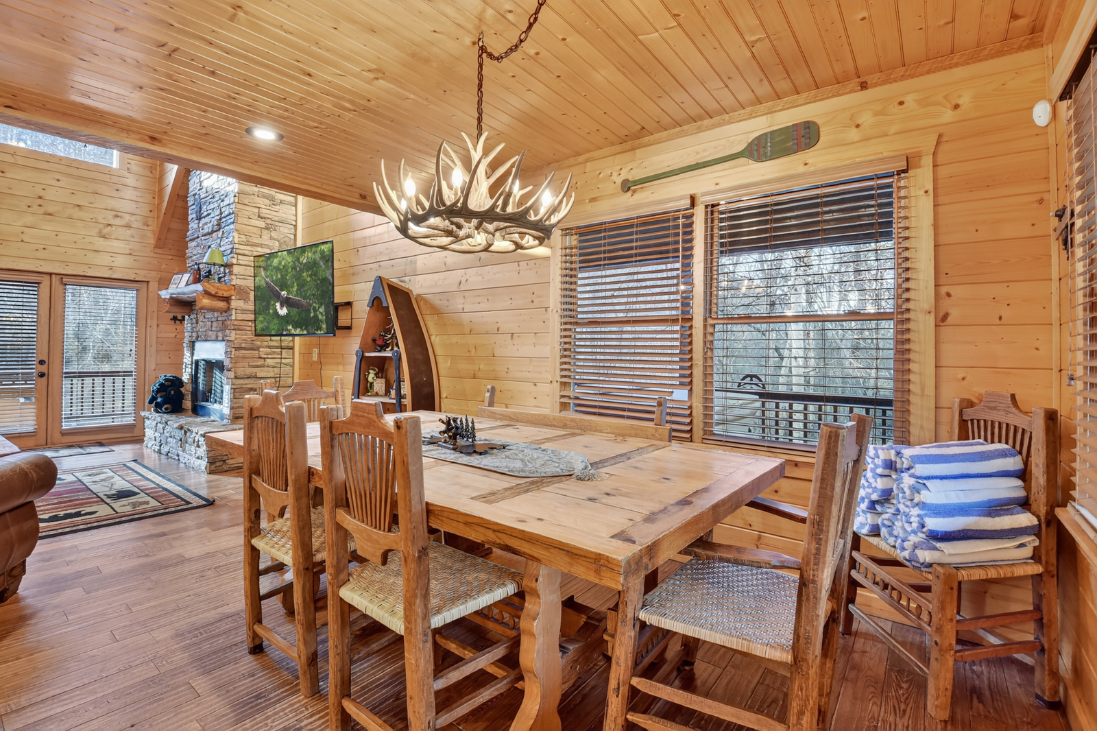 Lovely and inviting, the wood table in the open-concept dining area boasts an antler chandelier overhead, windows framing the trees to elevate your mealtime experience, plus matching chairs and a bench that can seat up to 6 guests. Add the breakfast bar for 4, and you’ll have enough space for a full group to dine together at your mountain lodge.