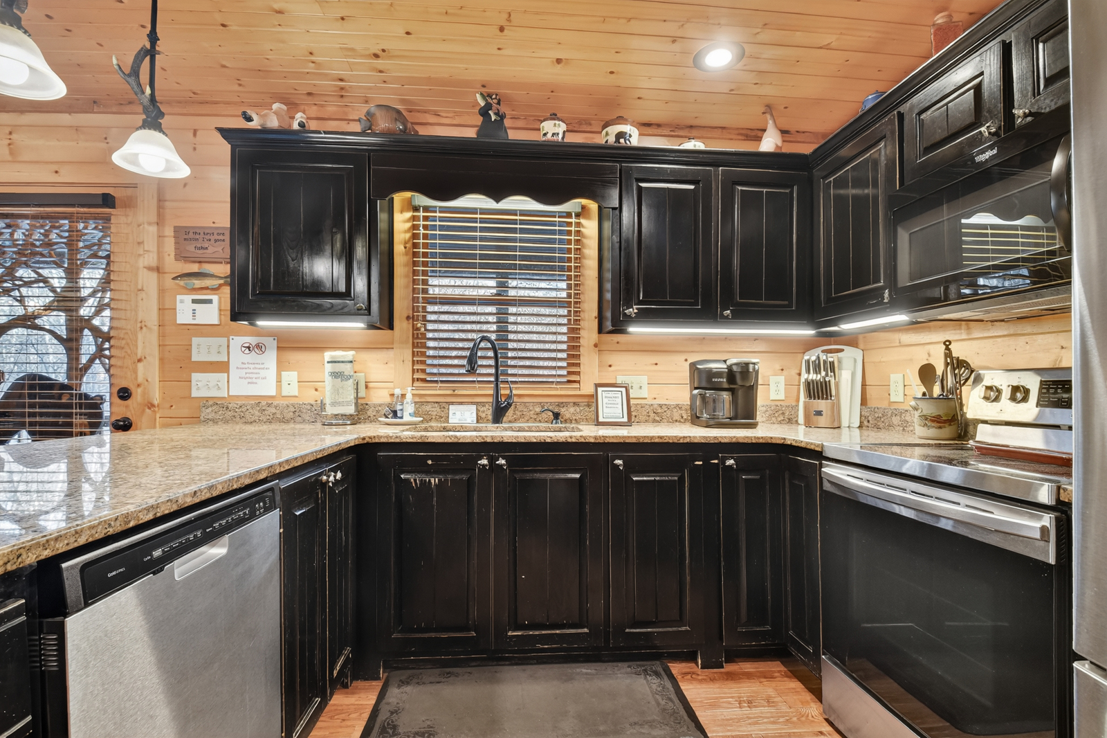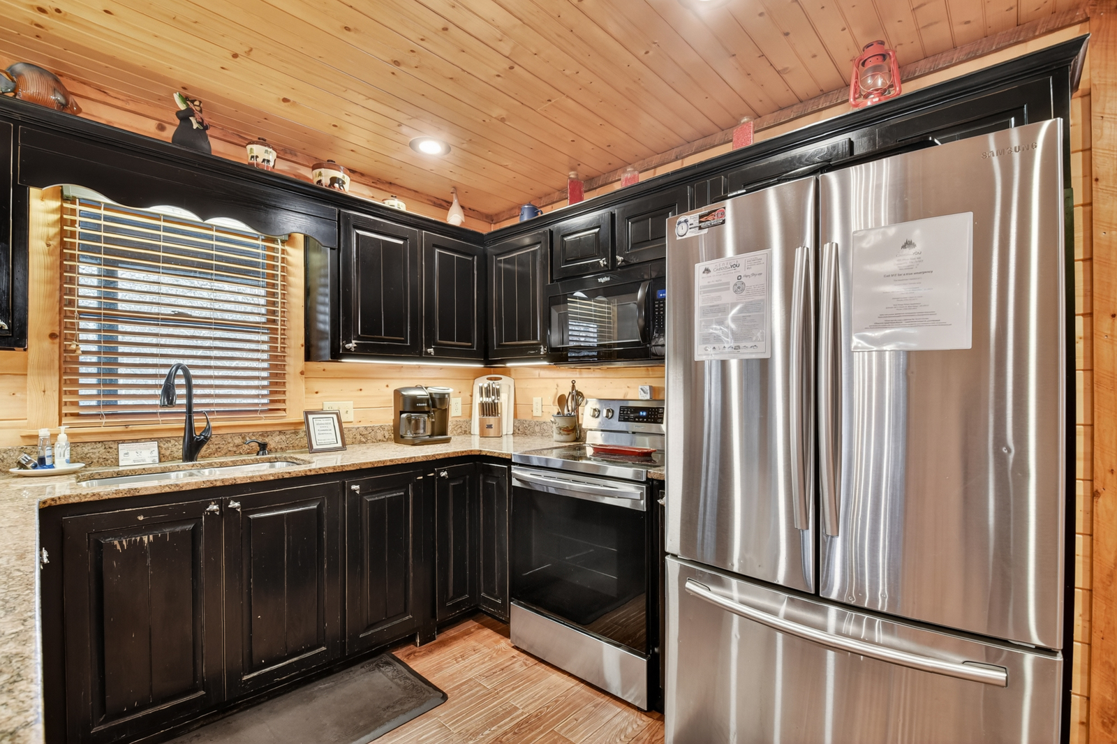 Steps from the living area is the fully equipped kitchen at your cozy cabin. Granite counters, stainless steel appliances, a dual coffeemaker, pots and pans, cookware, cutlery, dishes, and more allow you to focus on making memories instead of lugging heavy suitcases packed with kitchenware.