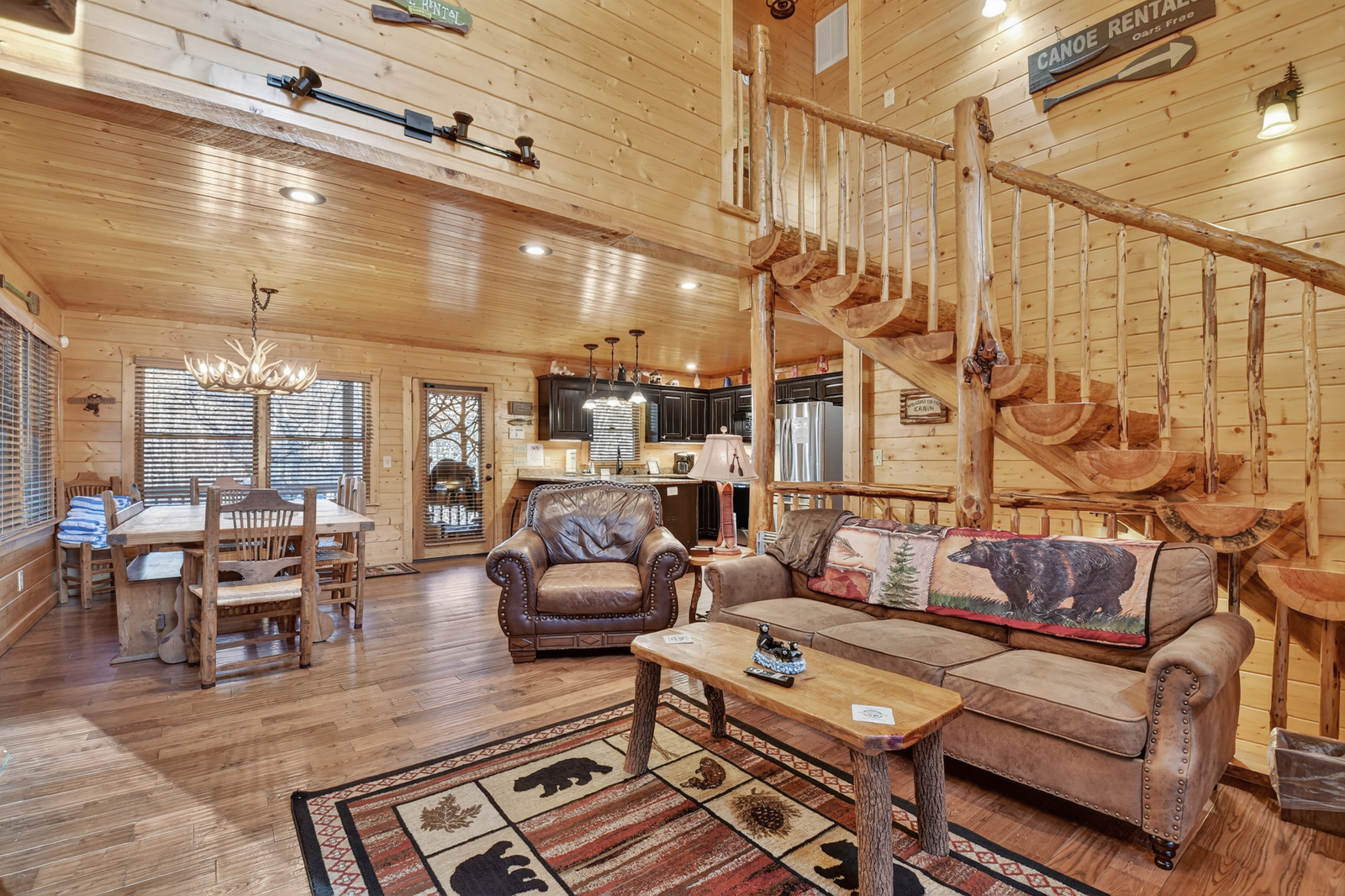 Upstairs, you’ll find the main living area at your mountain getaway — outfitted with a wood-burning fireplace for cozier evenings plus a big screen TV for movie nights with the whole family. Appalachian log features are present throughout, and the ceiling towers high, letting natural light pour into the room during the day.