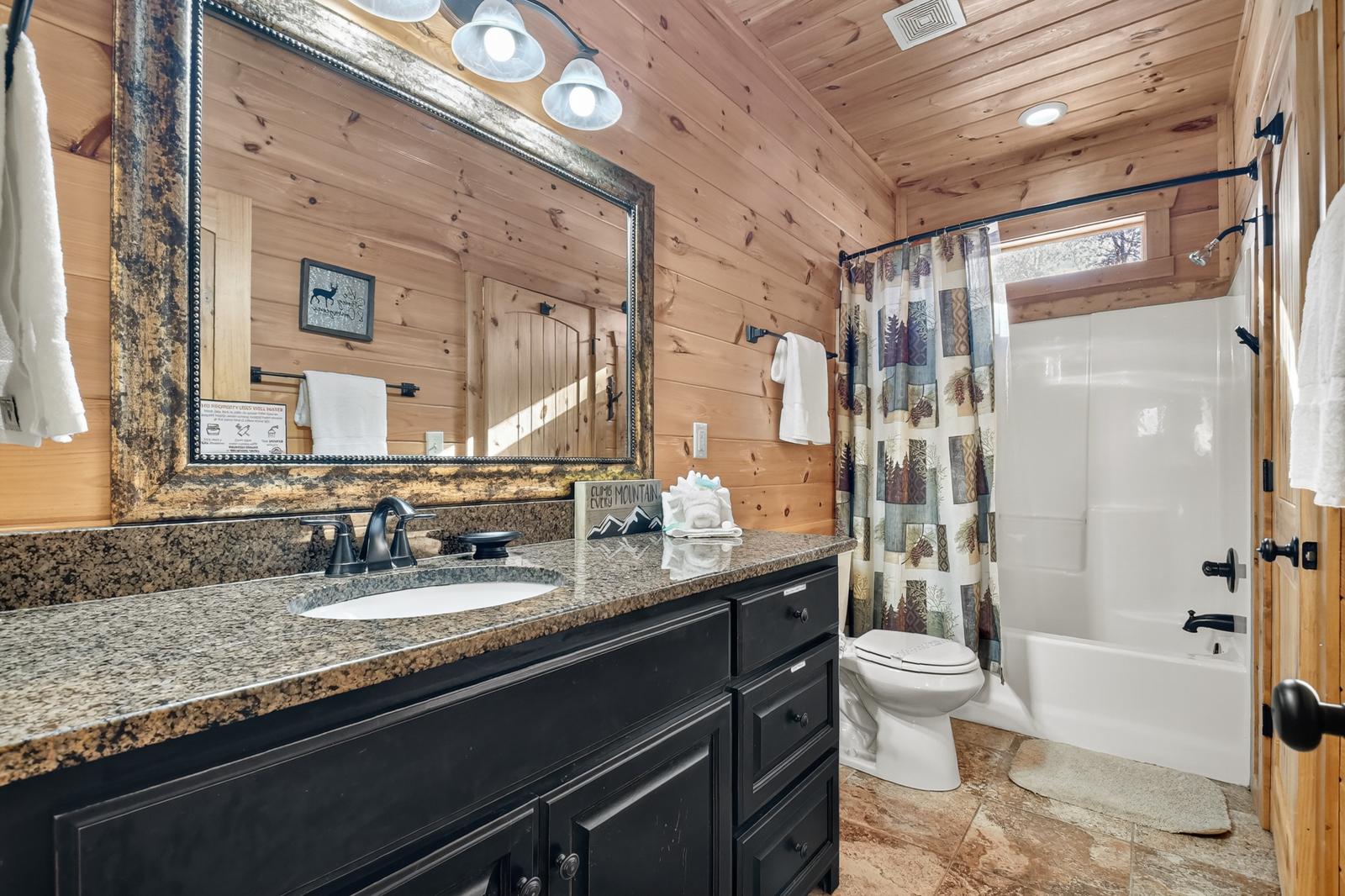 When it’s time to rest and recharge for tomorrow’s adventures, slip away for sweet dreams in a mix of 2 king beds, 1 twin-over-queen bunk, 1 twin bed, and 1 queen sleeper. Smart TVs are in several bedrooms, and the primary suite has a private bathroom with a tiled walk-in shower. Two more bathrooms make it easier to host up to 10 guests at this Blue Ridge, GA, cabin rental, great for family vacations or get-togethers with friends.