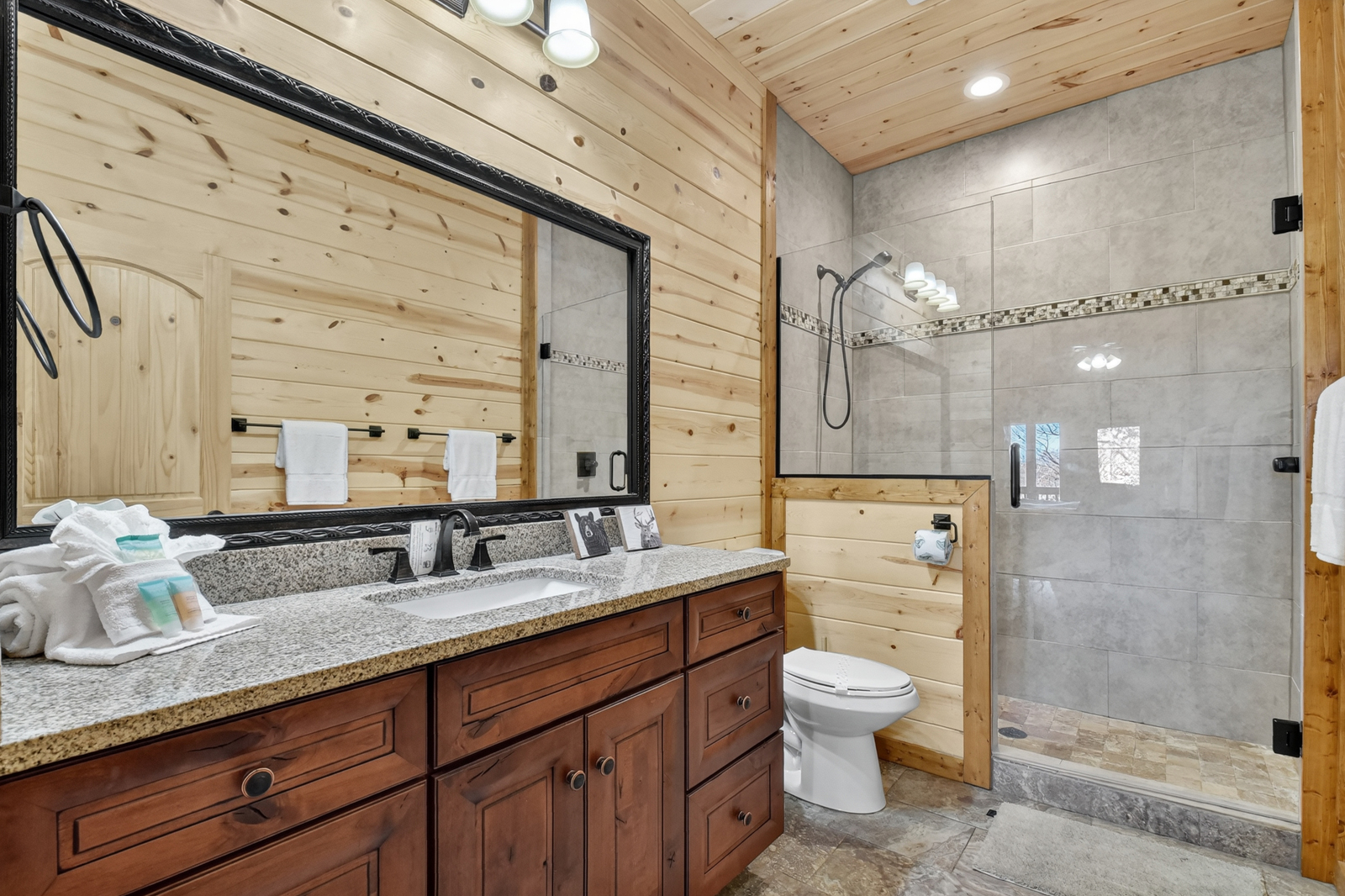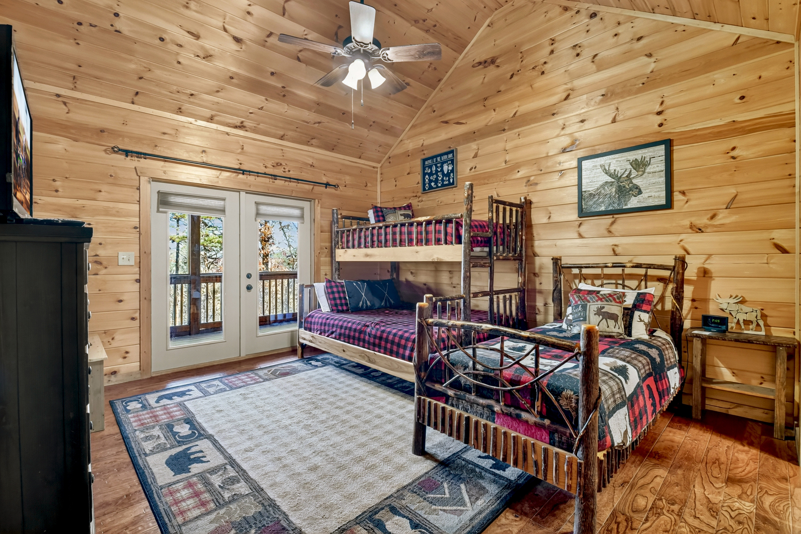 Bedding for up to 10 guests includes 2 king-size beds (one with a Sleep Number mattress), 1 Amish-made twin-over-queen bunk, and 1 queen sleeper sofa. Bathrooms offer 2 tiled walk-in showers plus a shower/tub combo for added convenience.
