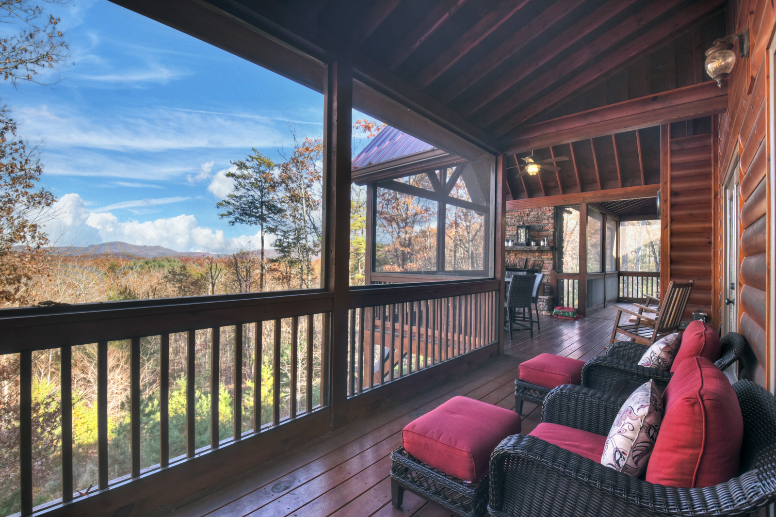 A covered front porch offers a quiet place to sip coffee in the fresh mountain air, while a screened back deck invites you to dine at a fire table — also in front of a crackling wood-burning fireplace — while gazing at stretching mountain views. Extras include rocking chairs to relax with evening wine or a good book plus cornhole boards to play more games.