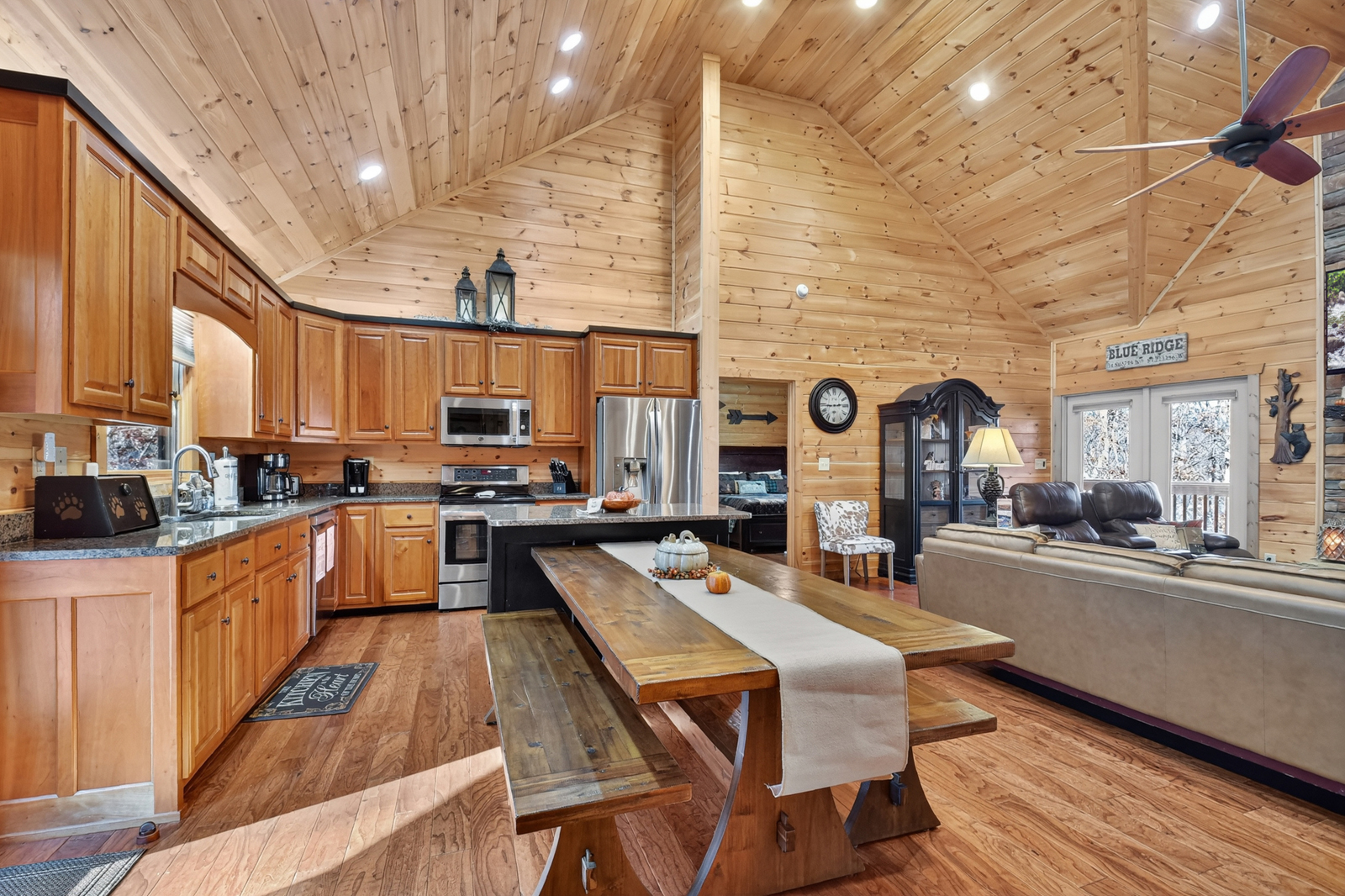 After an adventurous Blue Ridge scenic train ride, boating excursion on Lake Blue Ridge, or shopping spree for Appalachian mountain crafts downtown, curl up on the sofa or reclining seats in the inviting living room at your modern log cabin. Switch on the big screen TV for added entertainment while chatting, sipping drinks, or playing cards.