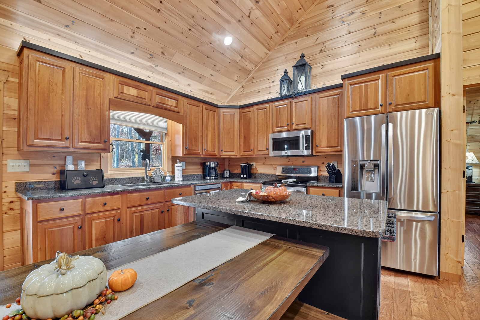 With stone counters, a spacious island, stainless steel appliances, pots and pans, dishware, glasses, cooking utensils, mugs, cutlery, and more, the fully equipped kitchen at your vacation home in the Blue Ridge Mountains offers a convenient space to prepare and serve food and drinks.
