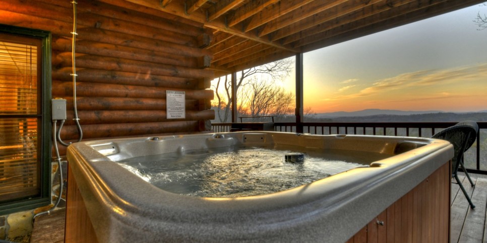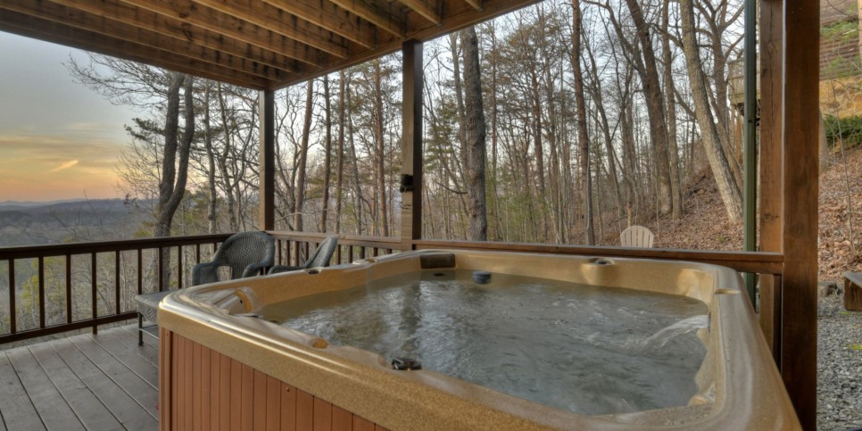 For more fun at your cabin rental in Blue Ridge, the rec room offers a pool table, a nice selection of games and books, a foosball table, a TV, great mountain views, a crackling fireplace, and seating. Have fun playing and hanging out here before stepping outside for some fresh mountain air. Outside, toss burgers and steaks on the grill, have lunch at the picnic table with an unbeatable view, or just sit back in the rocking chairs and relax. The bubbling outdoor hot tub is the place to end the day!