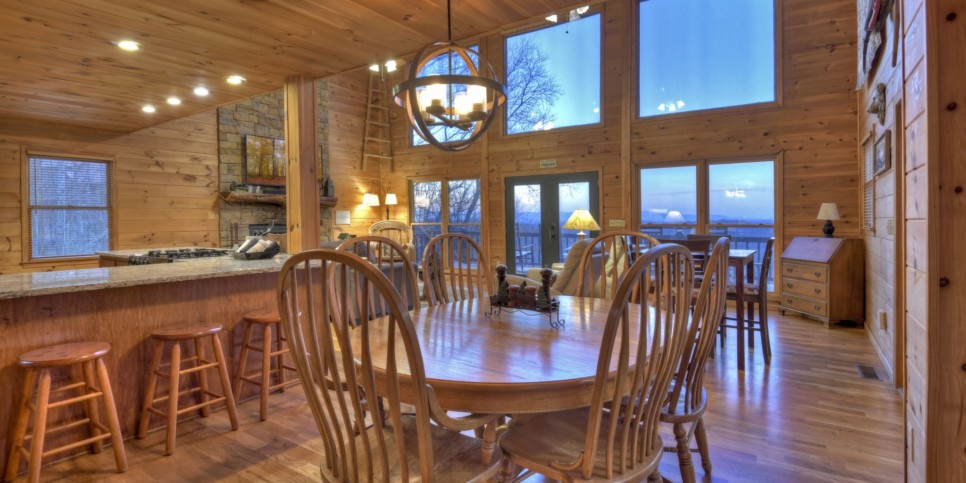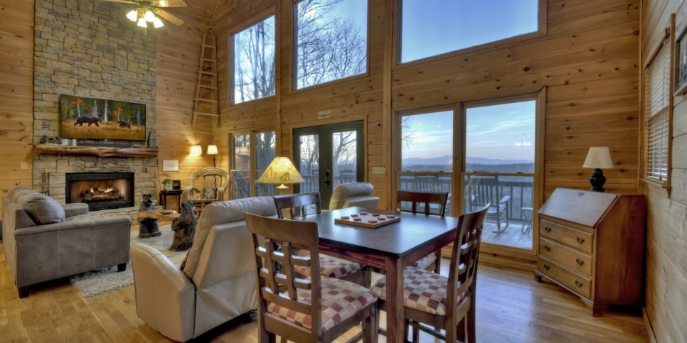 Appalachian touches, like the log mantelpiece, crafted rocker, and adorable black bear coffee table, make this space feel super cozy. Lounge on the sofa with your afternoon tea and watch the clouds roll by. When evening sets on a cold day, light the wood-burning fireplace and pass around mugs of cocoa or crack open that book you’ve been meaning to read in the rocker or one of the armchairs. For added entertainment, there’s a big screen TV, perfect for movie nights with loved ones.