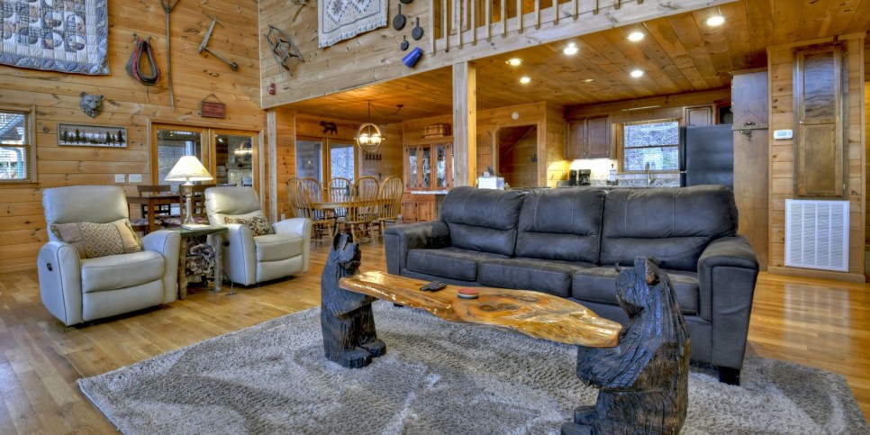 In the loft, you’ll find a king-size log bed, top-tier mountain views, a TV, and a ceiling fan. On the lower level, the first bedroom offers a queen-size bed, another TV, and access to the covered deck with more amazing views of the peaceful Blue Ridge Mountains. The second bedroom has 2 twin-size log beds, great for friends or kids. There’s a queen-size sleeper sofa in the living room for additional sleeping space at your pet-friendly Blue Ridge cabin.