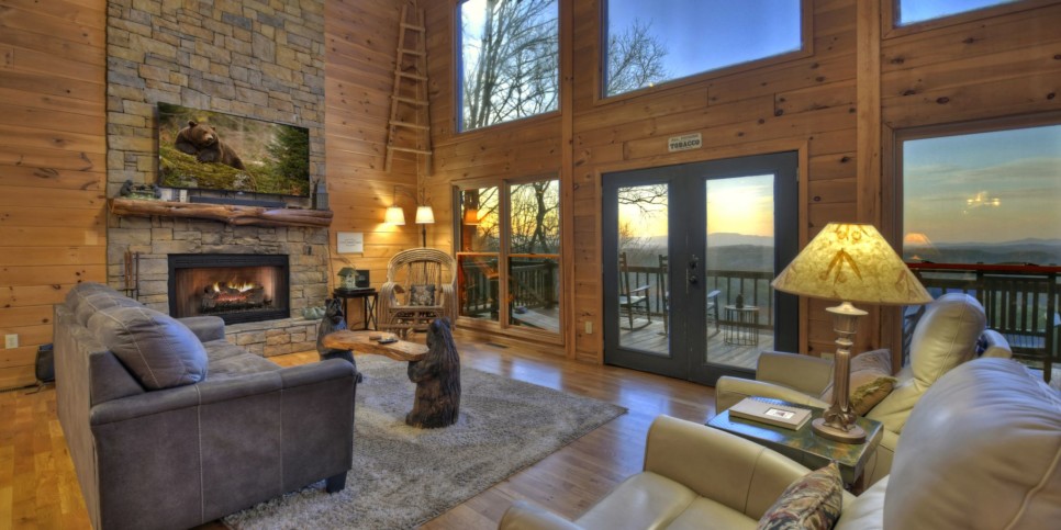 After picking apples at Mercier Orchards, shopping in downtown Blue Ridge, or exploring the Aska Adventure Area, return to your Blue Ridge cabin to relax. Open and inviting — with a soaring wall of massive picture windows framing the gorgeous Blue Ridge Mountains and towering treetops — the living room offers comfort and calming vibes whenever needed.