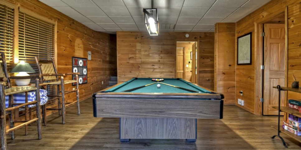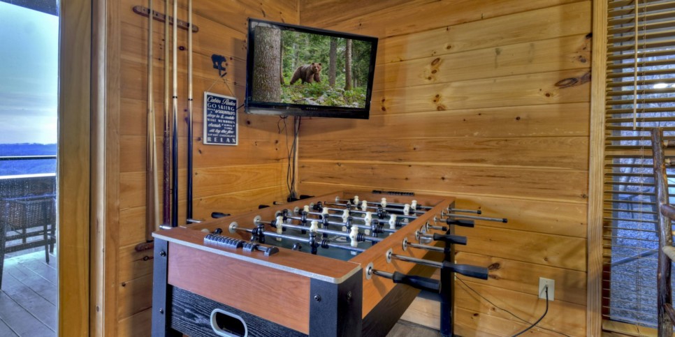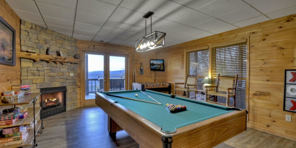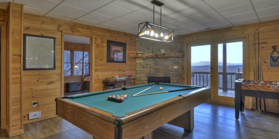 Kick the good times up a notch in the cool game room at your log cabin rental in the North Georgia Mountains! Downstairs, you’ll find an open room with another cozy fireplace, game tables, and a selection of board games and puzzles to enjoy. Play Tic-Tac-Toe on the wall, shoot friendly rounds at the pool table, and dominate the foosball field with dignity. There’s also a mounted TV for extra entertainment while you play together. And you can sit at the high chairs with a cold brew and a great friend between turns.