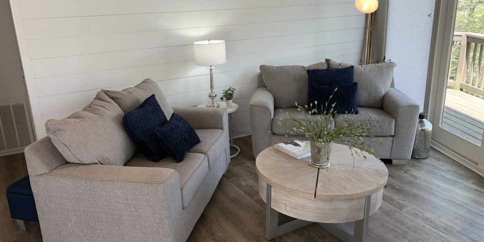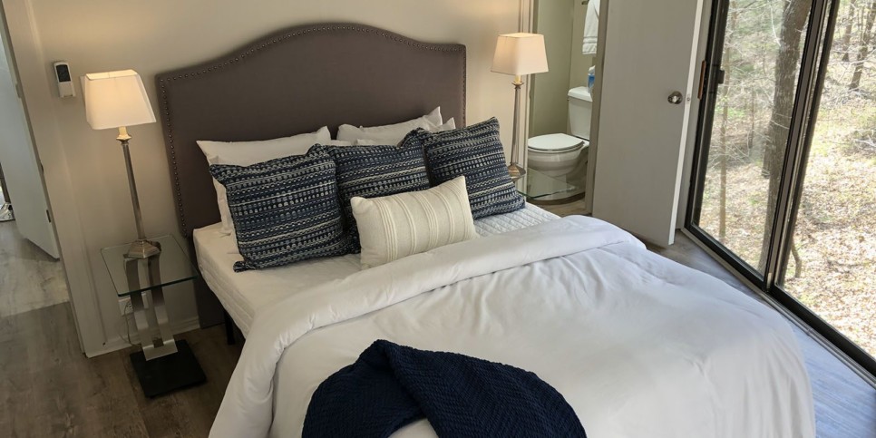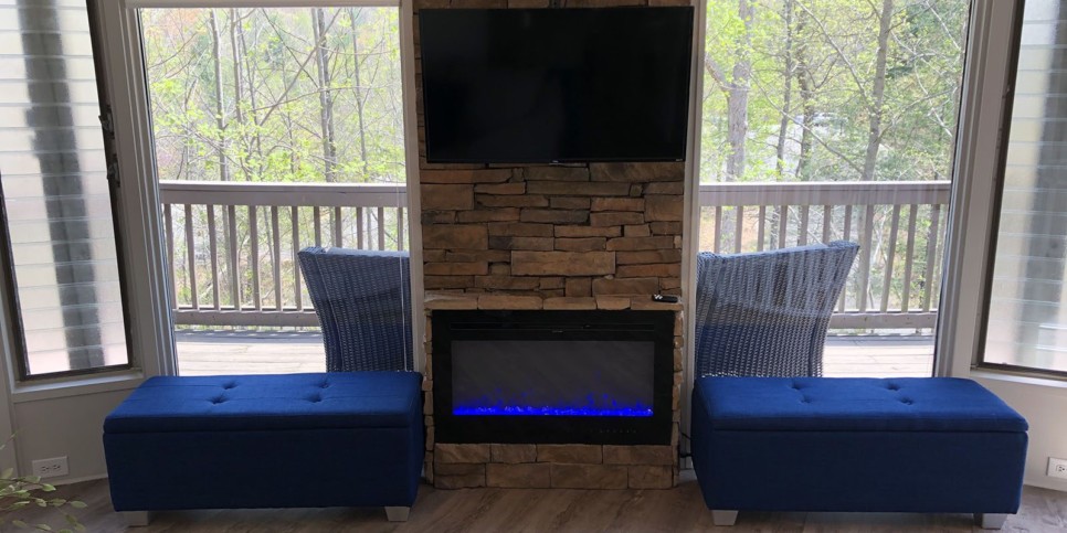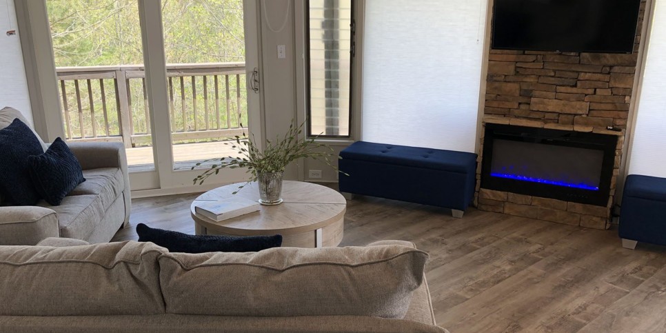 With an open concept design and a vaulted ceiling, the living room is welcoming and cozy. Furnishings are simple, elegant, and comfortable, creating a cottage chic vibe. Walls of windows frame the towering trees outside and let in tons of natural light during the day. The stacked stone (electric, no heat) fireplace is beautiful and a perfect addition to this Big Canoe vacation rental.