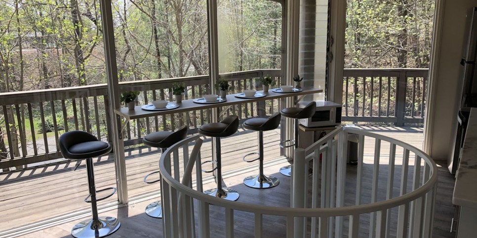After prepping a delicious meal or snack in the kitchen, set the bar table overlooking the enchanting trees outside. It’s the perfect setup so everyone can enjoy the views while eating, chatting, and drinking at your Big Canoe rental. You can also play cards, work on arts and crafts, sketch a mountain scene, or sip local Fainting Goats wine together.