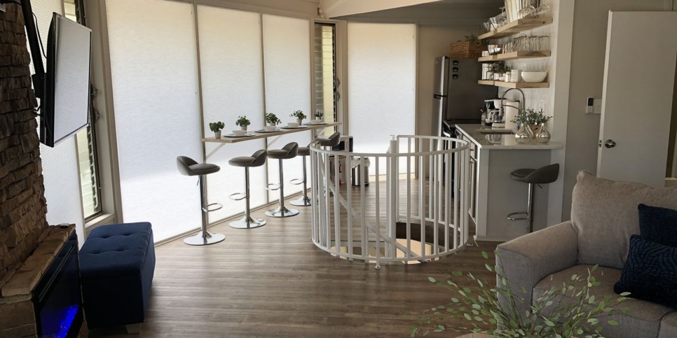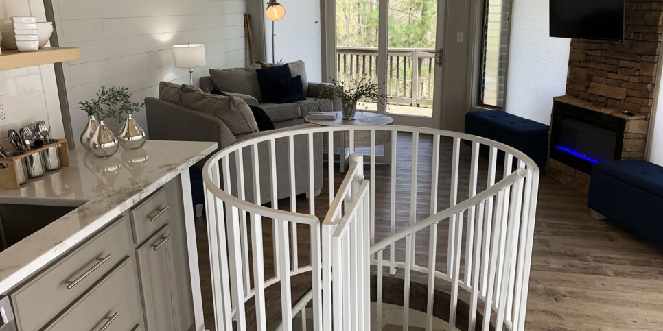 Enjoy dining together at the dining bar overlooking the trees through walls of windows or head onto the deck for morning coffee in nature. The cottage-chic style carries through the open-concept living space and into the inviting bedrooms that each feature custom furnishings and a big screen TV. The modern spiral staircase has a gate for child safety, and you can request a pack-n-play for your stay in Jasper, GA. Additional amenities include a corner desk space for work, drawing, or homeschool, a washer and dryer to wash provided towels and linens as needed, and high speed Wi-Fi to stay connected.