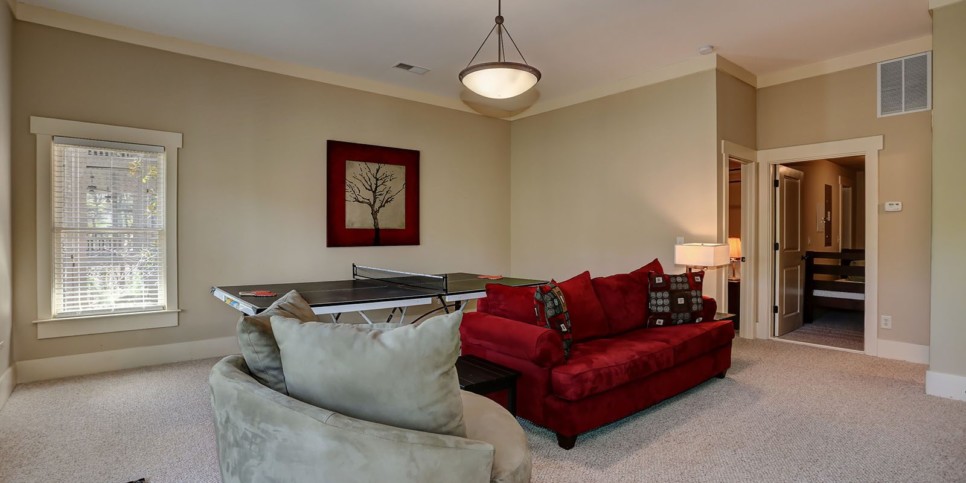Furnished with a plush sofa and a plump chair, the rec room is a comfortable space to unwind and hang out. Play around on the ping pong table or cozy up on the sofa with a book or a drink. Relax and enjoy quality time with family and friends in this laid-back space. There is also a flatscreen TV mounted on the wall, and it has Roku and Netflix so you can stream all your favorite shows.