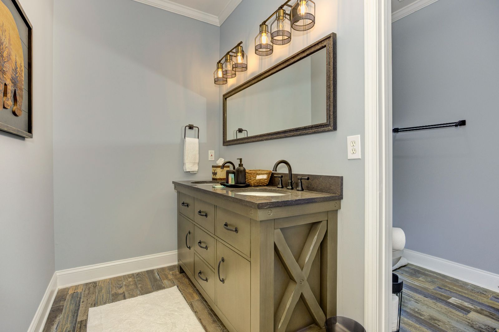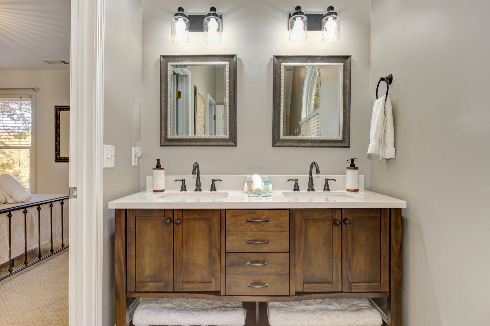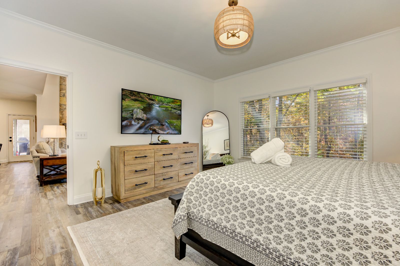 Get good sleep at your 4-bedroom Big Canoe lodge with a loft between all the family fun in North Georgia. In the primary suite on the entry level, a king bed beckons sweet dreams, a big screen TV offers entertainment anytime, and the en-suite bathroom is spa-like — with a soaking tub, large tile-and-glass shower, and 2 separate vanities. Enjoy a soothing bubble bath or hot rinse with your partner before slipping into bed.