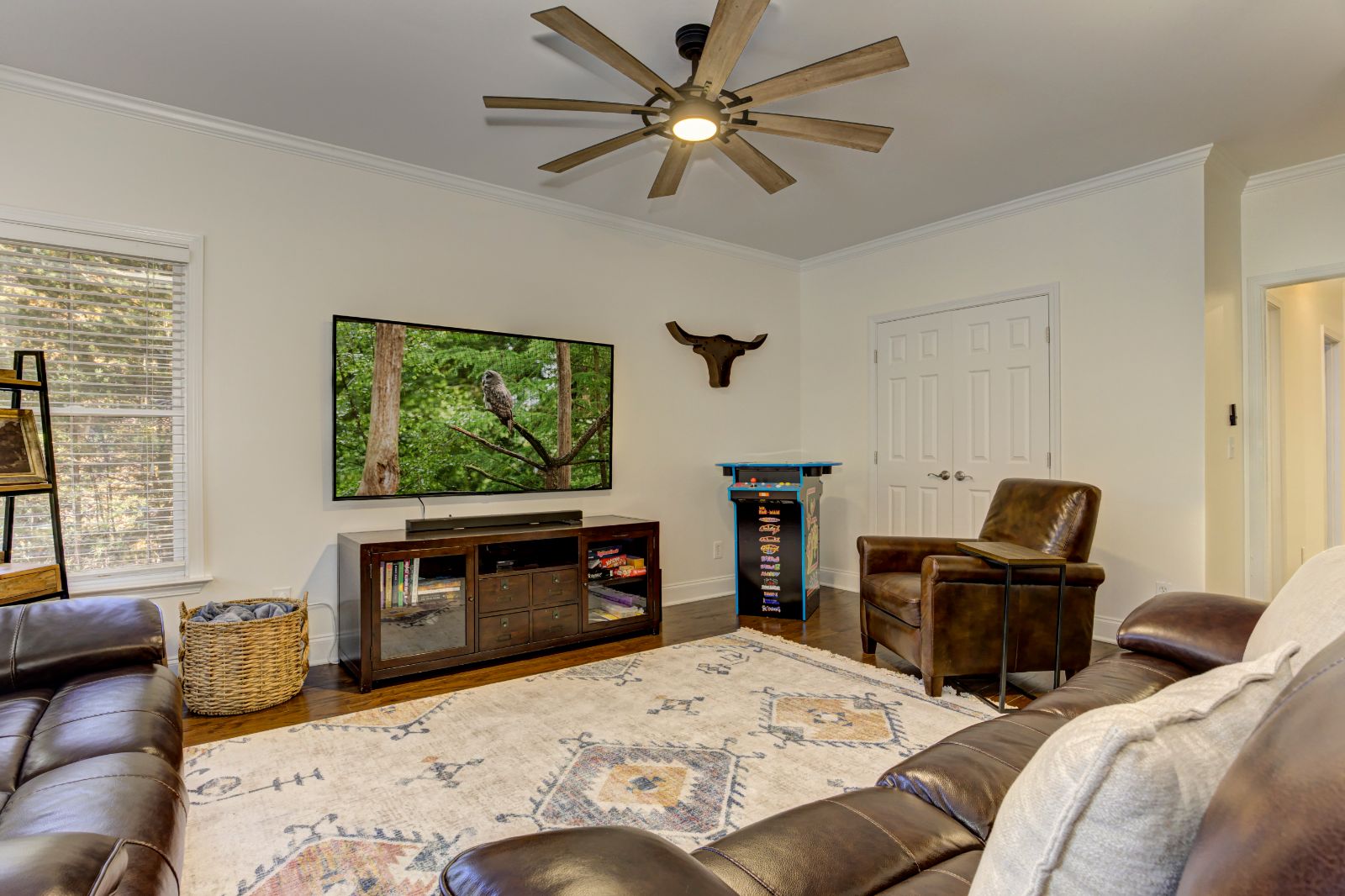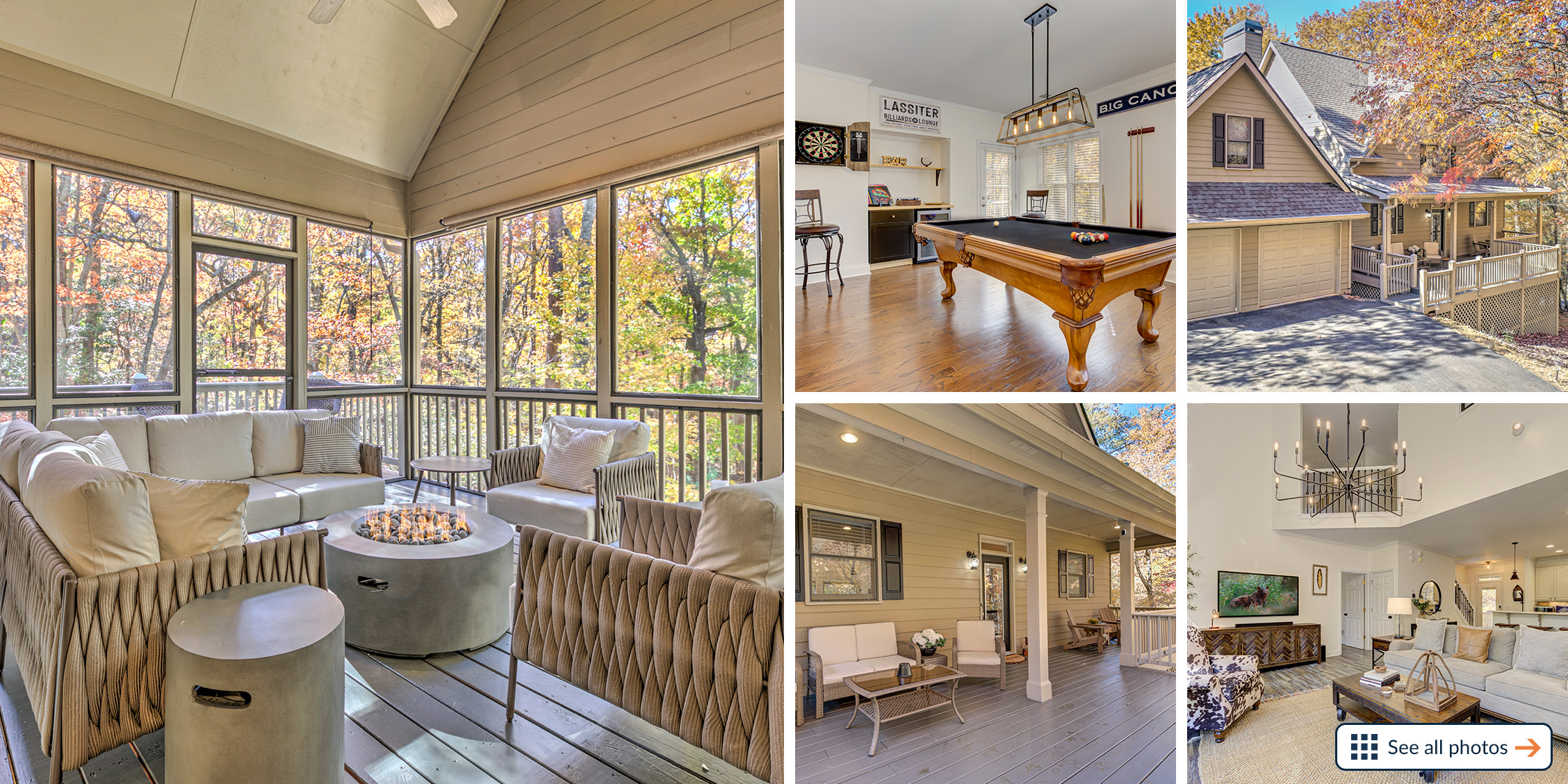 Curl up by the warm gas fireplace with a cup of cocoa and your partner or the whole family. Host epic movie nights with the big screen TV in the media space. Shoot pool, win arcade games, and set up family board games for even more fun at your beautiful 3,400-square-foot Big Canoe vacation home. Outside, towering trees and seasonal mountain vistas beckon morning coffee sips and afternoon meals sizzling on the gas grill.