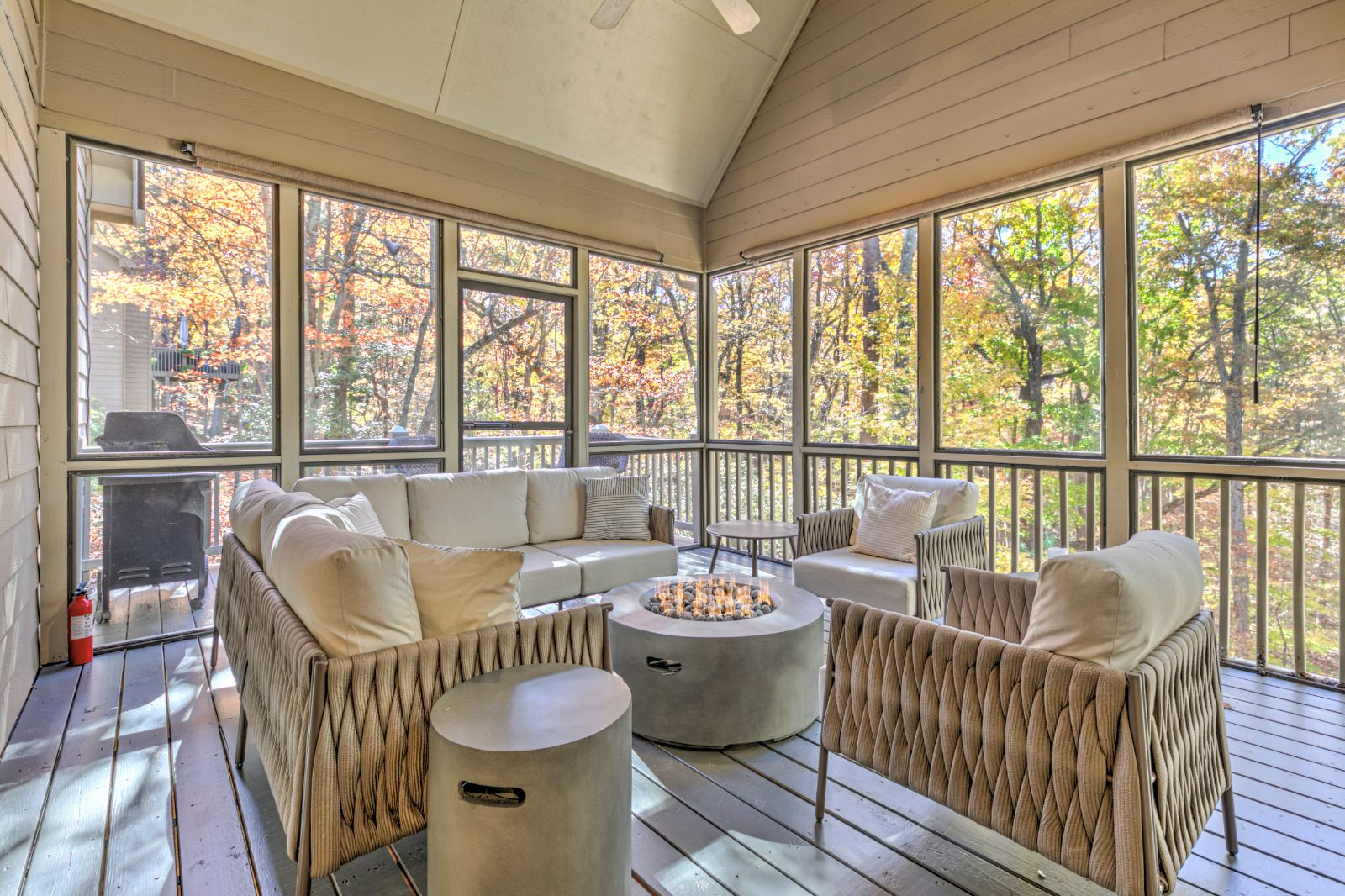 Sip North Georgia moonshine while relaxing on the front porch or screened deck. Sitting areas welcome guests to relax in the fresh mountain air, while a fire table offers warmth and a calming atmosphere in the evenings. Seasonal mountain views await in winter months, and wooded vistas can be enjoyed year-round. Bonus: there’s an open deck space with a gas grill for fun cookouts together!