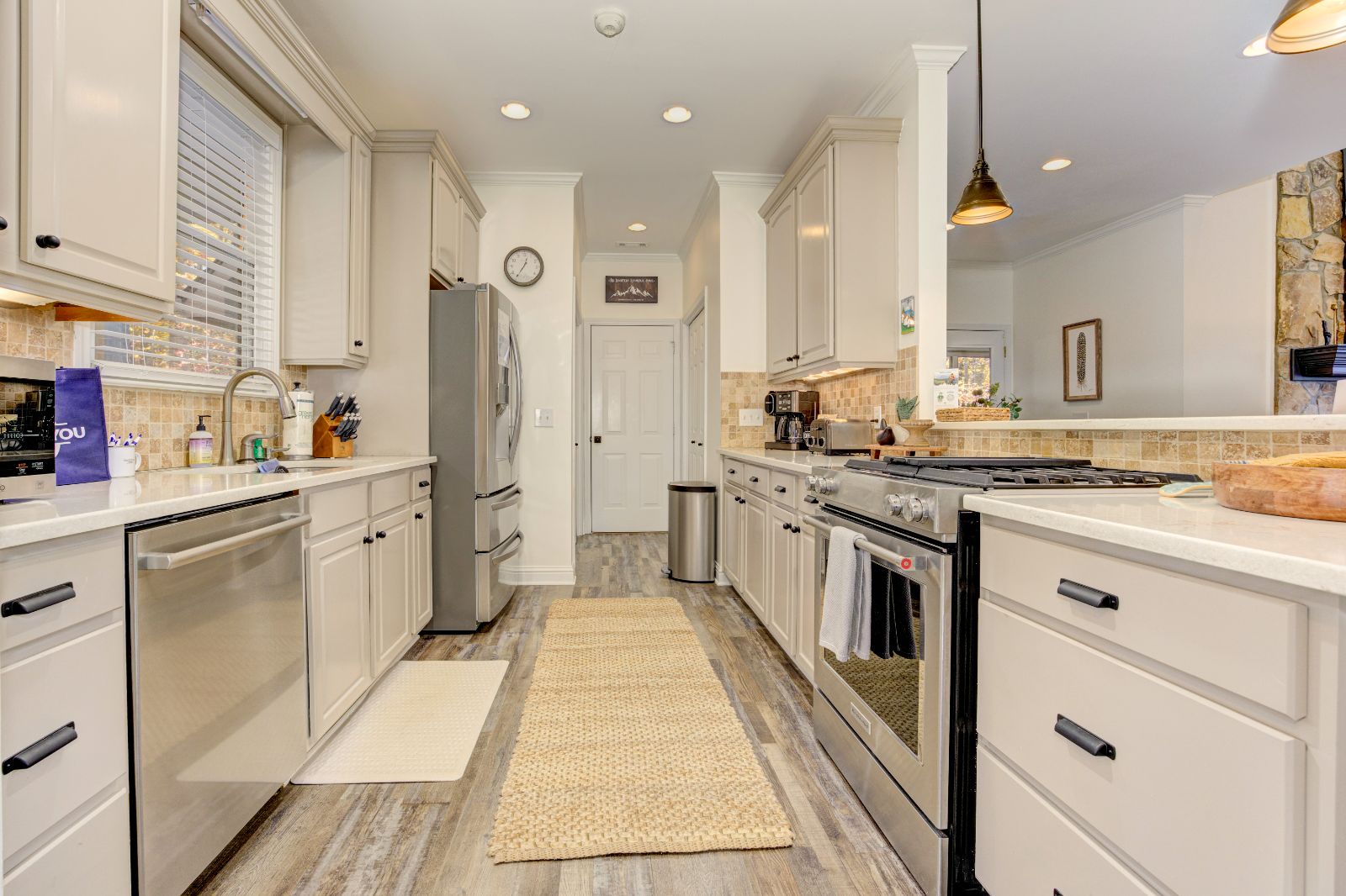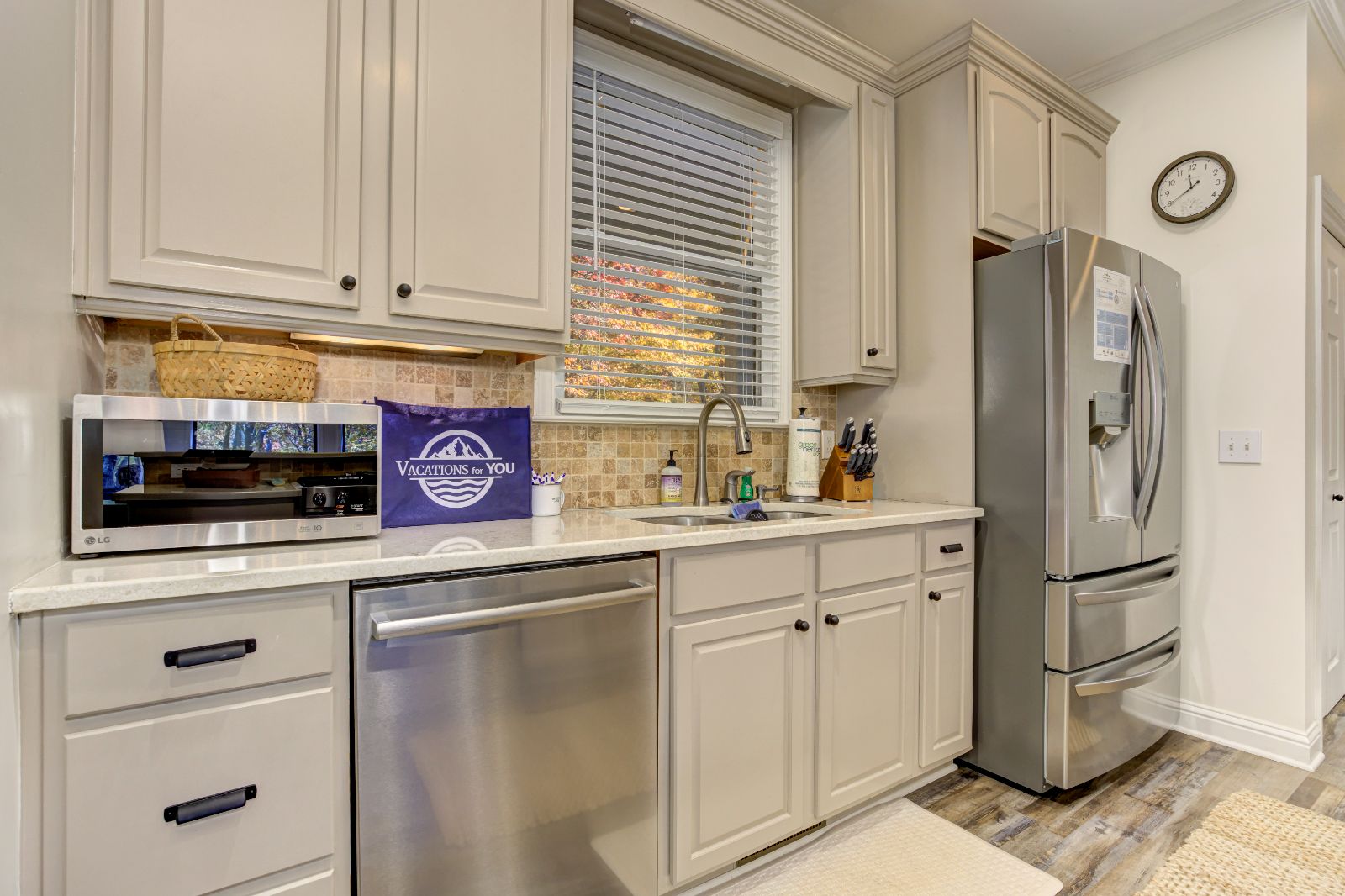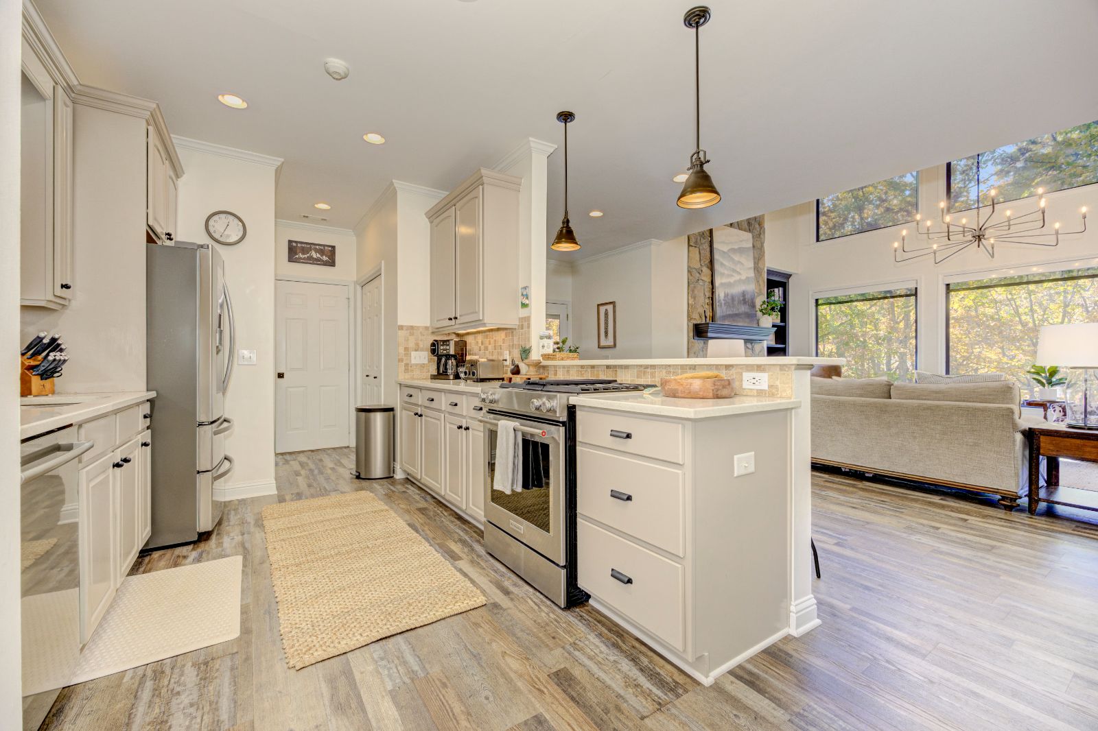 Before setting out on a hike to Eagles Rest Park, among Big Canoe’s many outdoor activities, take advantage of meal prep in the fully equipped kitchen. Featuring a dual coffeemaker for energizing sips, a sink with a window overlooking the trees, a gas range facing the breakfast bar and living area, and all the tools needed to make food and drinks, this space is perfect for keeping everyone fed and happy at your rental home.