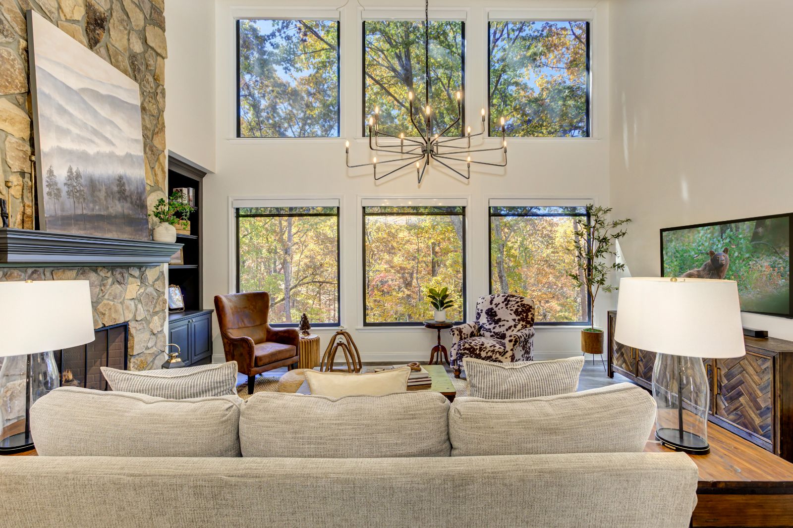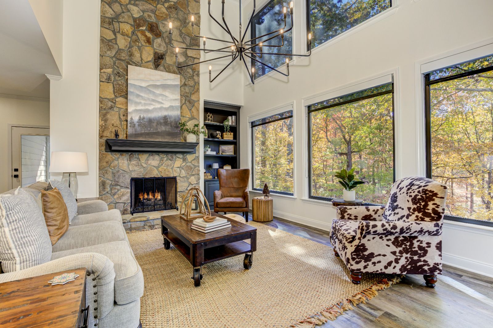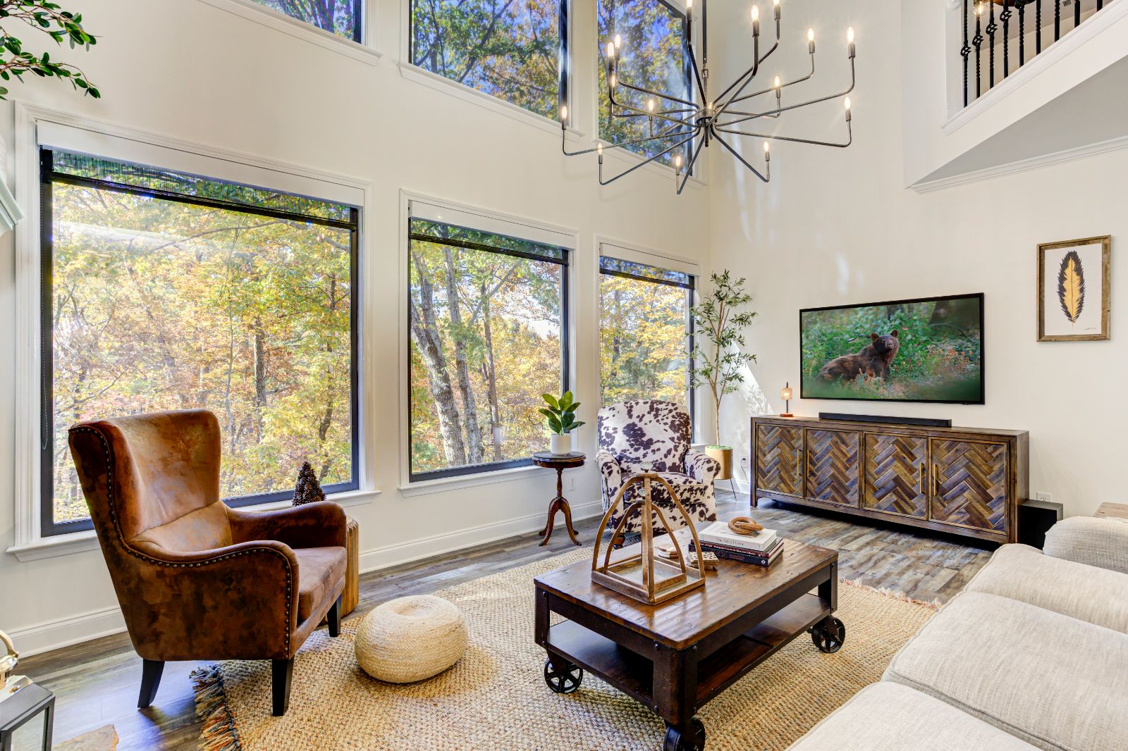 For added entertainment, a big screen TV beckons movies and shows during downtime. Guests can spread out on the plush sofa and armchairs beneath a spectacular chandelier. For added fun, the coffee table is mobile, making it easier to share snacks or play cards on your North Georgia vacation.
