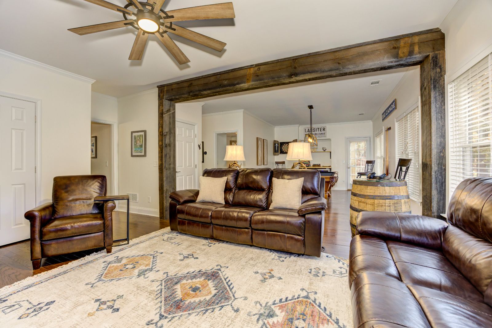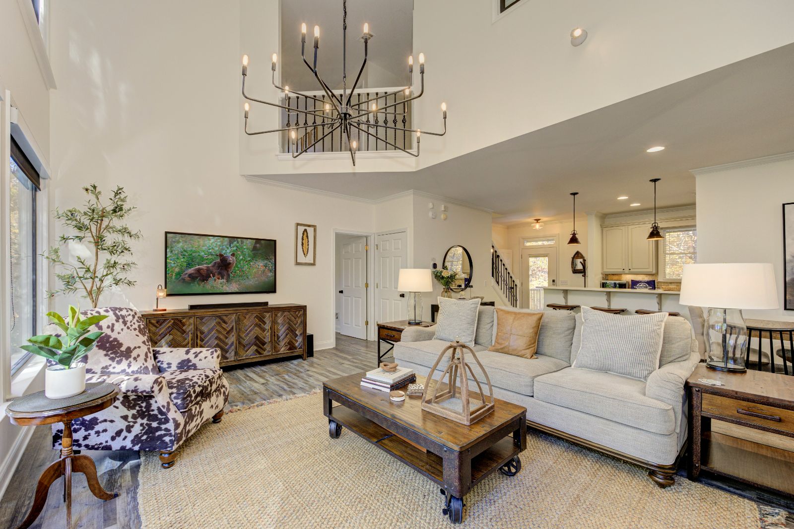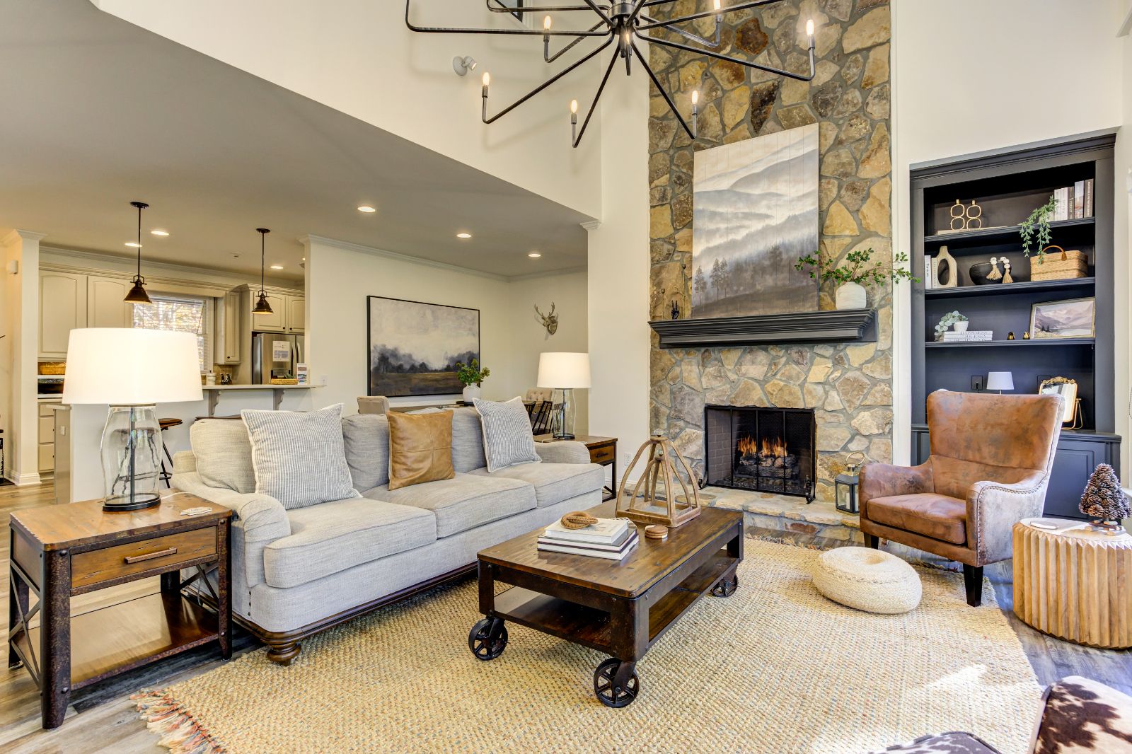 For added entertainment, a big screen TV beckons movies and shows during downtime. Guests can spread out on the plush sofa and armchairs beneath a spectacular chandelier. For added fun, the coffee table is mobile, making it easier to share snacks or play cards on your North Georgia vacation.
