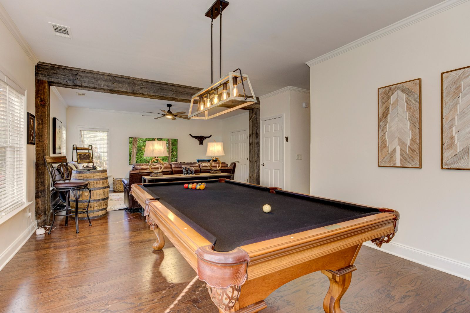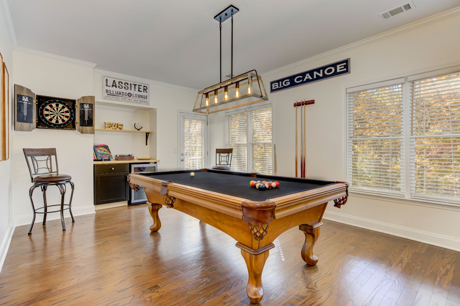 Ready for even more excitement at your beautiful Big Canoe cabin rental? Head downstairs to the game room and media space — outfitted with a standing arcade unit, dartboard, pool table, mini fridge, and massive TV! Windows around the spacious room let in naturat light and tree-studded scenery during the day.