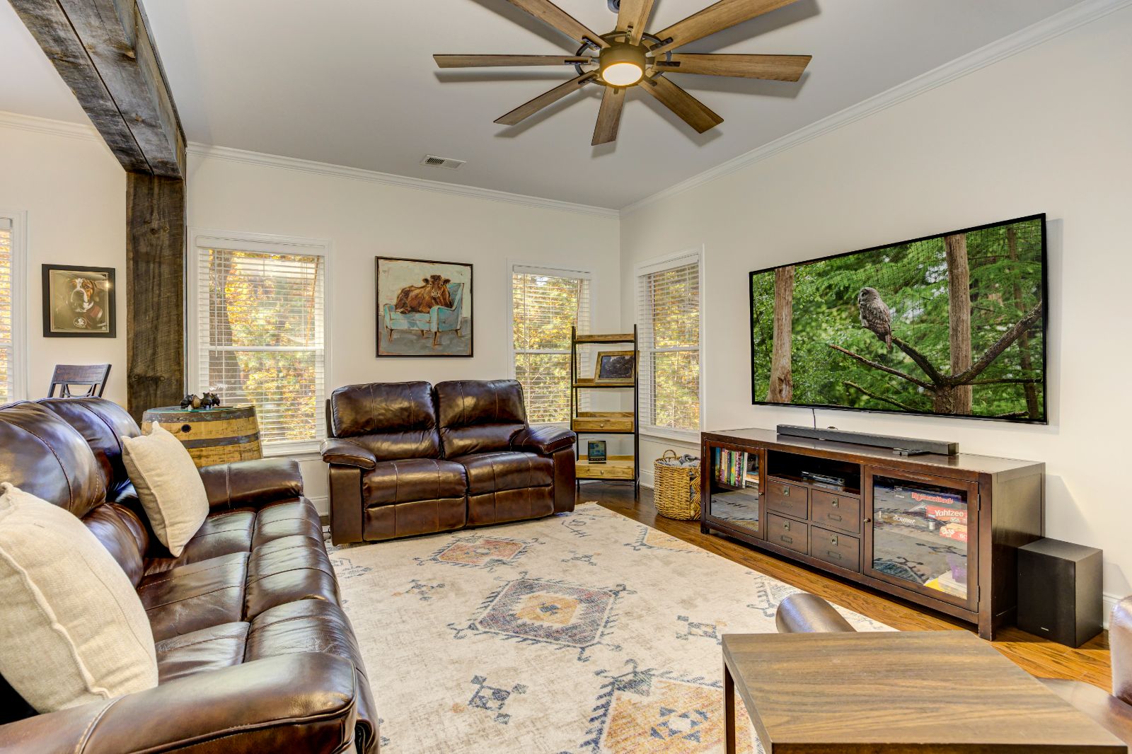 Back inside your 4-bedroom, 3½-bathroom North Georgia vacation rental, a full kitchen means homemade dishes, satisfying snacks, and midnight margaritas are always at hand. A garden tub soothes tired muscles, paired best with bubbles, salts, or bath teas. And when you’re ready to turn in for the night, a mix of 1 king, 3 queen, and 2 twin beds invite you to dream sweetly. You’ll even have TVs in the bedrooms, so guests can slip away for cozy downtime anytime.