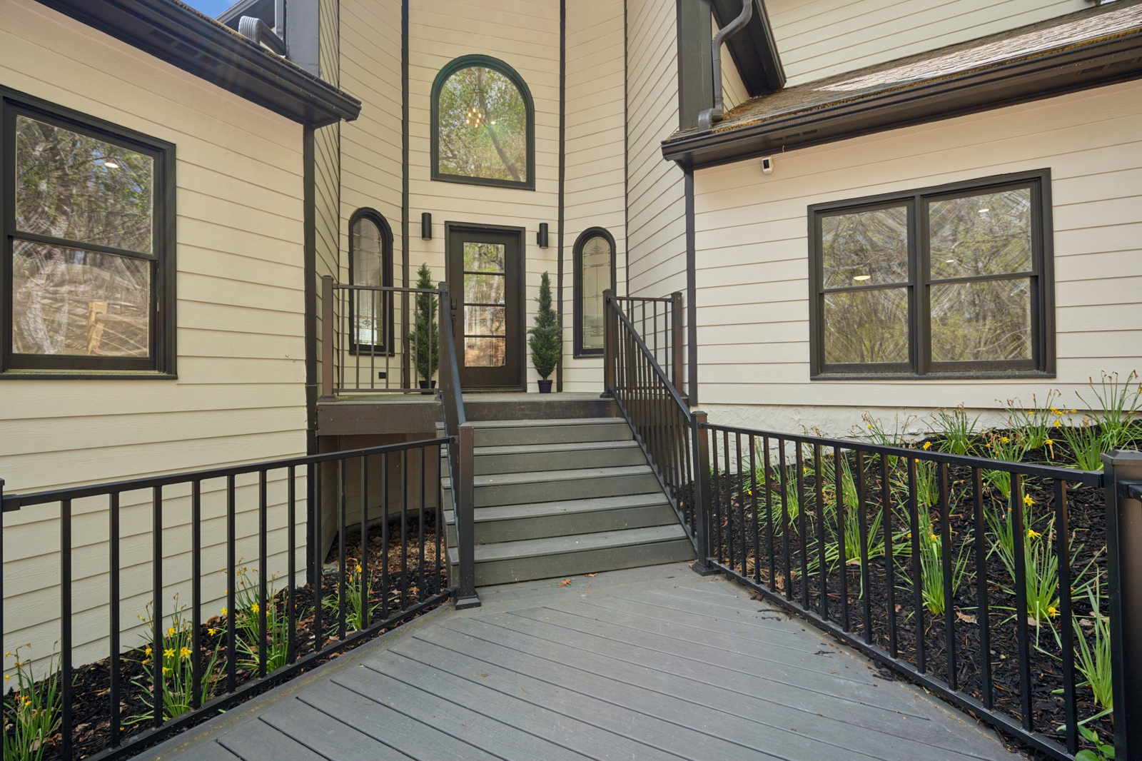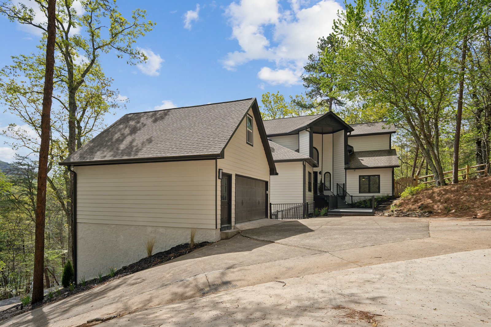 The steep, paved driveway has parking for up to 6 vehicles, including a double garage; there are 7 steps to head inside.Â