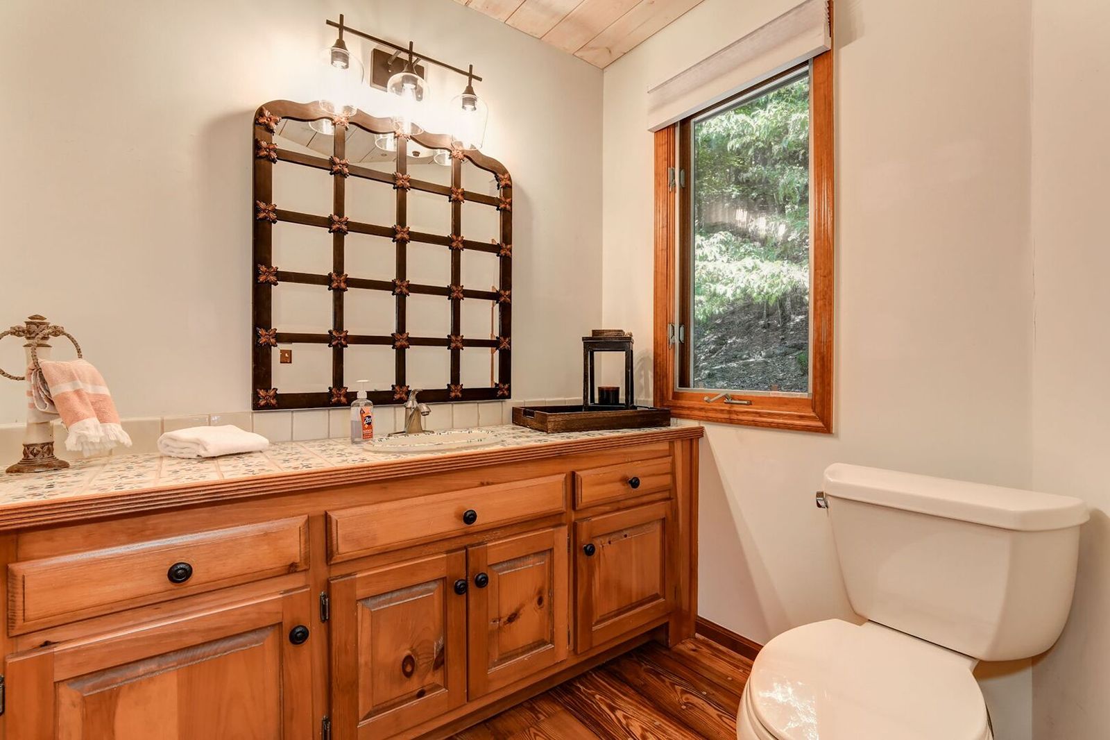 Whether you’ve just cooked up a storm or ordered takeout from one of the best restaurants in North Georgia, you’ll appreciate a space to sit down and enjoy food and friendship. The dining area offers a gorgeous wood table with views of the treetops and mountains with every bite. For more space, you can spread out to the deck or plop on the sofa bor chairs in the living room. Between mealtimes, browse board games at your cabin rental in Big Canoe and set one up at the table to play together.