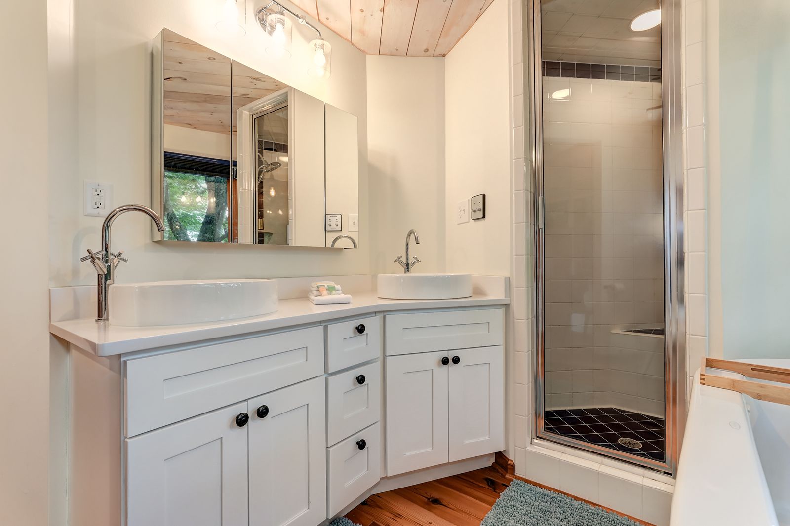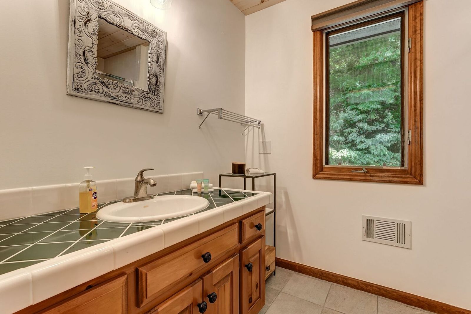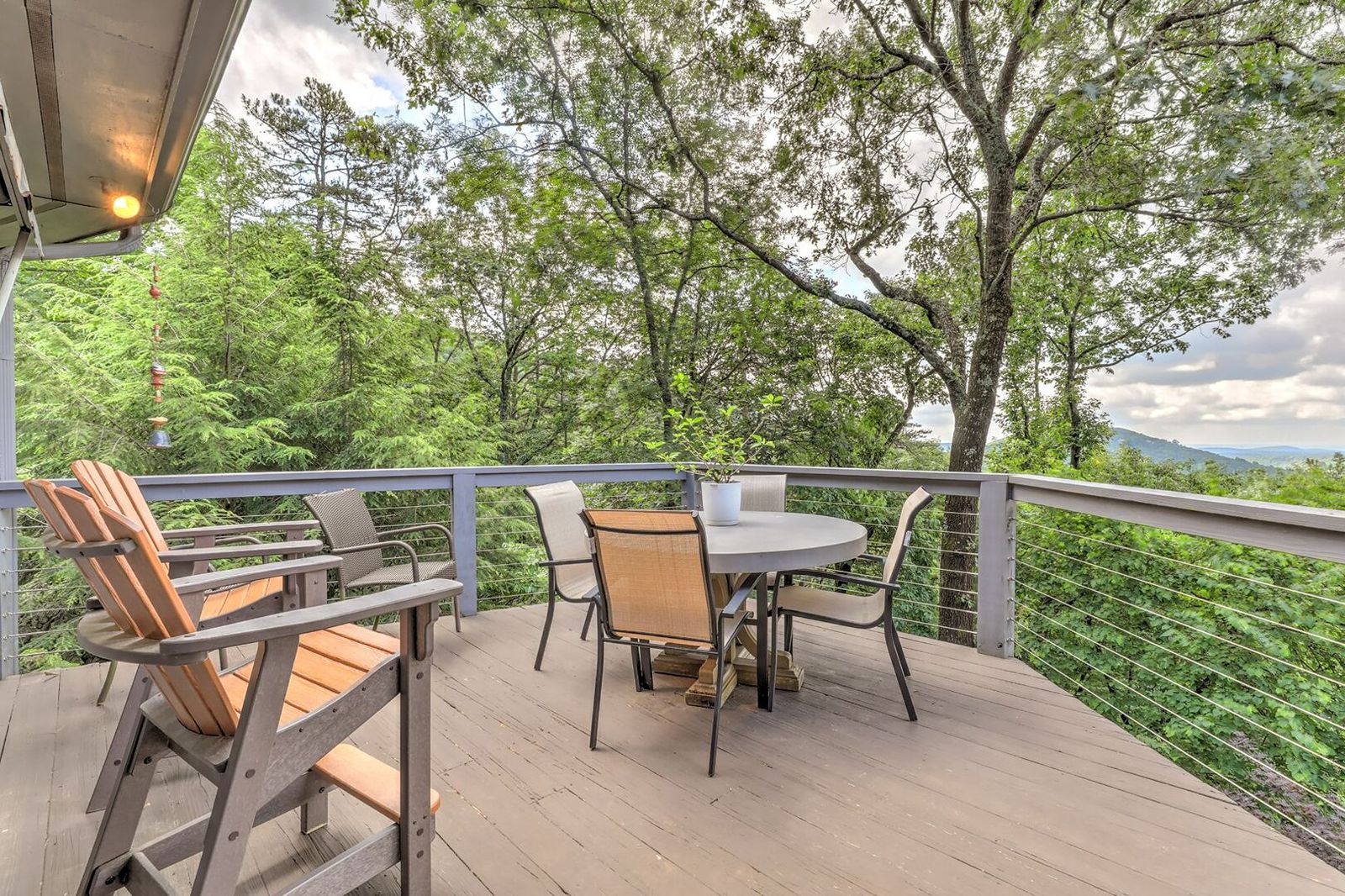 Whether you’ve just cooked up a storm or ordered takeout from one of the best restaurants in North Georgia, you’ll appreciate a space to sit down and enjoy food and friendship. The dining area offers a gorgeous wood table with views of the treetops and mountains with every bite. For more space, you can spread out to the deck or plop on the sofa or chairs in the living room. Between mealtimes, browse board games at your cabin rental in Big Canoe and set one up at the table to play together.Â