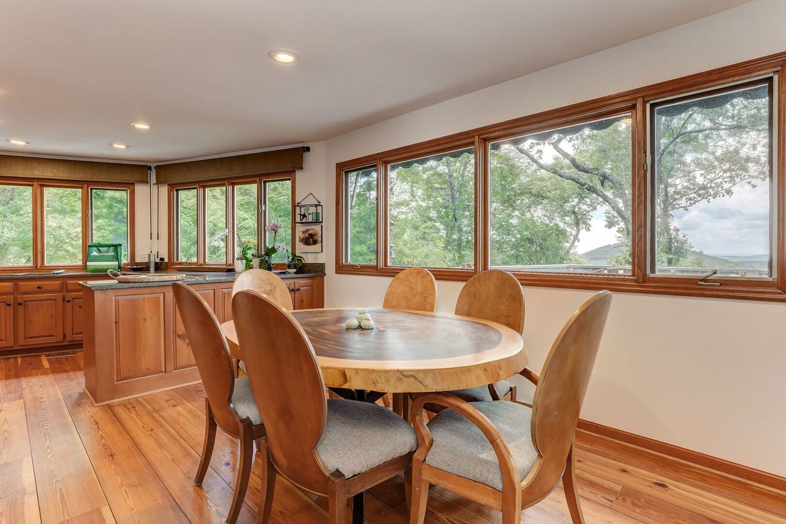After a full day of fun shopping in town, hiking in the Chattahoochee National Forest, or exploring the annual Jasper Marble Festival, return to your Blue Ridge Mountain cabin to unwind. Cozy and inviting, the living room welcomes friends and family to reconnect in front of the crackling stacked-stone (gas) fireplace. With a wall of windows framing the rolling mountain vistas, this space offers relaxation with every glance. For added entertainment, switch on the big screen TV and kick back for a spell.
