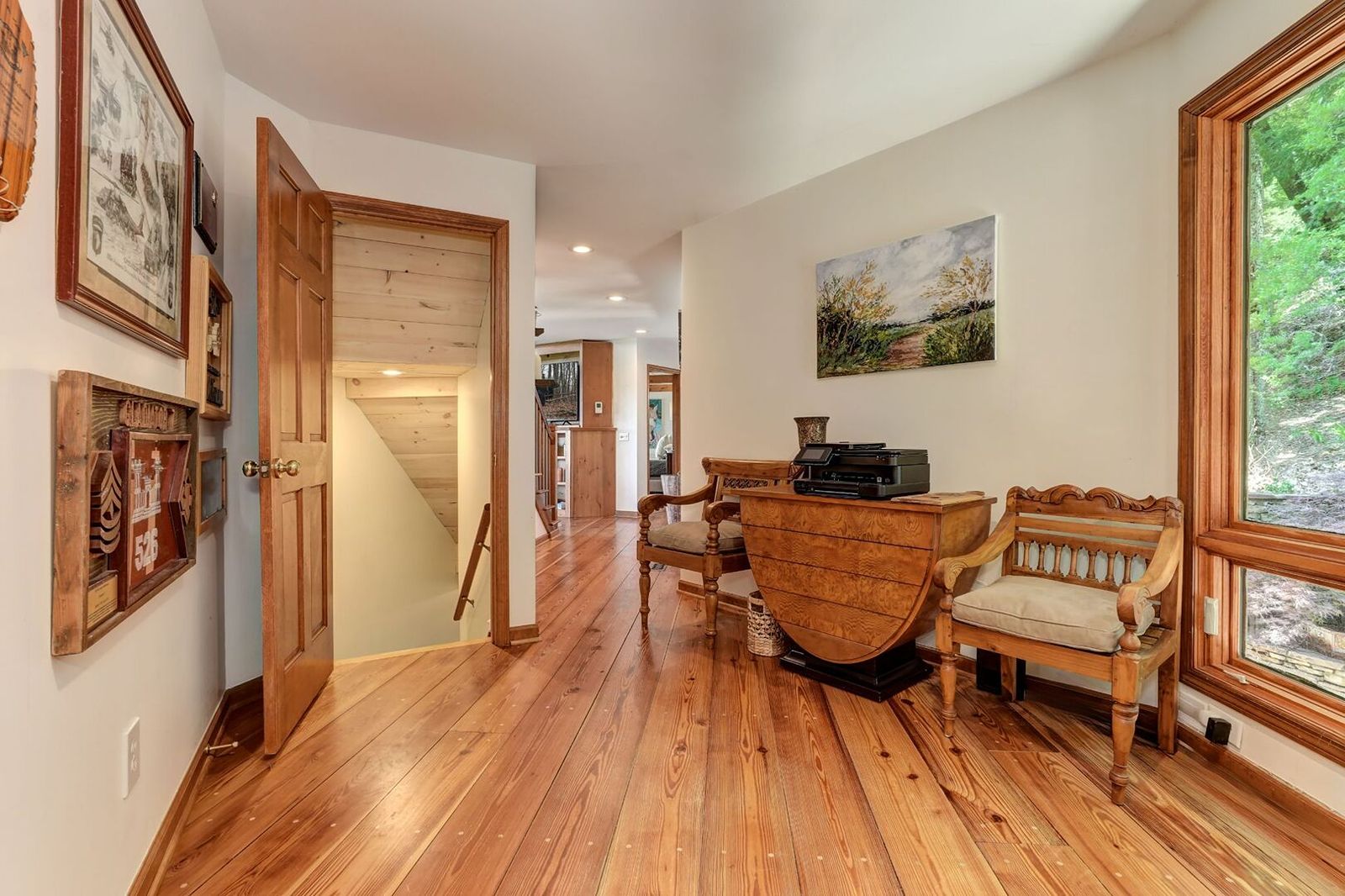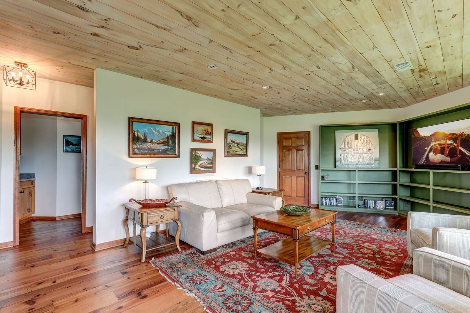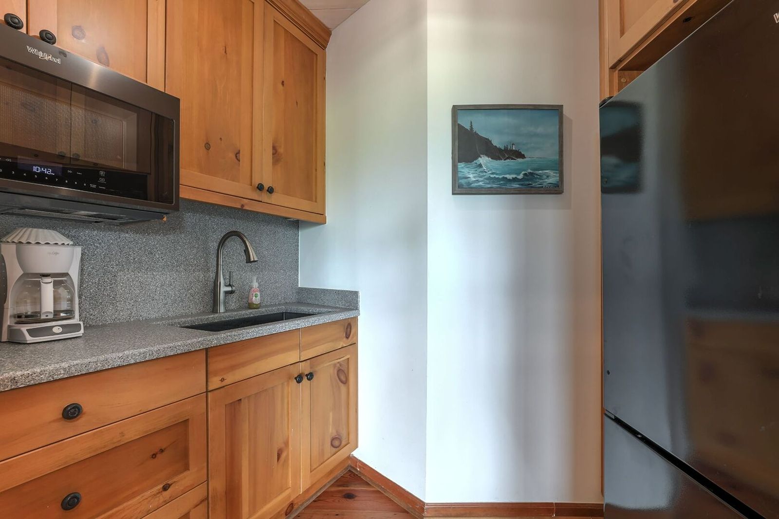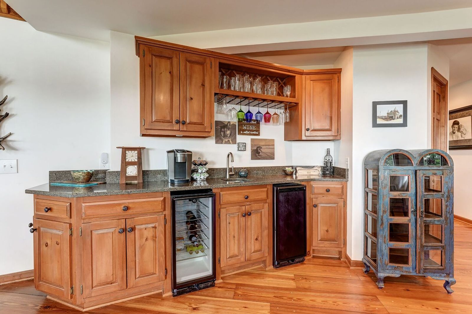 Down the hall, you’ll find a wine cellar to stock up on your favorite Appalachian wine. And there’s a kitchenette with a full-size fridge, microwave, sink, and coffeemaker. Pop movie-night popcorn, grab a bottle of pop, and settle in for quality time with loved ones.