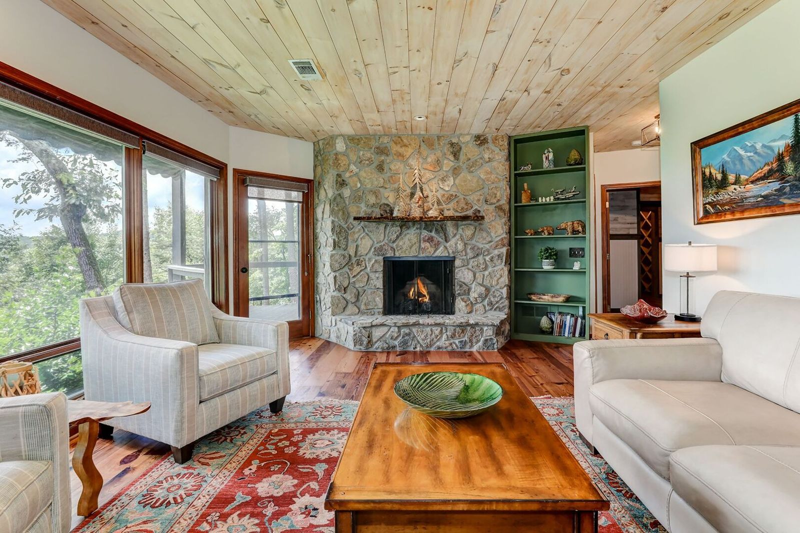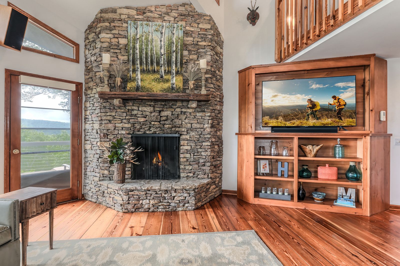 After a full day of fun shopping in town, hiking in the Chattahoochee National Forest, or exploring the annual Jasper Marble Festival, return to your Blue Ridge Mountain cabin to unwind. Cozy and inviting, the living room welcomes friends and family to reconnect in front of the crackling stacked stone (gas) fireplace. With a wall of windows framing the rolling mountain vistas, this space offers relaxation with every glance. For added entertainment, switch on the big screen TV and kick back for a spell.