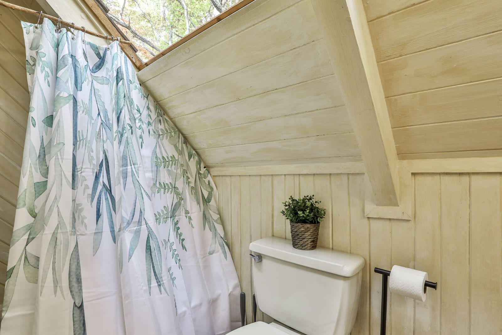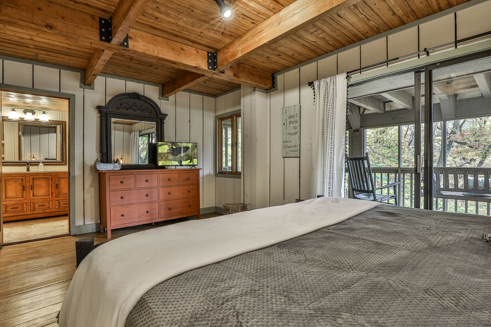 In the primary suite on the lower level, you’ll have access to another screened deck, where you can walk into nature in your house slippers and sway away your worries and cares! There’s also a private en-suite bathroom with a tiled walk-in shower, with plenty of space for 2. Additional accommodations include 2 shower/tub combos plus 1 twin-size bed with a trundle in the open loft.