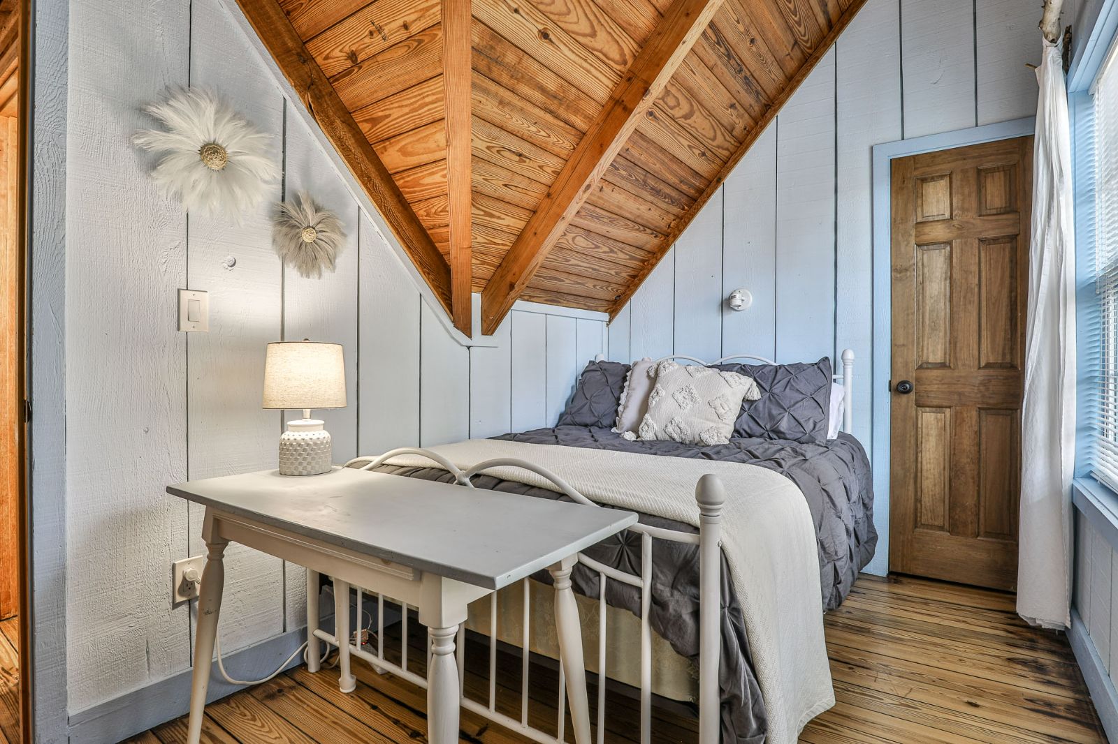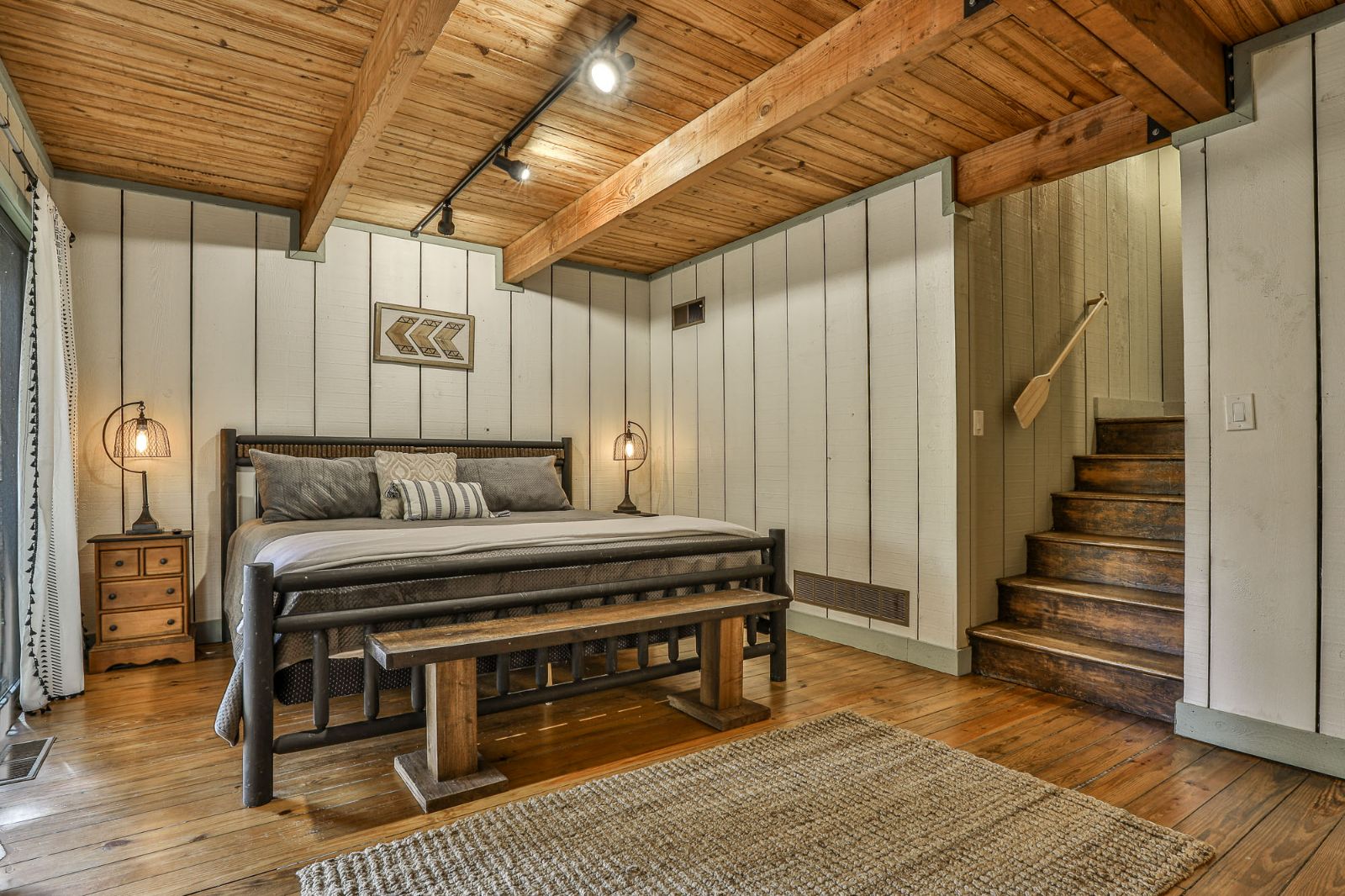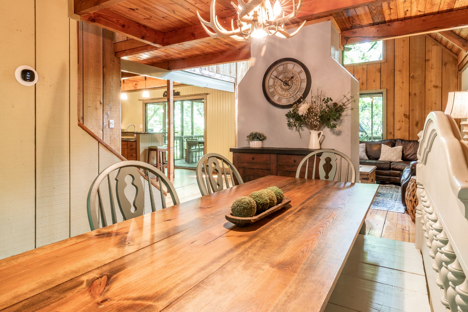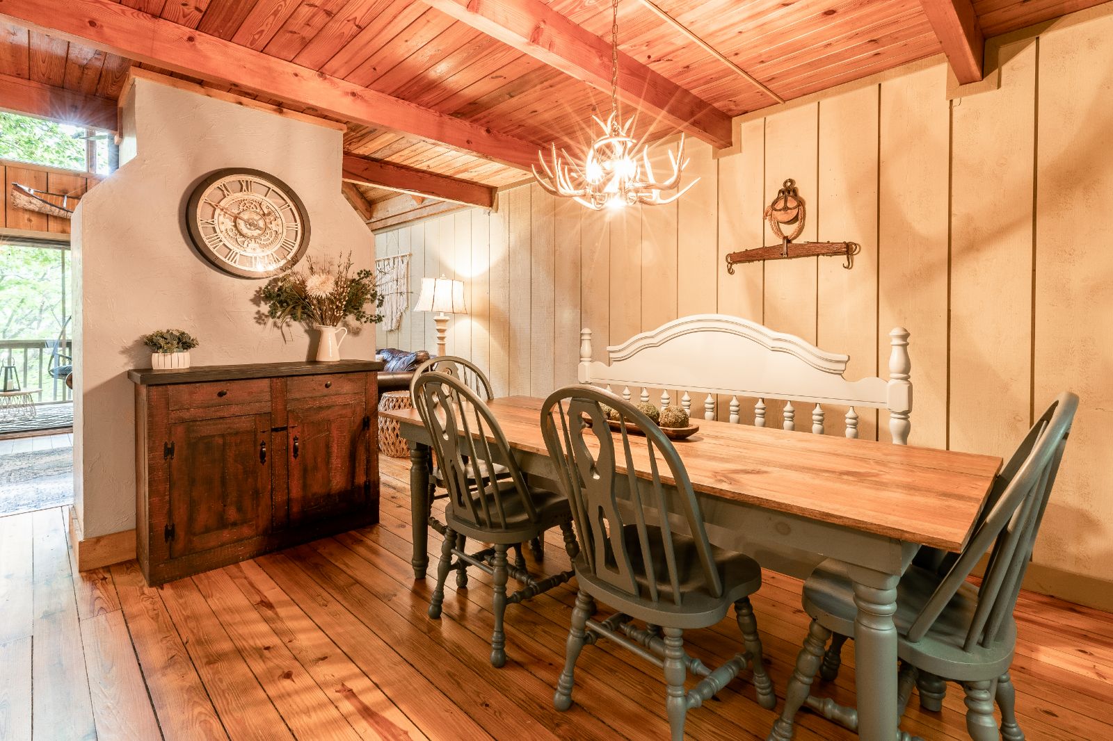 Just around the corner from the kitchen and living area is the mood-setting dining room at your North Georgia cabin rental that features a sprawling table with matching chairs and a custom bench. Set beneath an antler chandelier with exposed beams overhead, this space elevates every bite. There’s also a small buffet to keep refills and seconds close at hand.