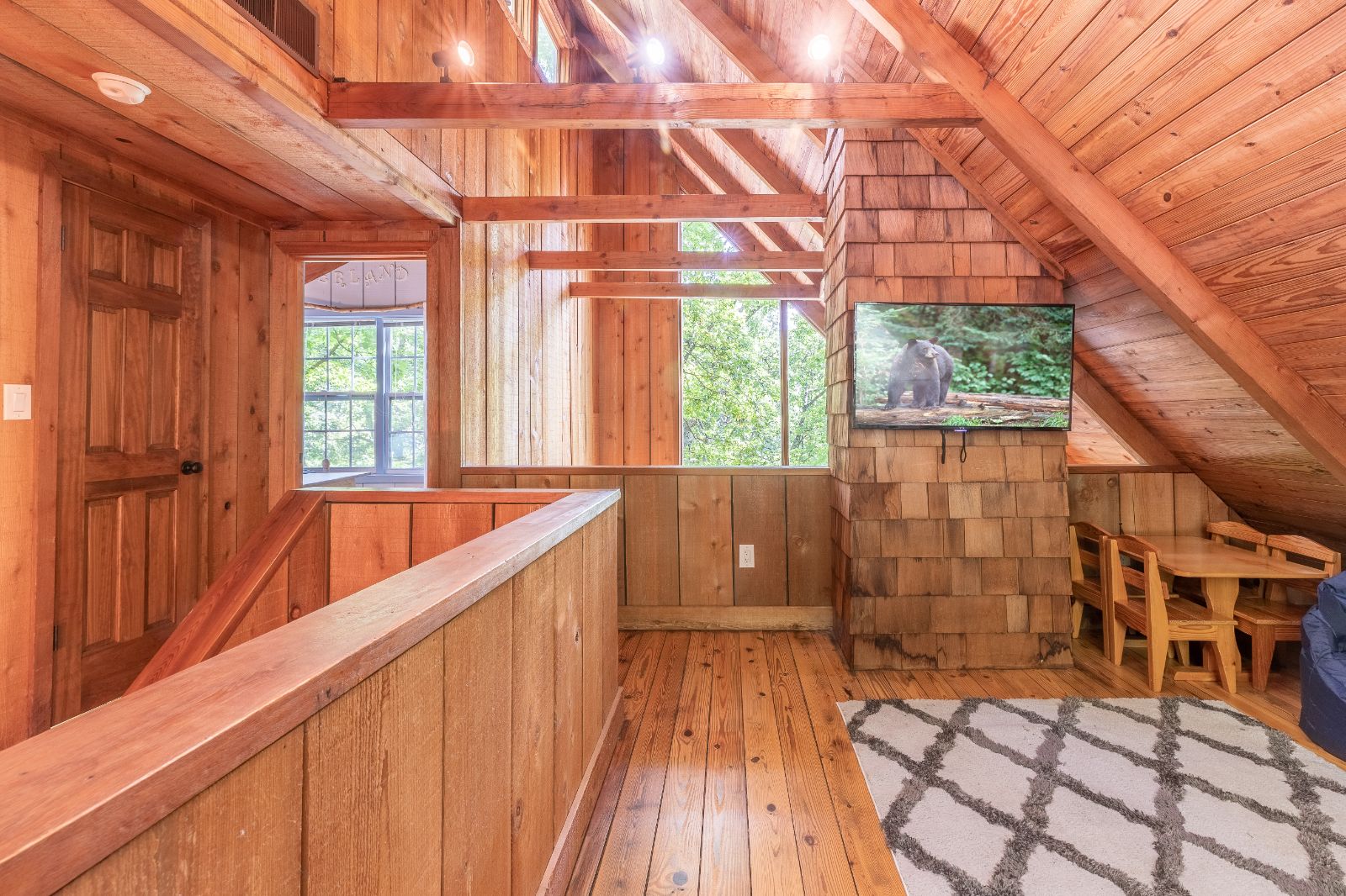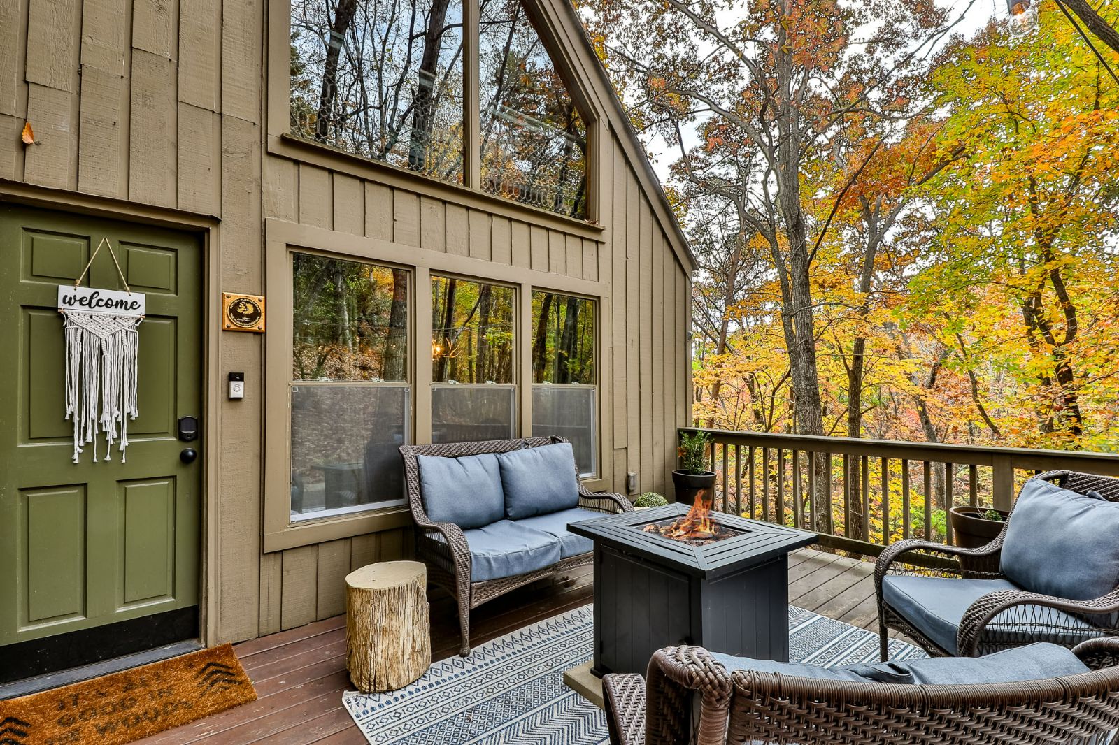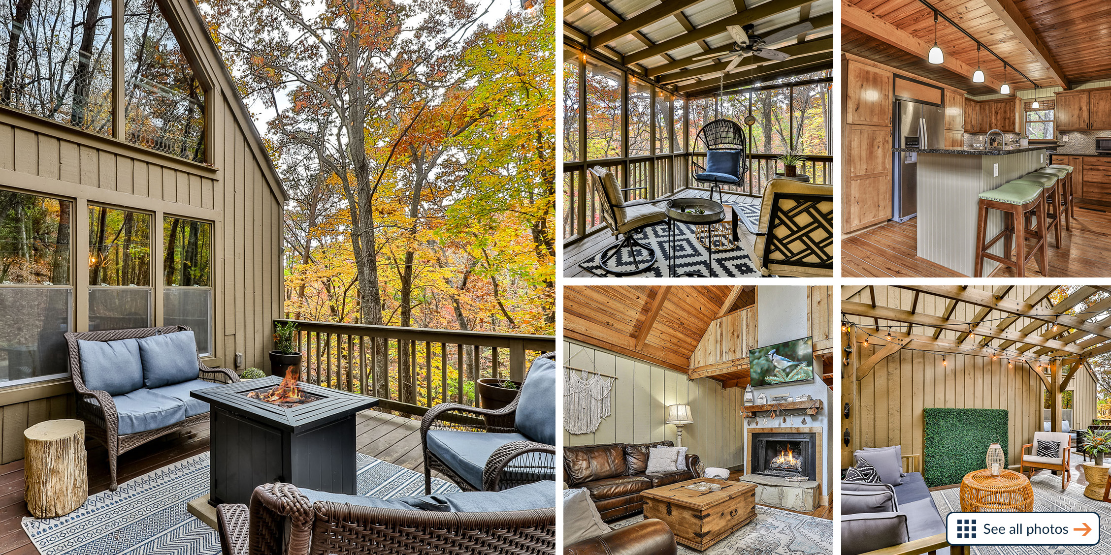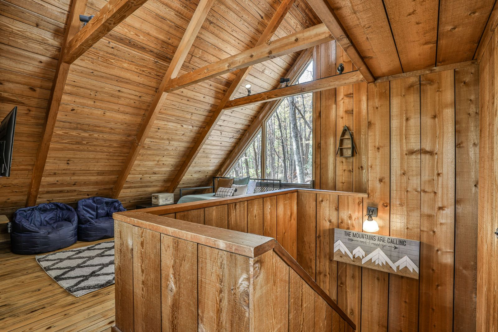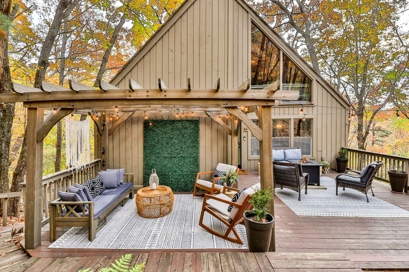 Open, spacious, and a lovely modern addition to the vacation home, the open deck boasts 2 sitting areas beneath hanging lights and a pergola. Rocking chairs add that classic Appalachian pull, and there’s a fire table for cozier mountain moments together, sipping North Georgia moonshine and chatting the night away. Wooded views surround the property, offering a new connection to nature, and seasonal mountain glimpses add to your winter stays.