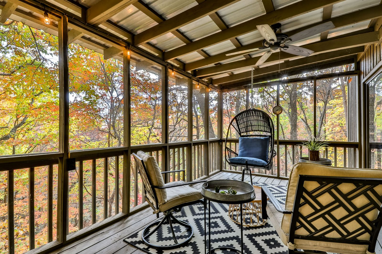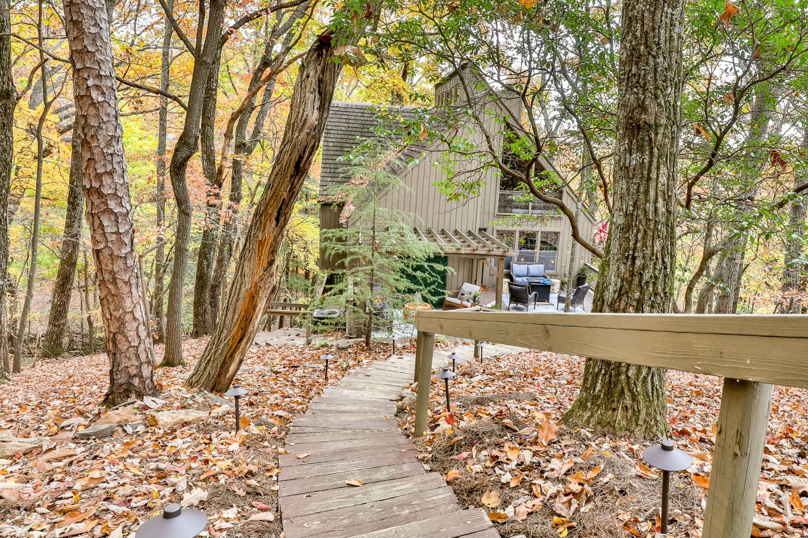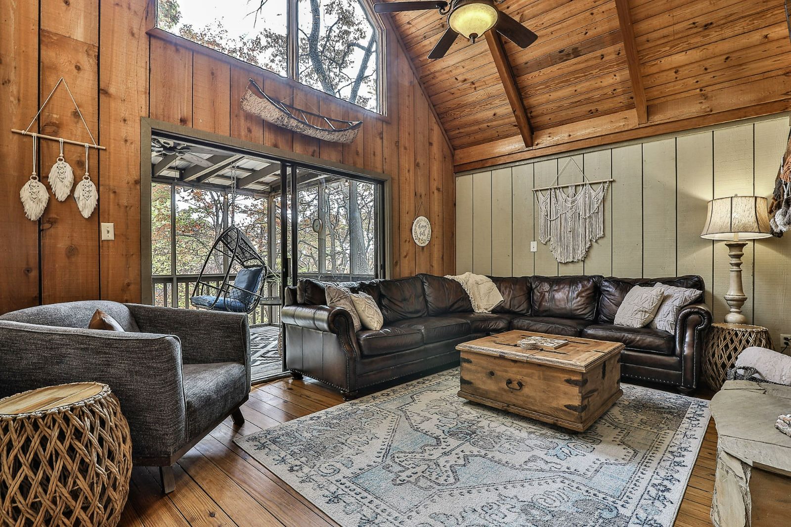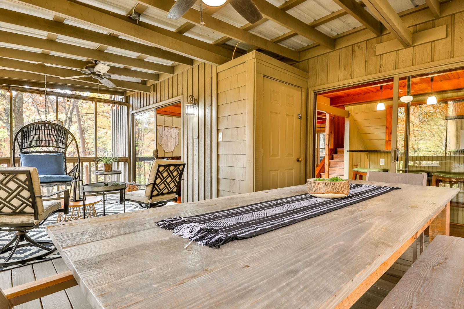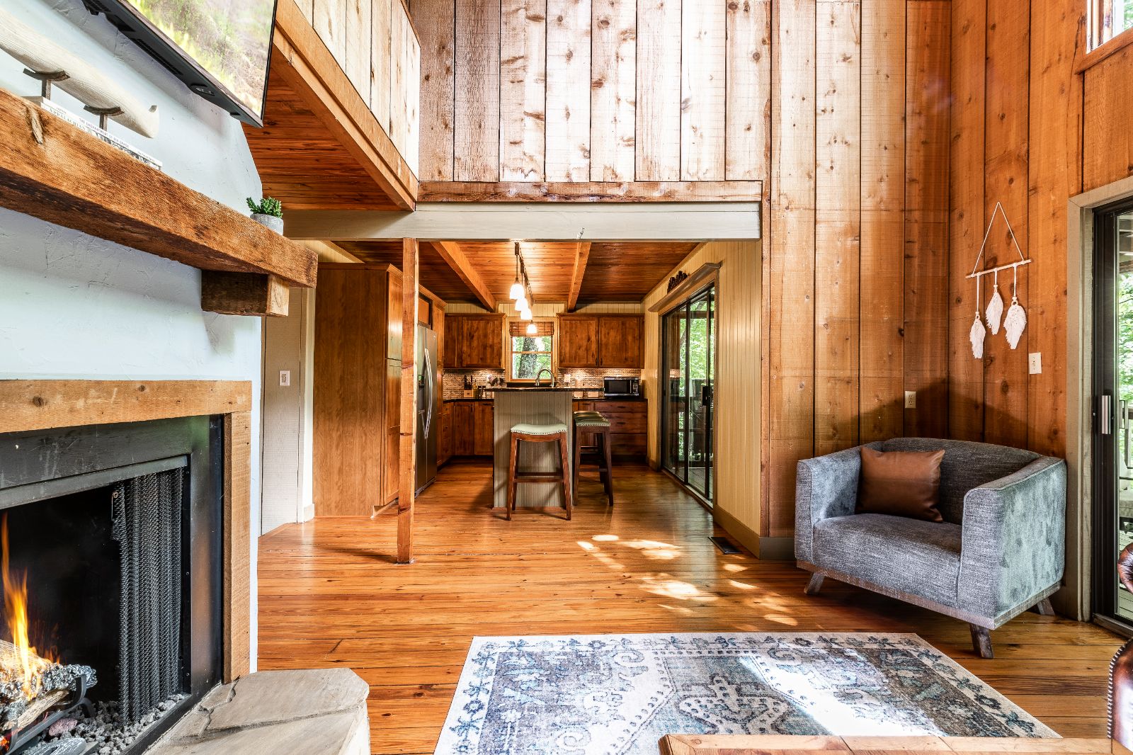 Open, spacious, and a lovely modern addition to the vacation home, the open deck boasts 2 sitting areas beneath hanging lights and a pergola. Rocking chairs add that classic Appalachian pull, and there’s a fire table for cozier mountain moments together, sipping North Georgia moonshine and chatting the night away. Wooded views surround the property, offering a new connection to nature, and seasonal mountain glimpses add to your winter stays.