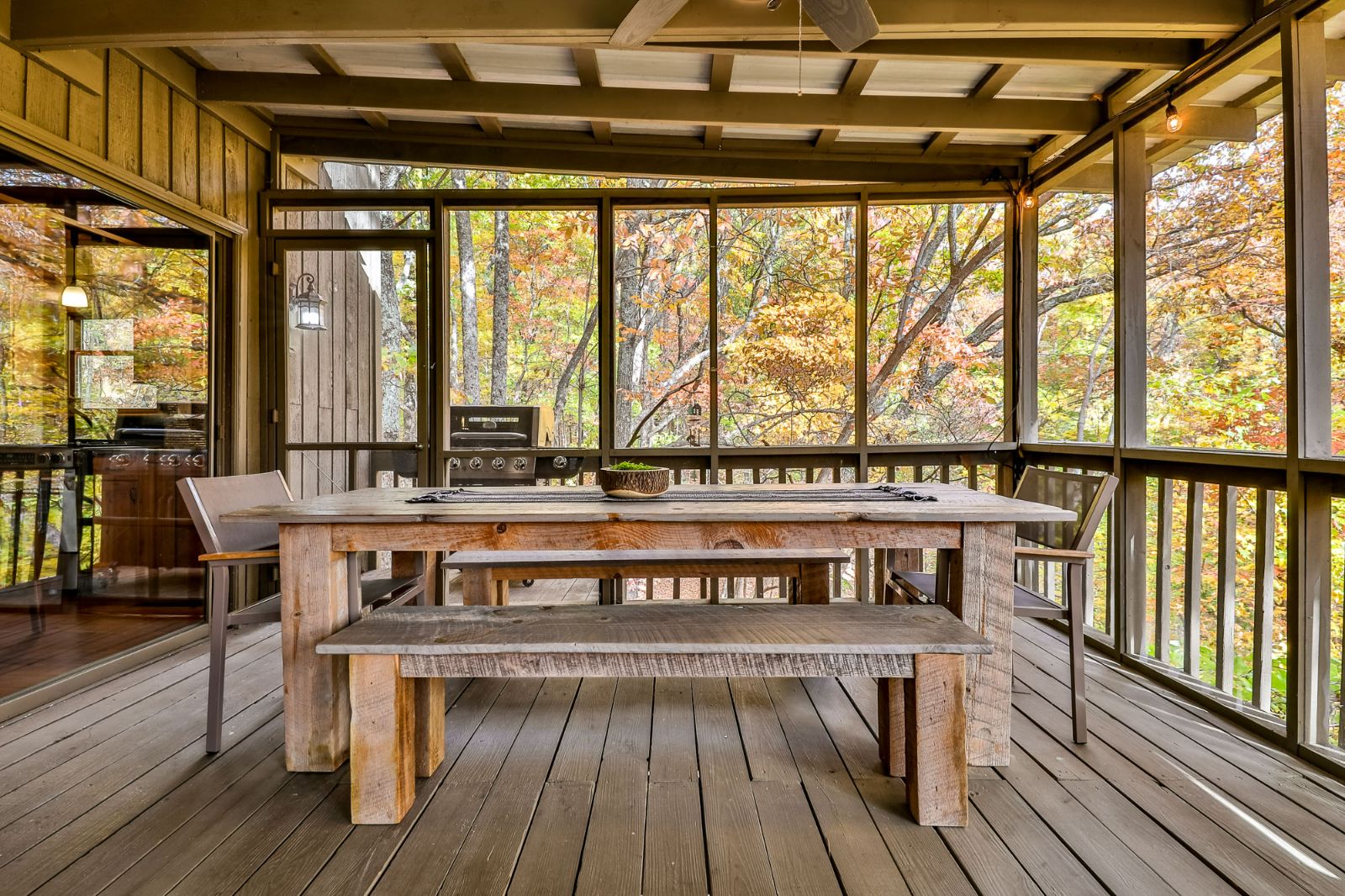 For more fun, switch on the big screen TV for movie nights with freshly popped popcorn from the full kitchen just steps away. Glass doors and a raised ceiling welcome tons of natural light and treetop vistas during the day, and you can easily step outside to the screened deck to enjoy the fresh mountain air morning, noon, or night.