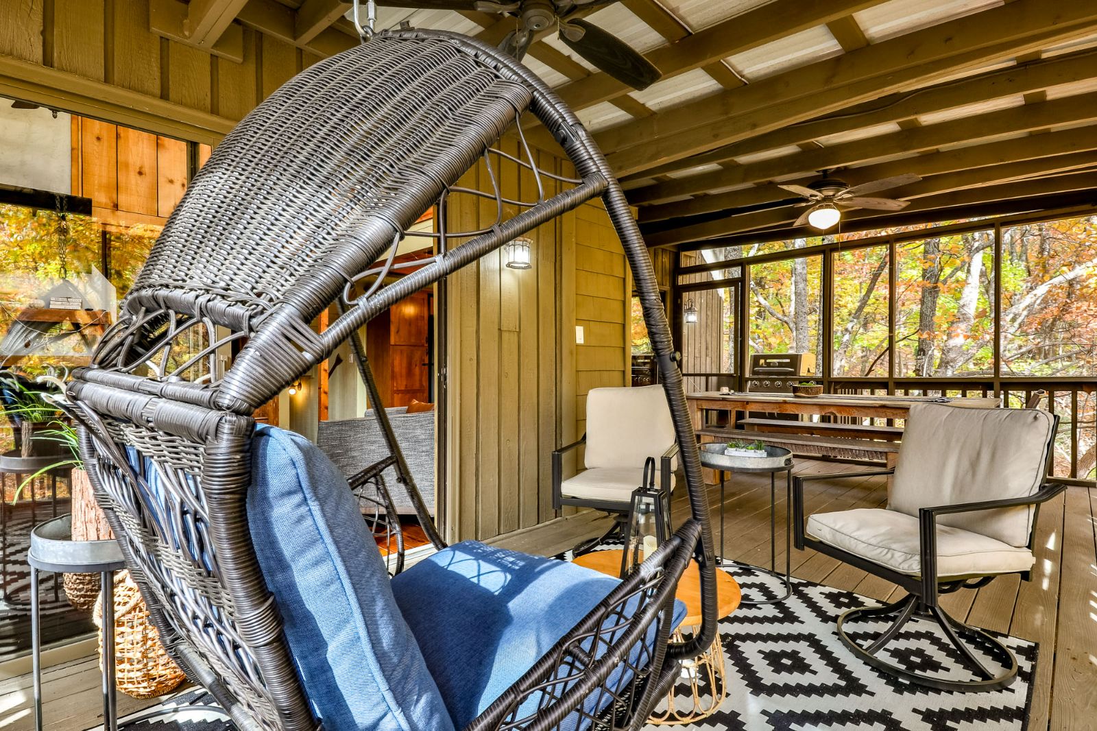For more space to spread out, there are 2 additional decks — both screened for added comfort in any season. Sway in the rockers with your morning coffee, cuddle with your partner on the porch swing, or unwind with your favorite book in the hanging chair. There’s even a separate area with a gas grill for fun cookouts and a foosball table for games!