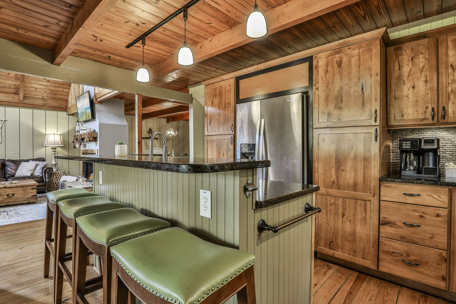 Hungy? Thirsty? Craving your favorite snack? The fully equipped kitchen at your Big Canoe vacation rental offers all the tools and appliances needed to whip up meals, treats, and beverages — including a dual coffeemaker for single cups and pots of joe! An island with a breakfast bar combines with the outdoor table just through the glass doors to the screened deck for indoor/outdoor meals on nice days.
