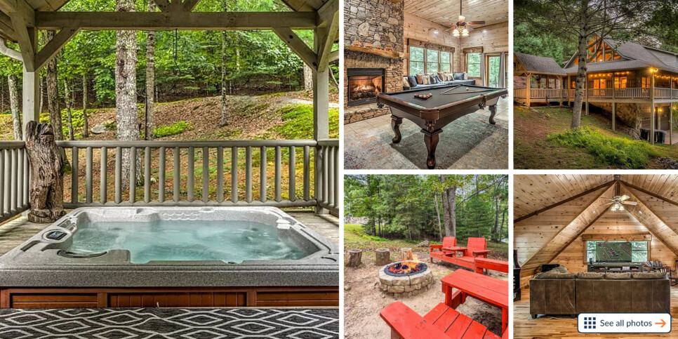 Explore the Aska Adventure Area trails, catch-and-release pond, and mini golf course in The Lily Pad Village just minutes from Kick Aska Lodge — where you can soothe tired muscles in a bubbling hot tub, host epic game nights with friends, and sip wine by a cozy fireplace. Pet friendly and inviting for large groups, this beautiful Blue Ridge Mountain lodge offers a wonderful place to stay for your memorable getaway in North Georgia.
