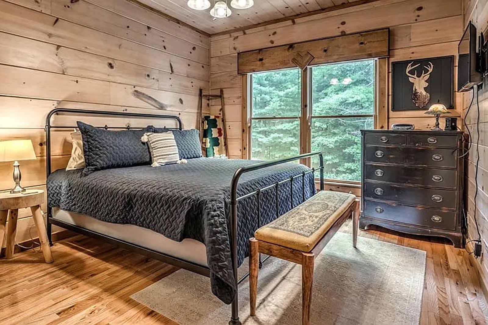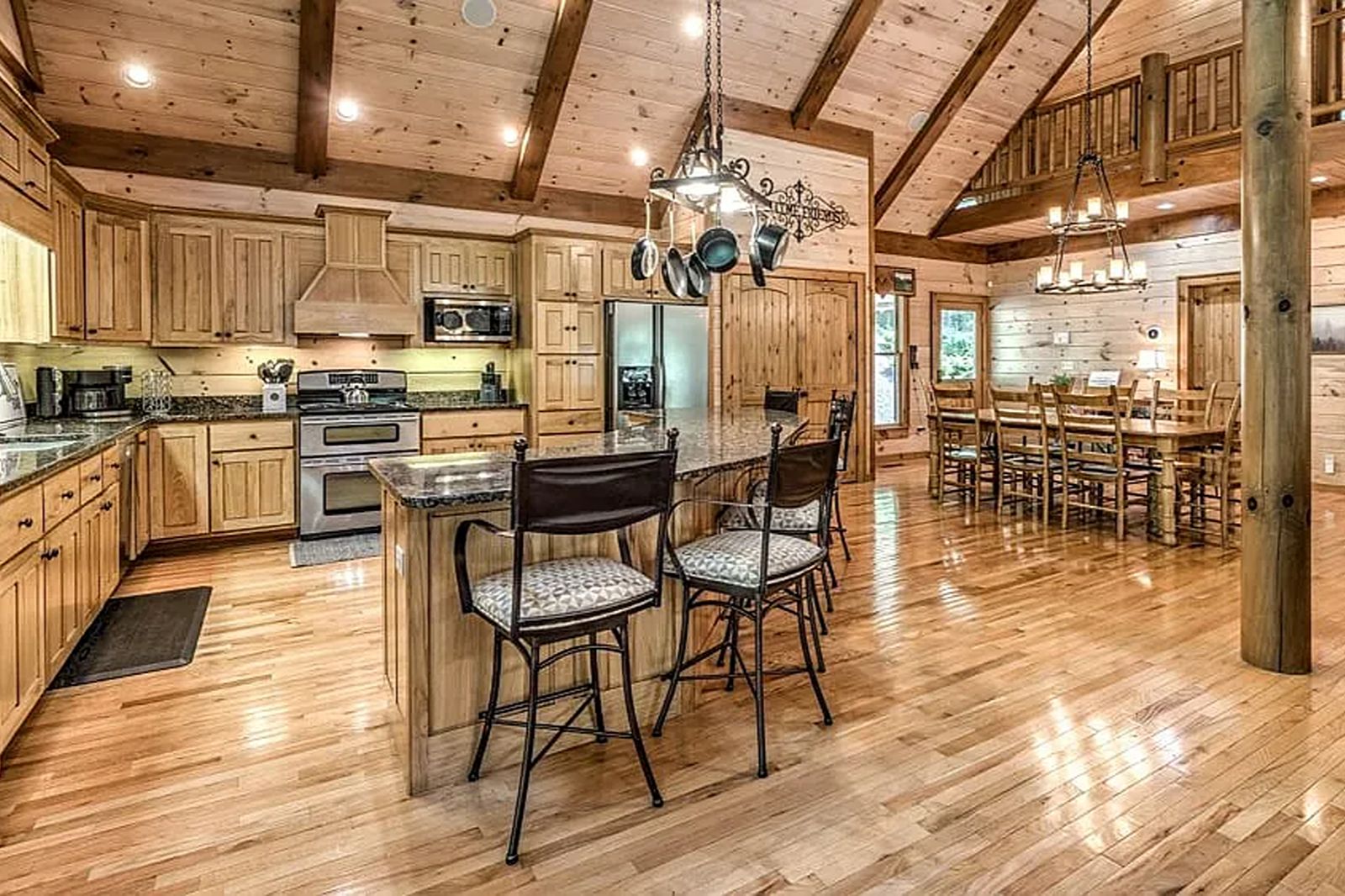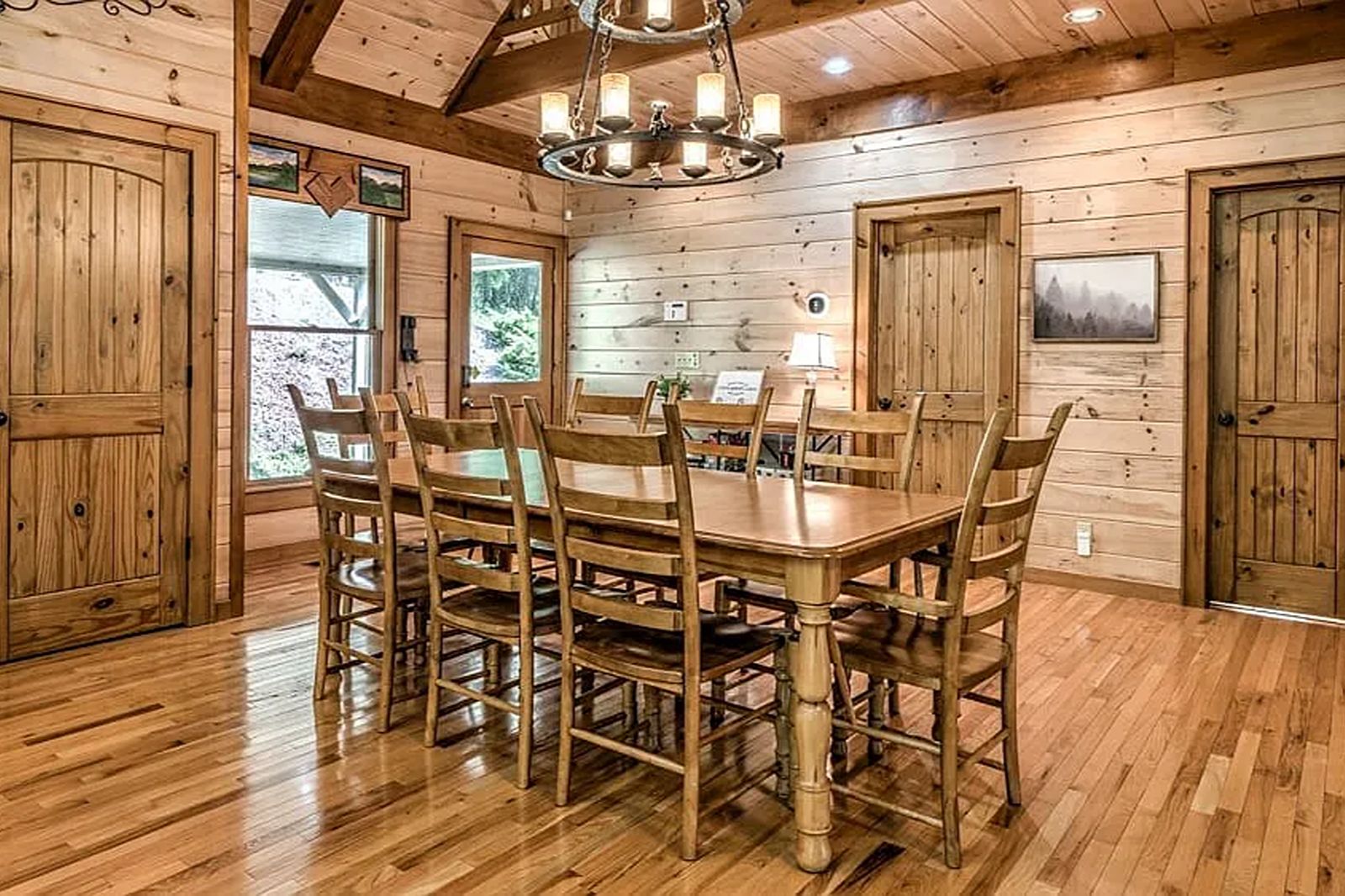 A big screen TV and DVD player welcome movie nights, while the dining table offers additional space to spread out card or board games for even more fun together. Between in-cabin entertainment, downtown shopping sprees, and fishing in the national forest, you’ll appreciate rest and relaxation in a mix of 4 king beds and 2 queen beds with trundles at this 5,000-square-foot, 4-bedroom vacation rental for up to 14 guests.