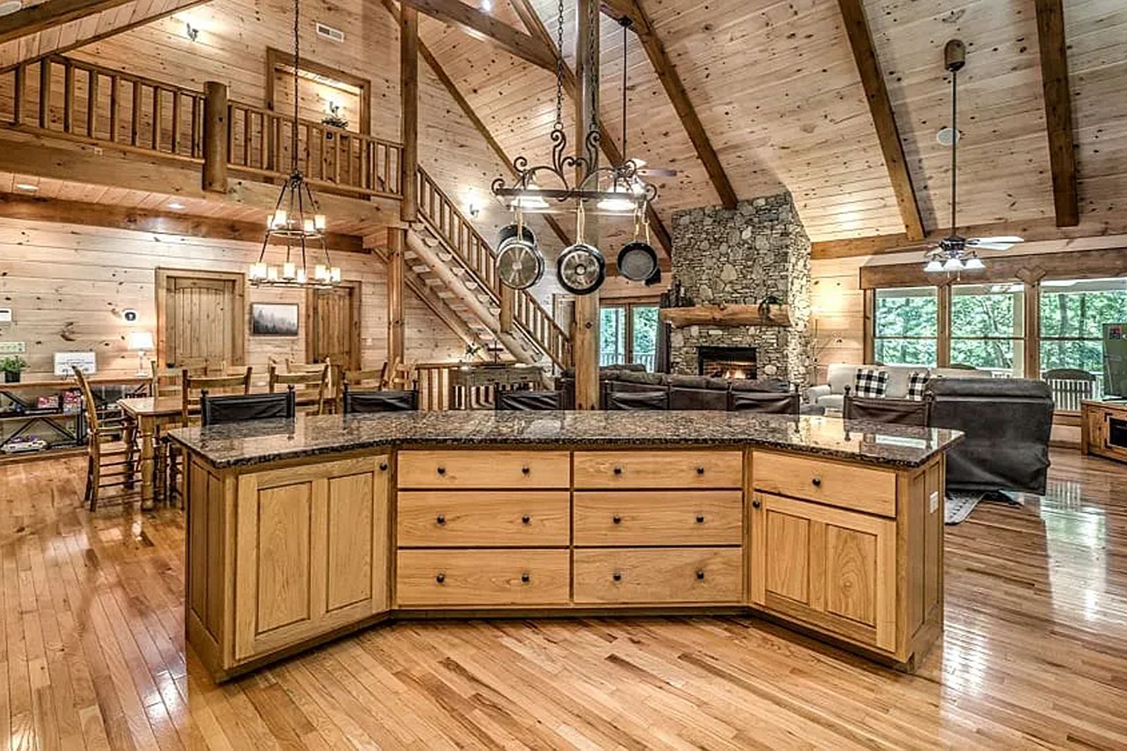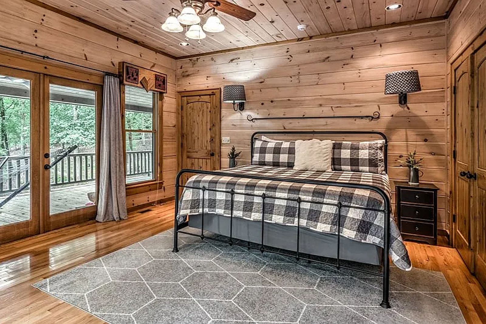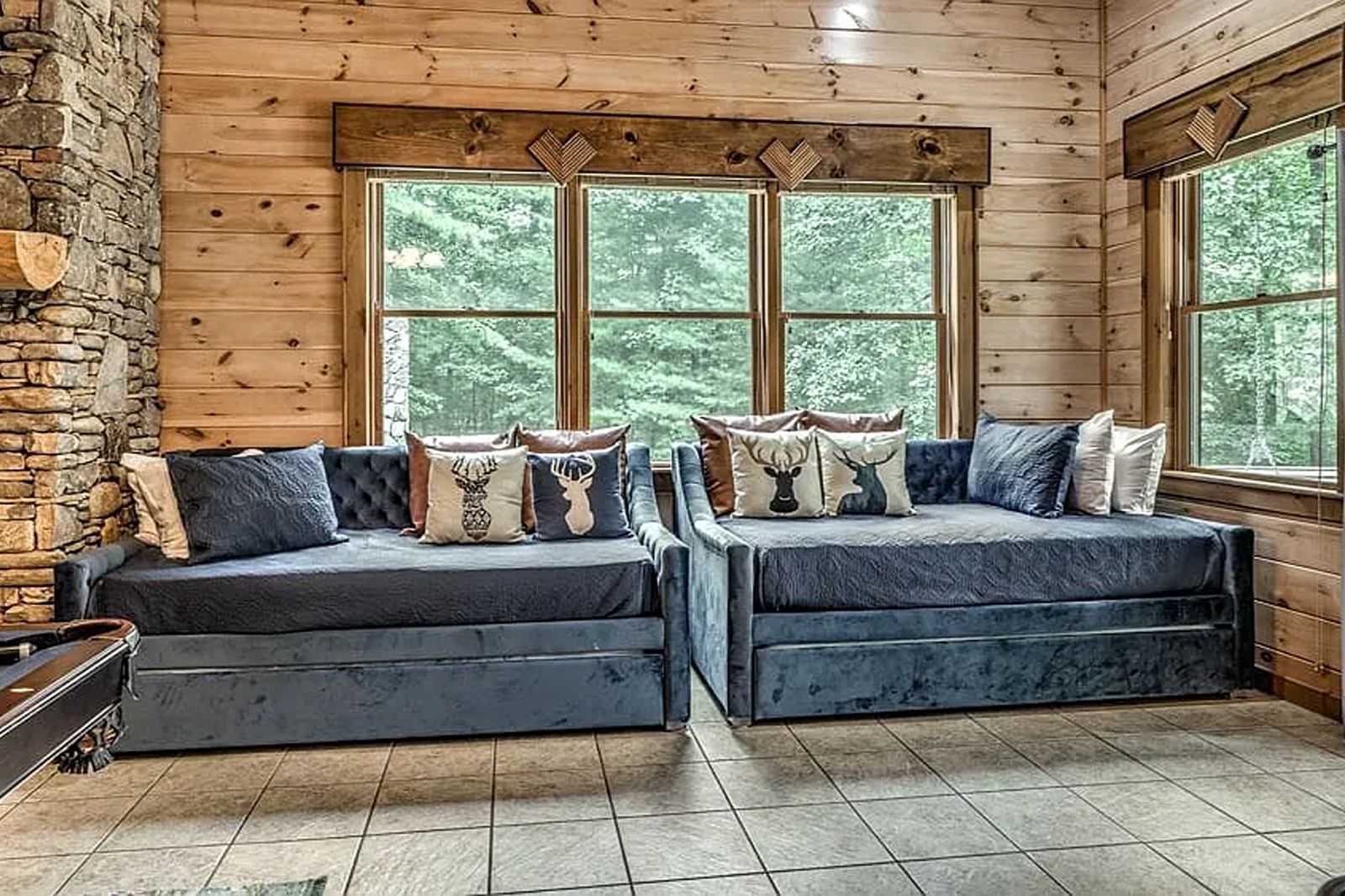 A big screen TV and DVD player welcome movie nights, while the dining table offers additional space to spread out card or board games for even more fun together. Between in-cabin entertainment, downtown shopping sprees, and fishing in the national forest, you’ll appreciate rest and relaxation in a mix of 4 king beds and 2 queen beds with trundles at this 5,000-square-foot, 4-bedroom vacation rental for up to 14 guests.