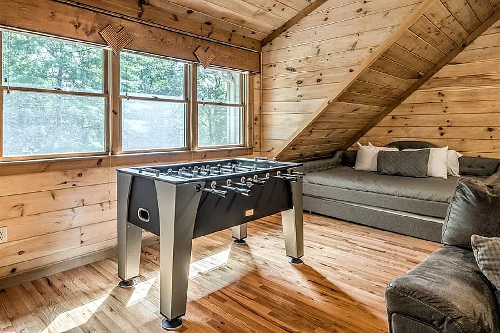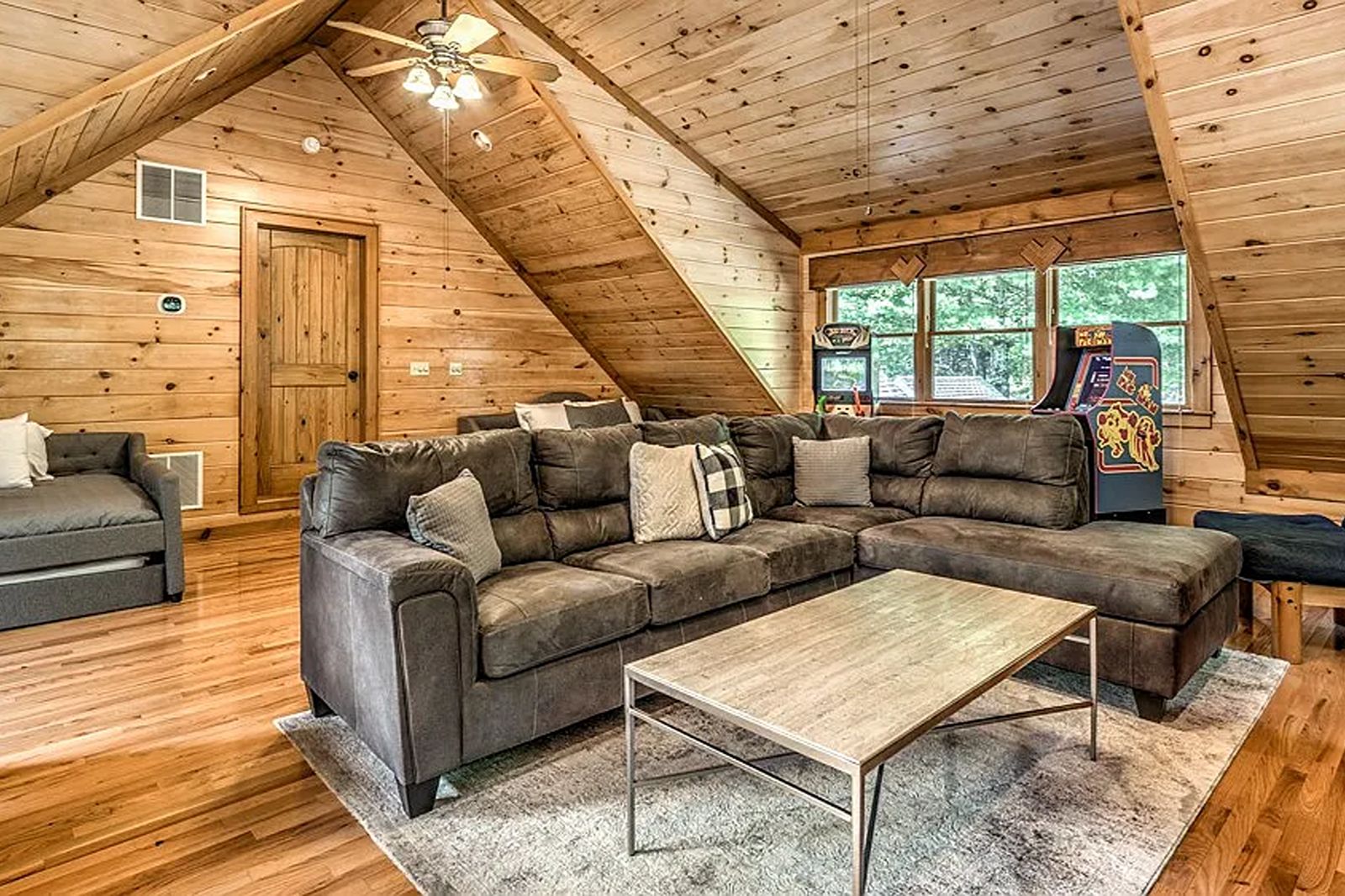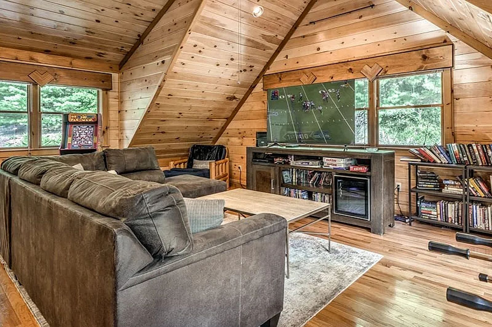 Tucked among towering trees, this secluded cabin has everything you need to prepare meals, hang out, and reconnect with loved ones. Start mornings with freshly brewed coffee from the full kitchen before stepping onto the main deck to inhale that crisp mountain air. An outdoor TV, hammock, sofa, and fire table beckon downtime outside. You can even light the grill for a barbecue while the kids play cornhole before heading back inside for rounds of pool, foosball, and arcade classics in the game room!
