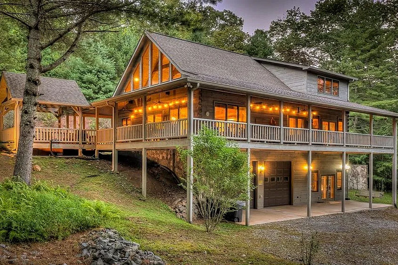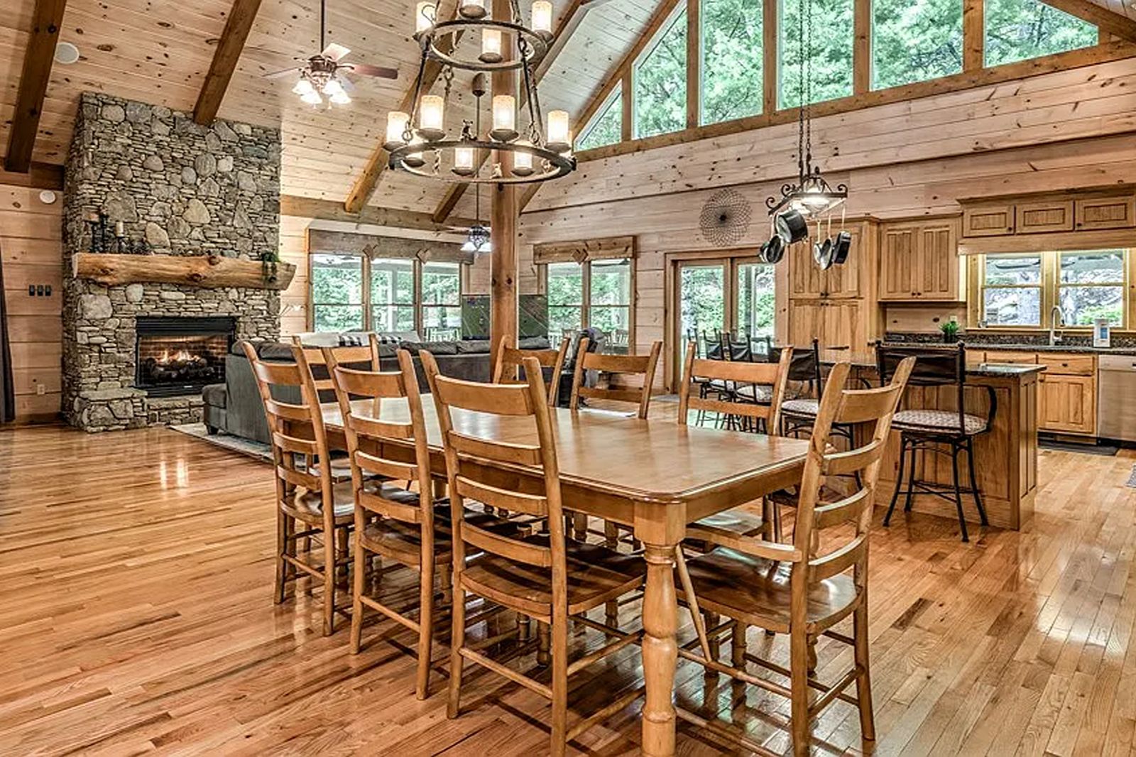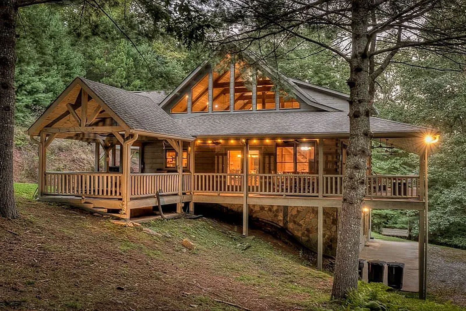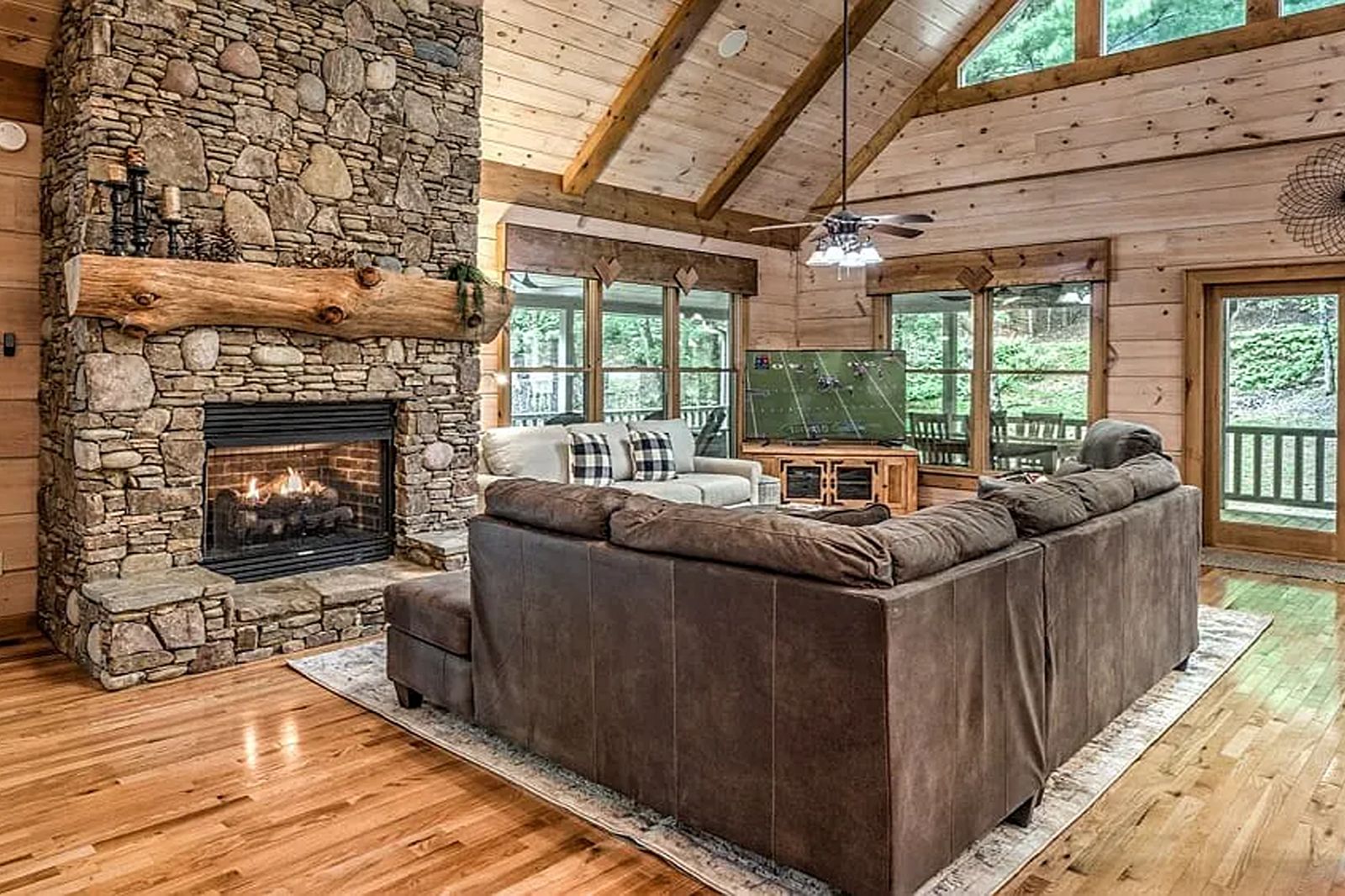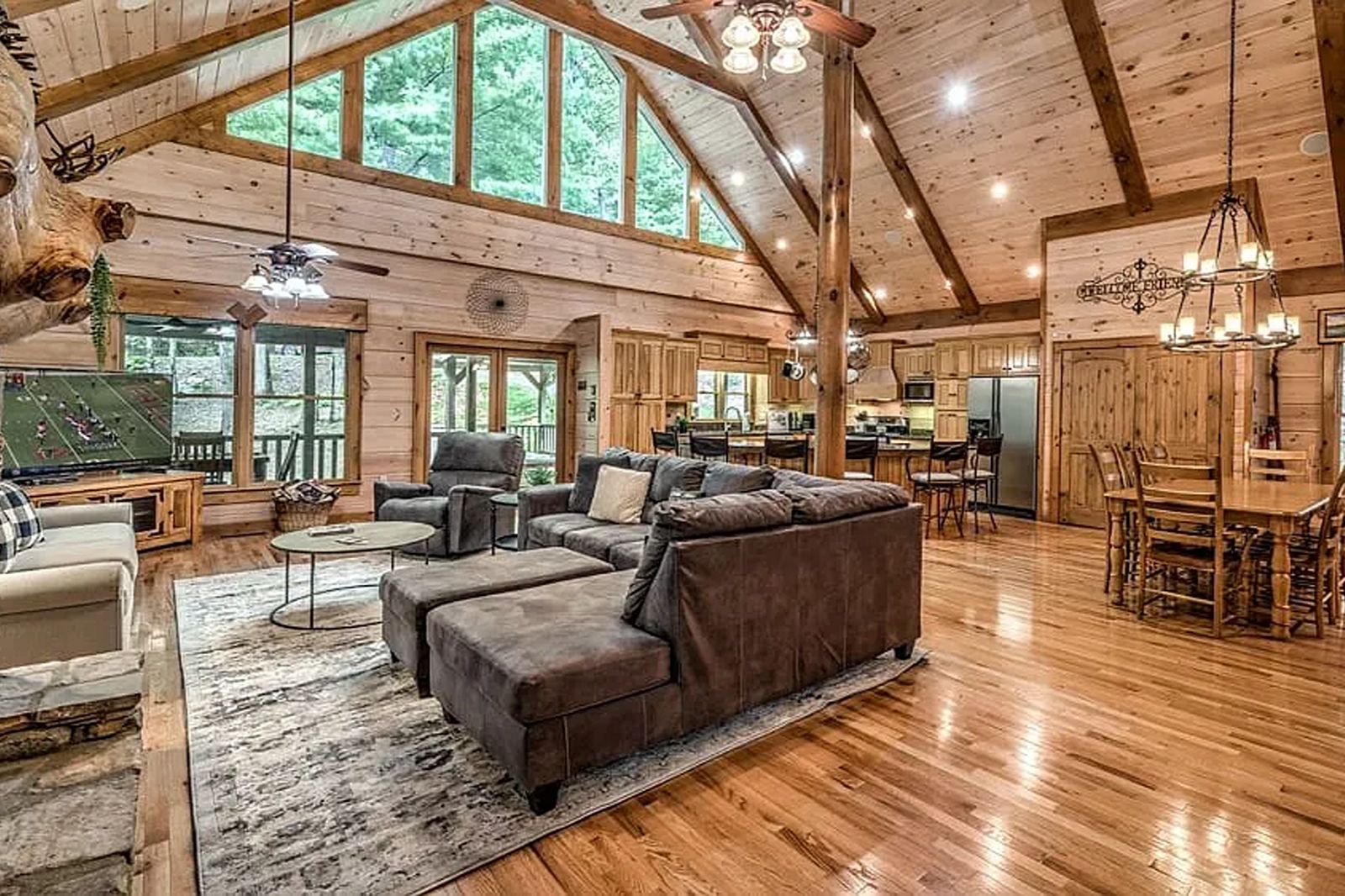 Explore the Aska Adventure Area trails, catch-and-release pond, and mini golf course in The Lily Pad Village just minutes from Kick Aska Lodge — where you can soothe tired muscles in a bubbling hot tub, host epic game nights with friends, and sip wine by a cozy fireplace. Pet friendly and inviting for large groups, this beautiful Blue Ridge Mountain lodge offers a wonderful place to stay for your memorable getaway in North Georgia.