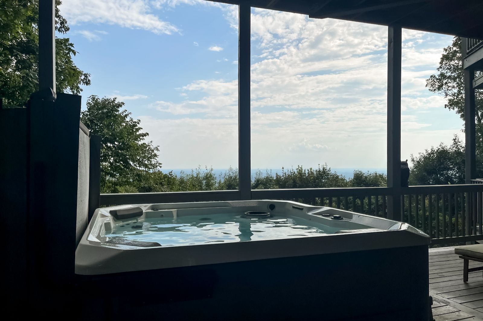 Upstairs, the primary suite features a king-size bed, an alcove with a built-in bench, a chair and mounted TV, a private balcony with chairs overlooking the Blue Ridge Mountain vistas, plus an en-suite bathroom — with skylights, an indoor jetted bathtub, 2 separate vanities, and a large walk-in shower! The second bedroom here has a queen-size bed, skylight, and private bathroom with a shower/tub combo.