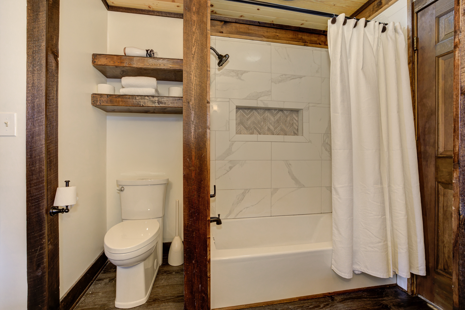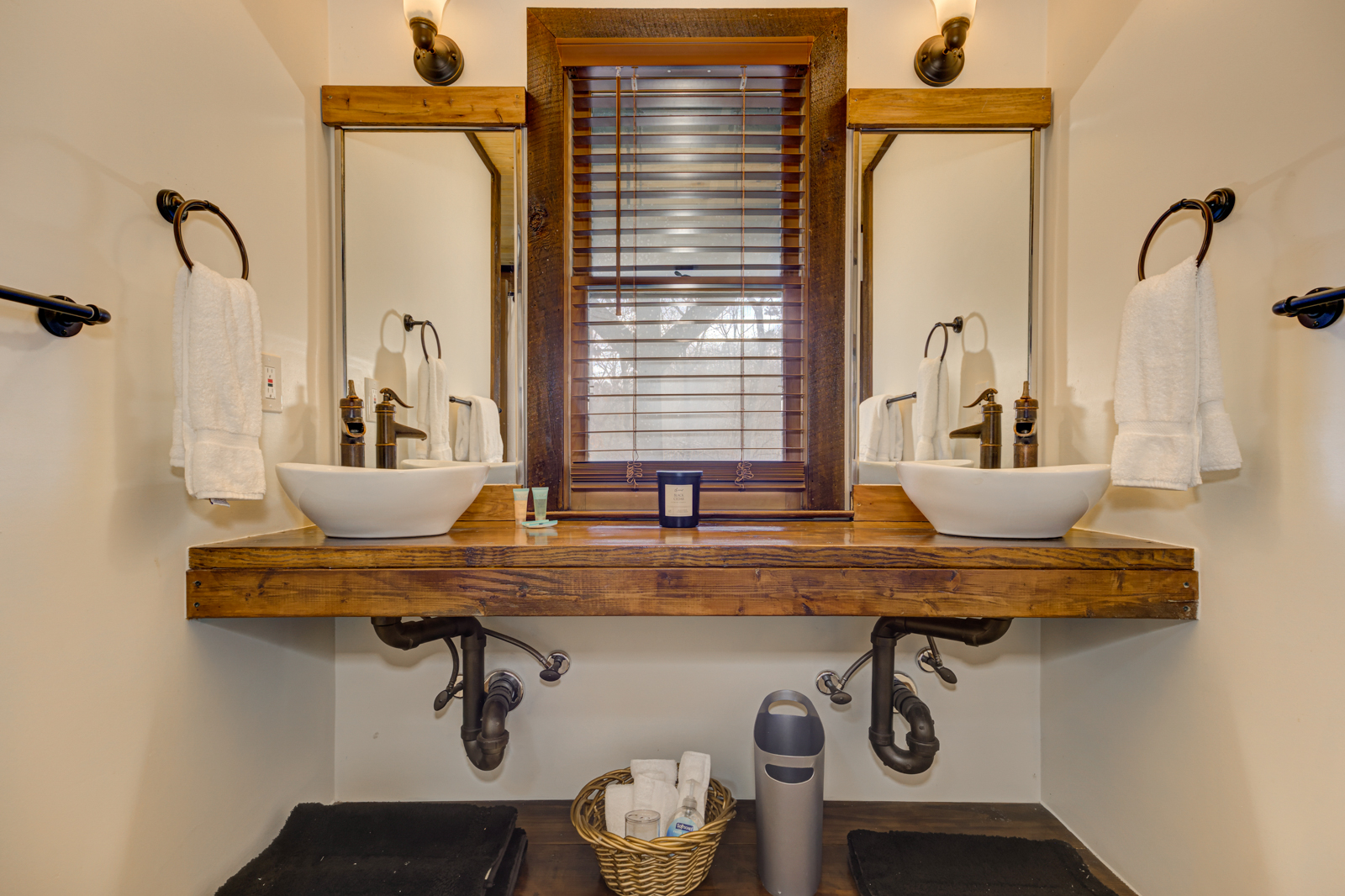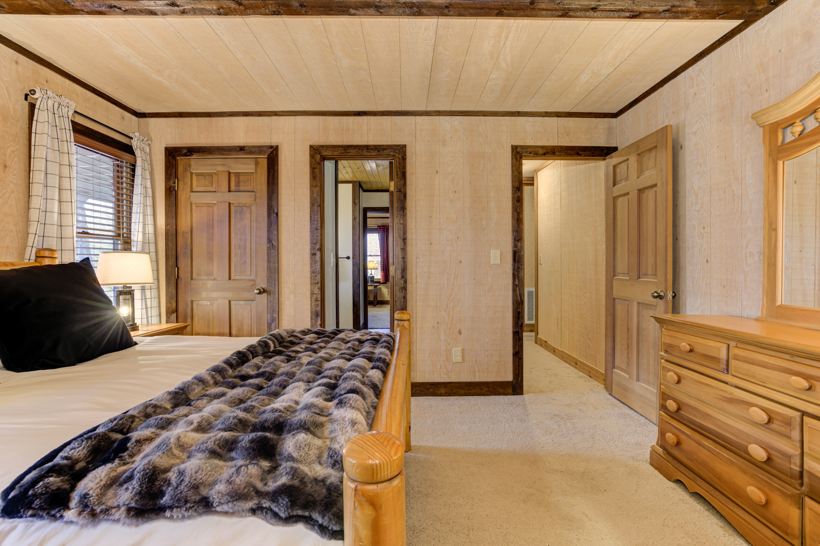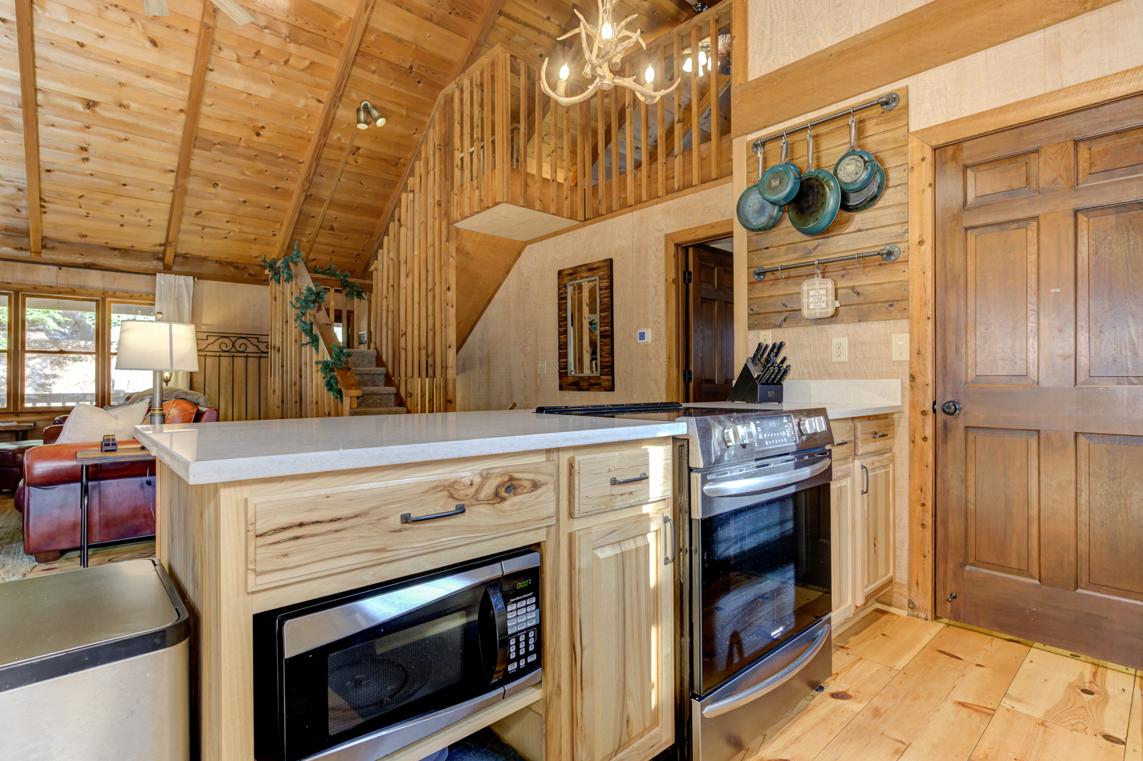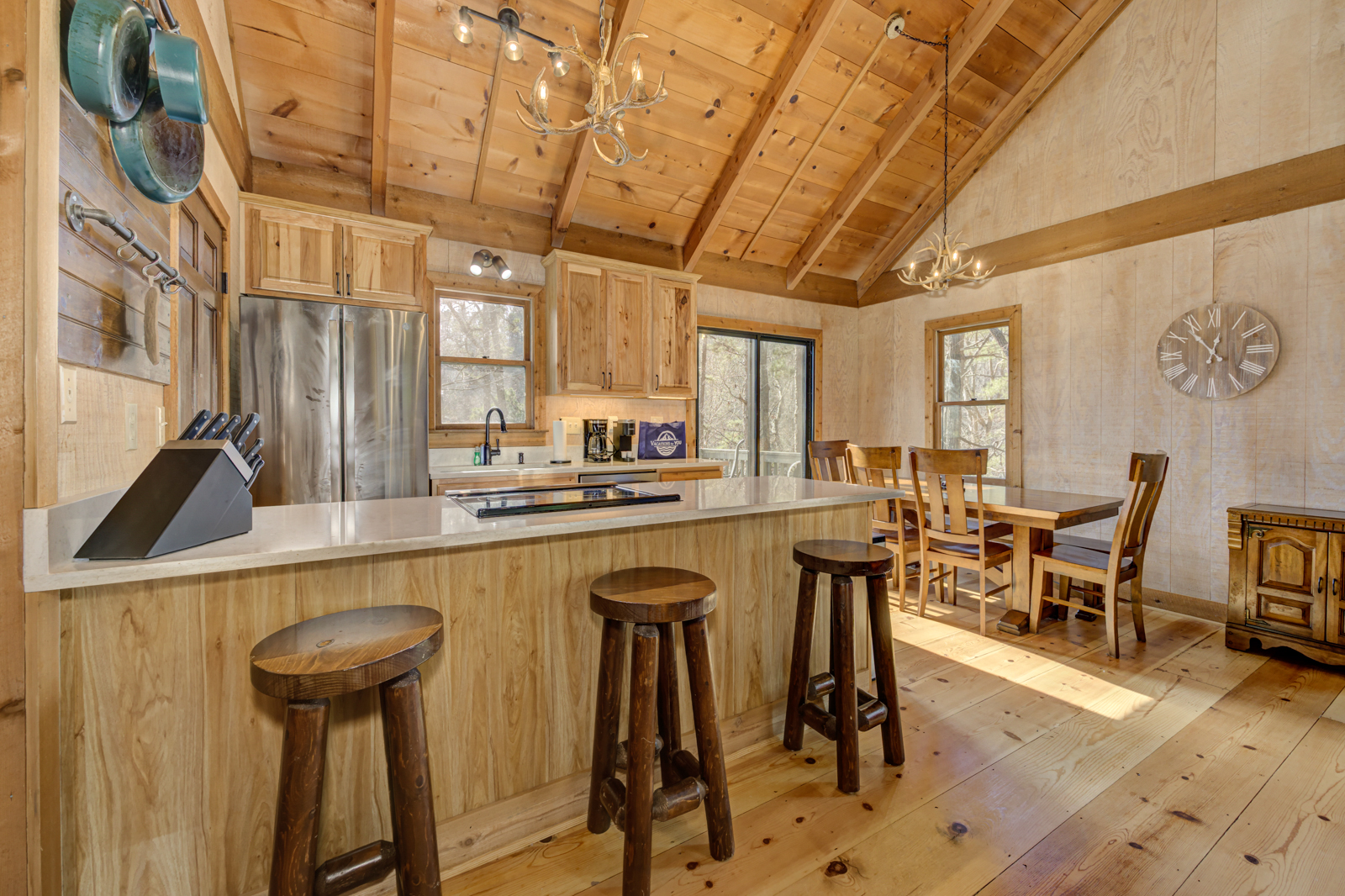 There’s even a breakfast bar beneath an antler chandelier, hanging pans for the country experience, and a window overlooking the trees above the sunken sink. You can grab a quick bite, reheat food, plan delectable meals with the whole family, and chill wine. And yes, there’s a dishwasher to make clean-ups a breeze.