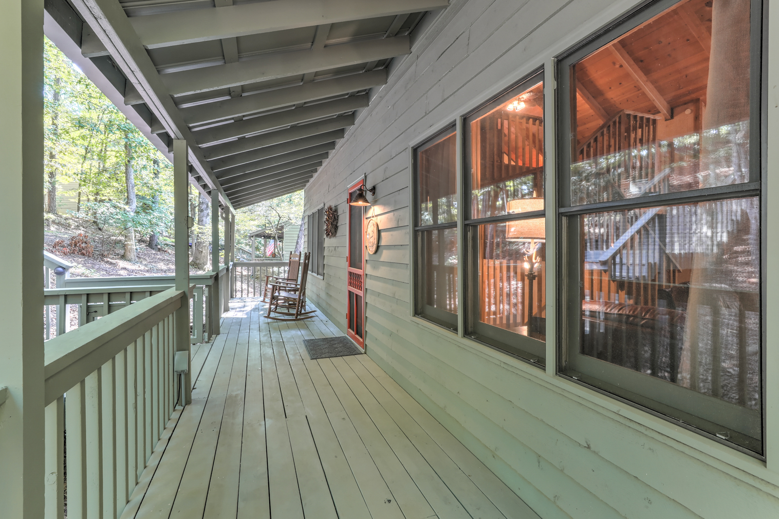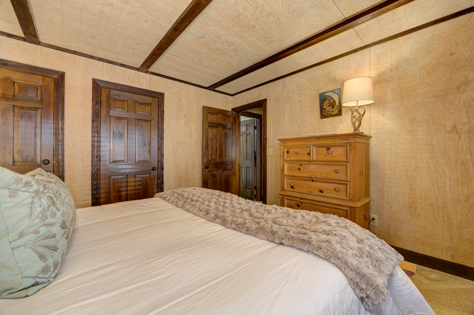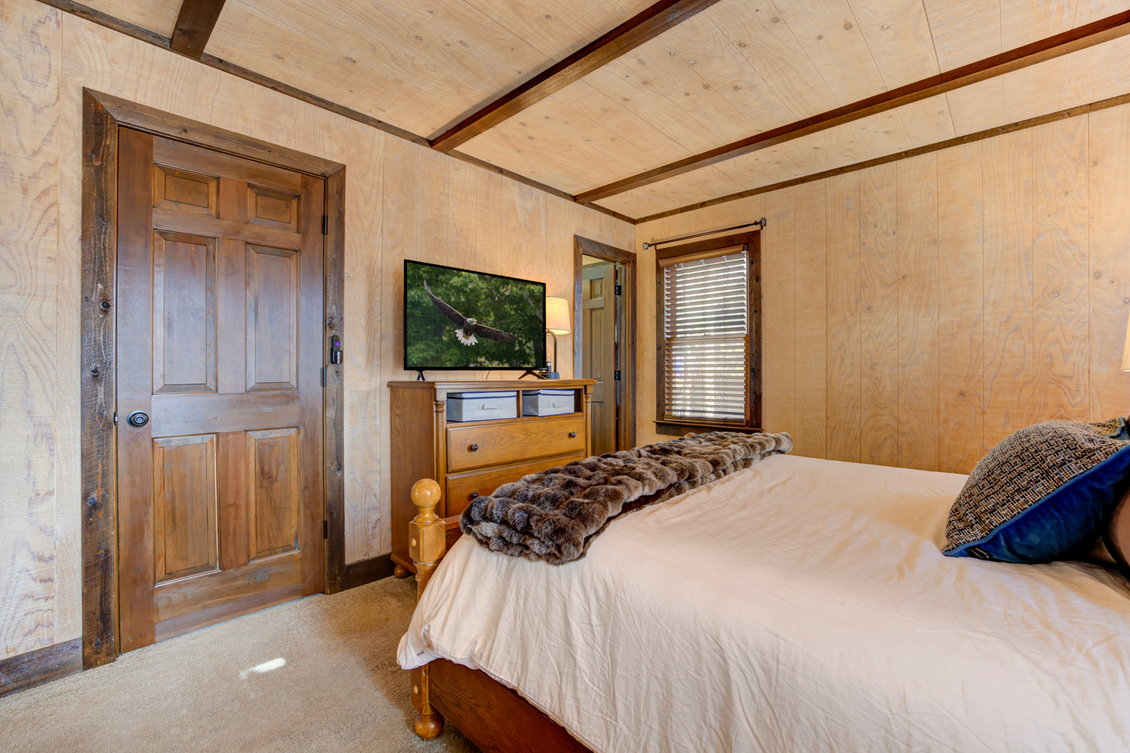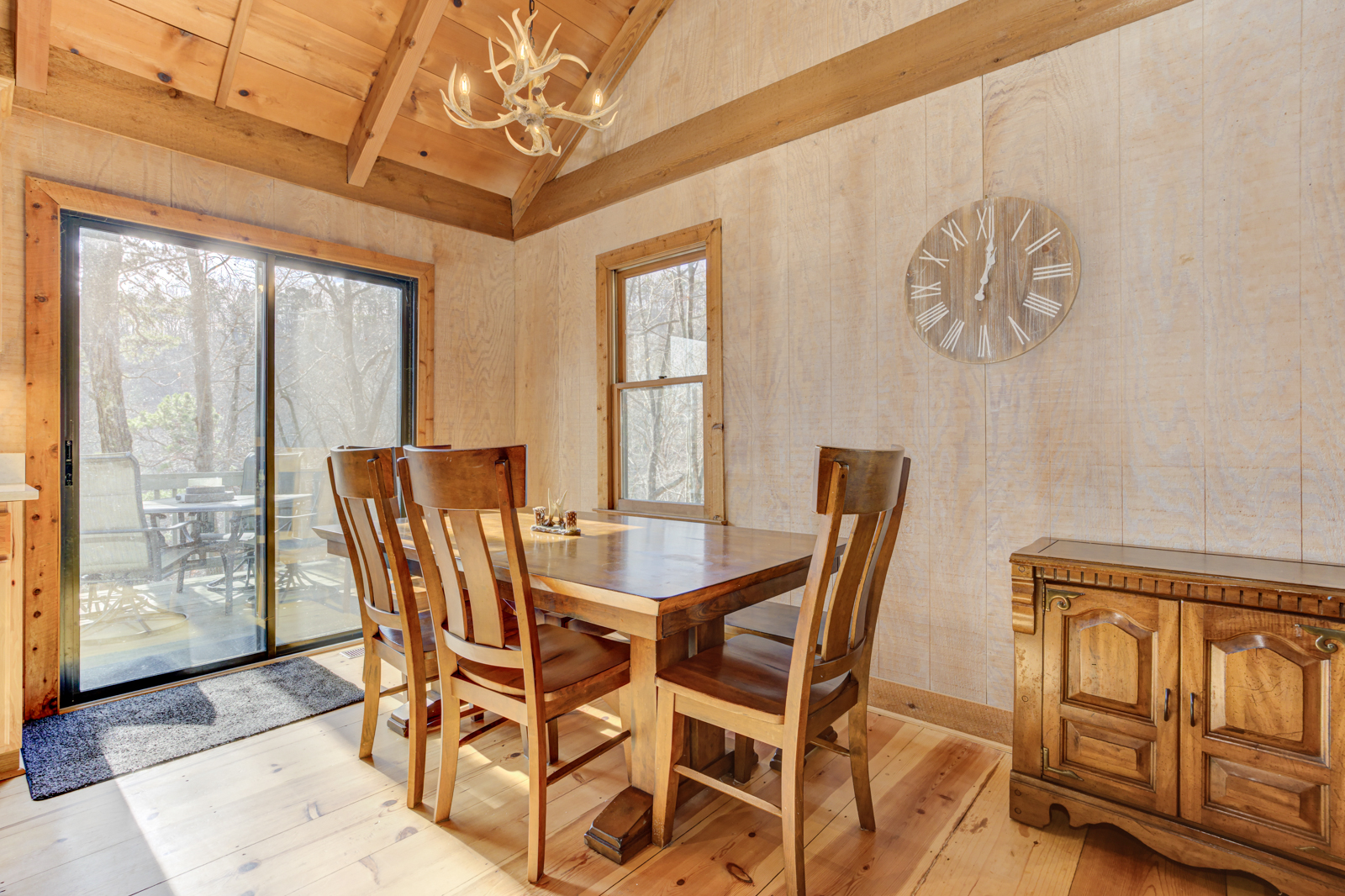 Just off the kitchen space at your Big Canoe vacation rental is the charming dining area set beneath another antler chandelier. The table is large and spacious, with chairs and a matching bench so everyone can scoot in for mealtimes together. Plus, you’ll have additional seating at the breakfast bar. Glass doors offer views of the treetops while you dine, make arts and crafts, or play board games on your North Georgia getaway.
